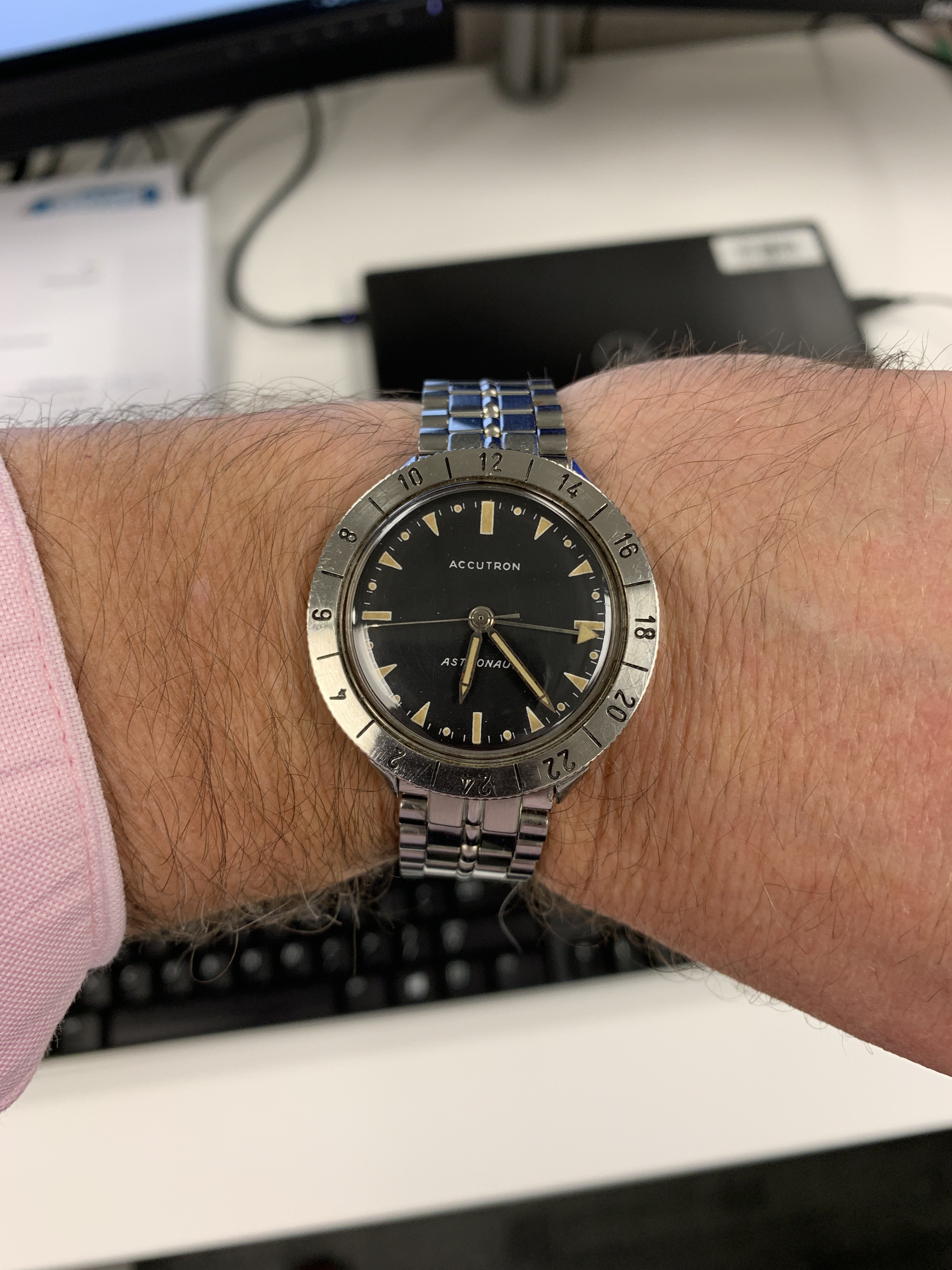 One of two today. Serviced, and testing on the wrist. Probably on the way back to it’s owner in the next day or so. Anyone here recognize it? One OB habituè most certainly will! Interesting problem with this one. It had been serviced previously (not by me), and whoever serviced it, misplaced one tiny plate screw. That screw was replaced with a mismatching screw. The watch came to me with both regulators on the fast side as far as they would go, but the watch was losing two minutes a day! I figured servicing it might solve the problem. It did, sort of. After cleaning the tuning fork, what do I find but the missing screw stuck to one cone-shaped magnet on one tine of the tuning fork! Little wonder it was losing! As soon as it is running within 60 seconds per month, it goes back to the owner. Privacy honored.