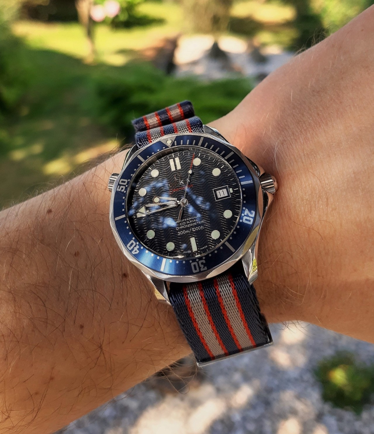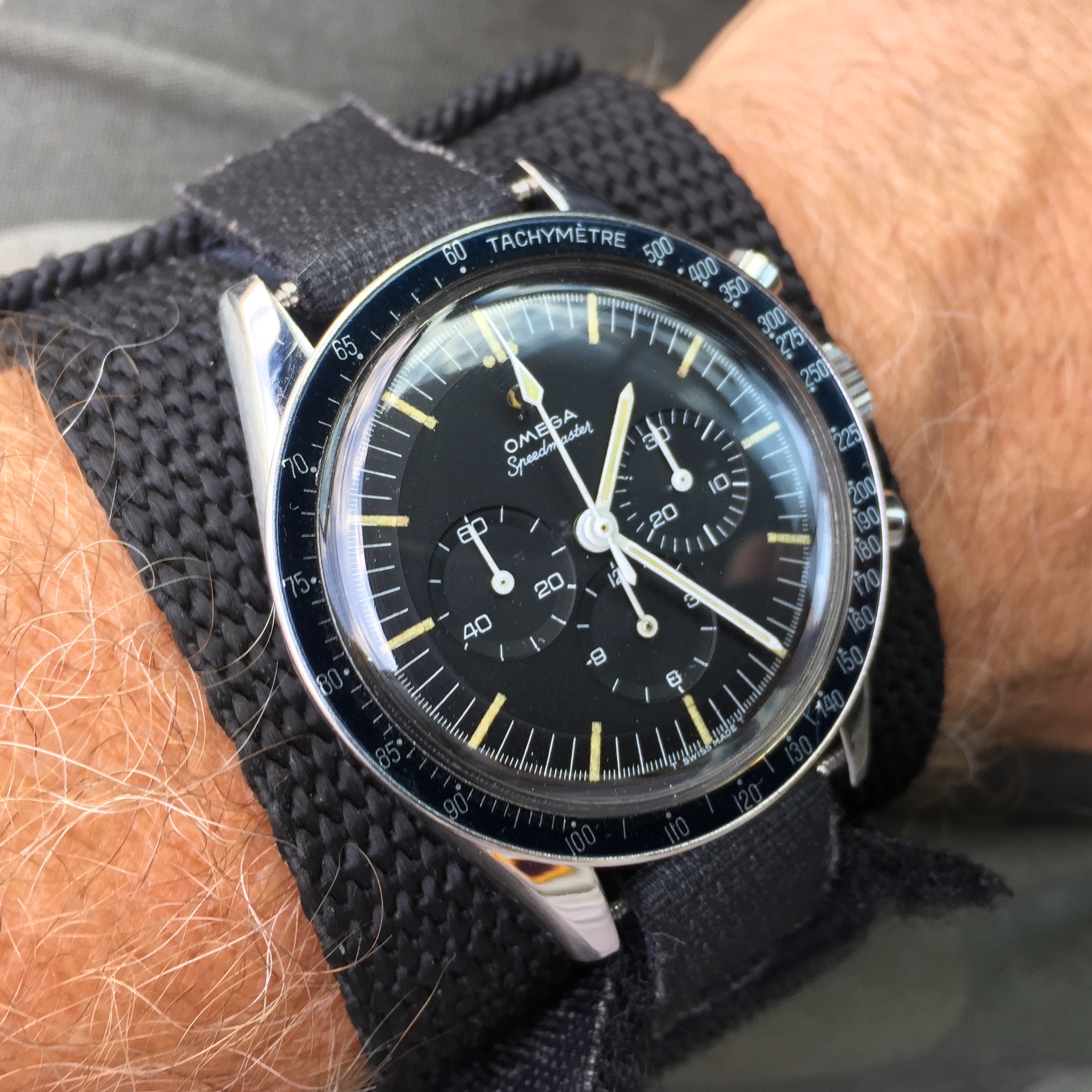 Double dipping on Speedy Tuesday which involved a command decision to wear my birthyear 1964 Echo Whiskey to the gym...which called for a strap change from the Omega black coated nylon NATO to the venerable Raine Inc. protective strap [see below]...