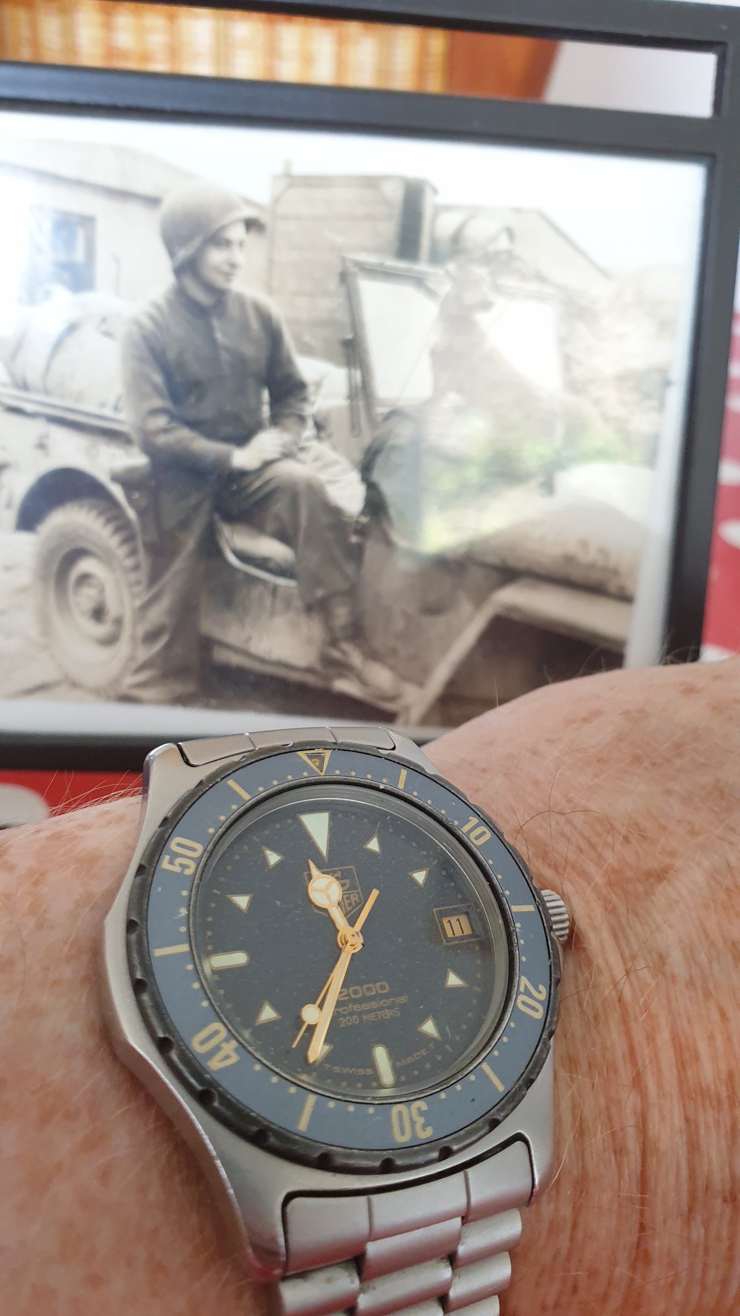 ·Very special piece today. This TAG-Heuer was the first watch my father gave me, a birthday gift when I was 15. I never knew this about him until after he passed (in 2009), but apparently he was very interested in watches, and used to frequently buy them as gifts for friends and colleagues. That's him in the background, 2nd Armored Division, Combat Command B, taken during their drive across France, Belgium and Germany as "the tip of the spear."