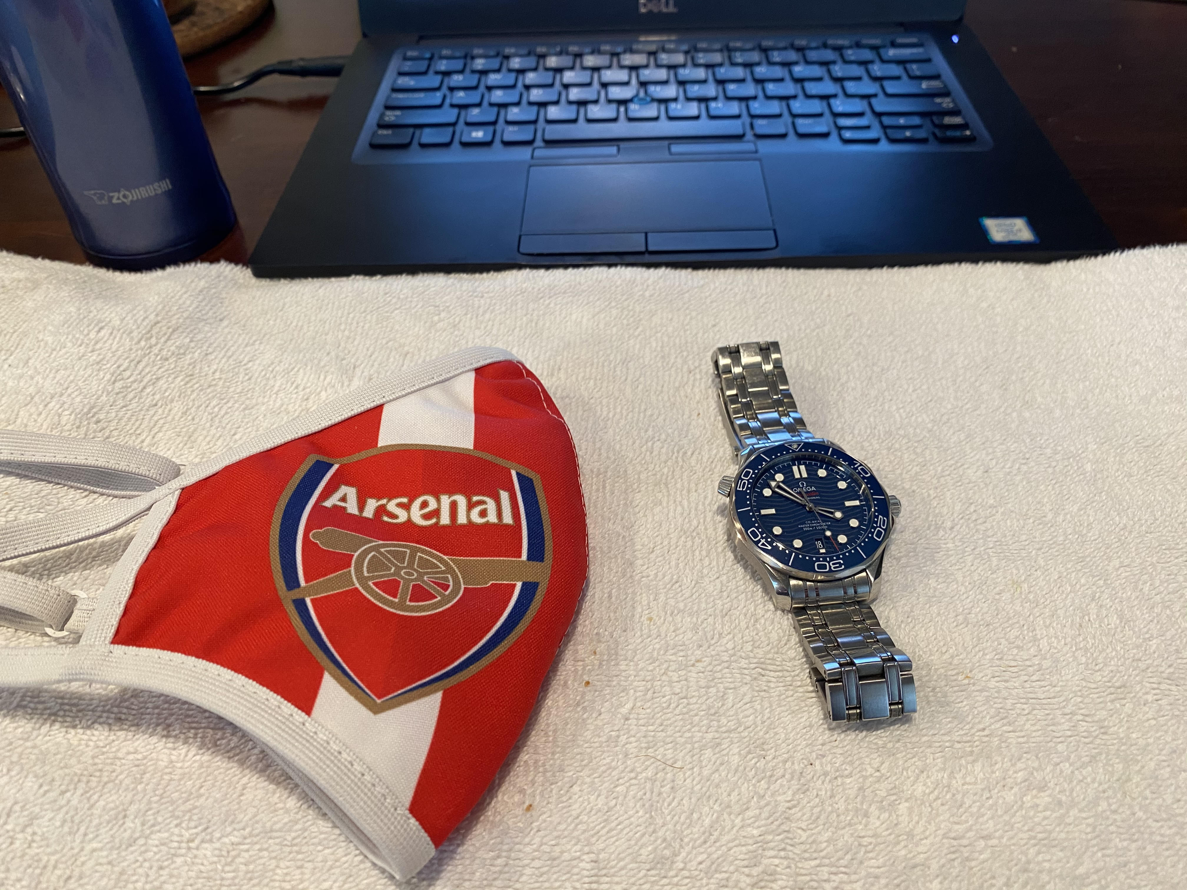 (Also photographed, Arsenal face mask, work computer, Zojirushi water bottle, and towel arm rest.)