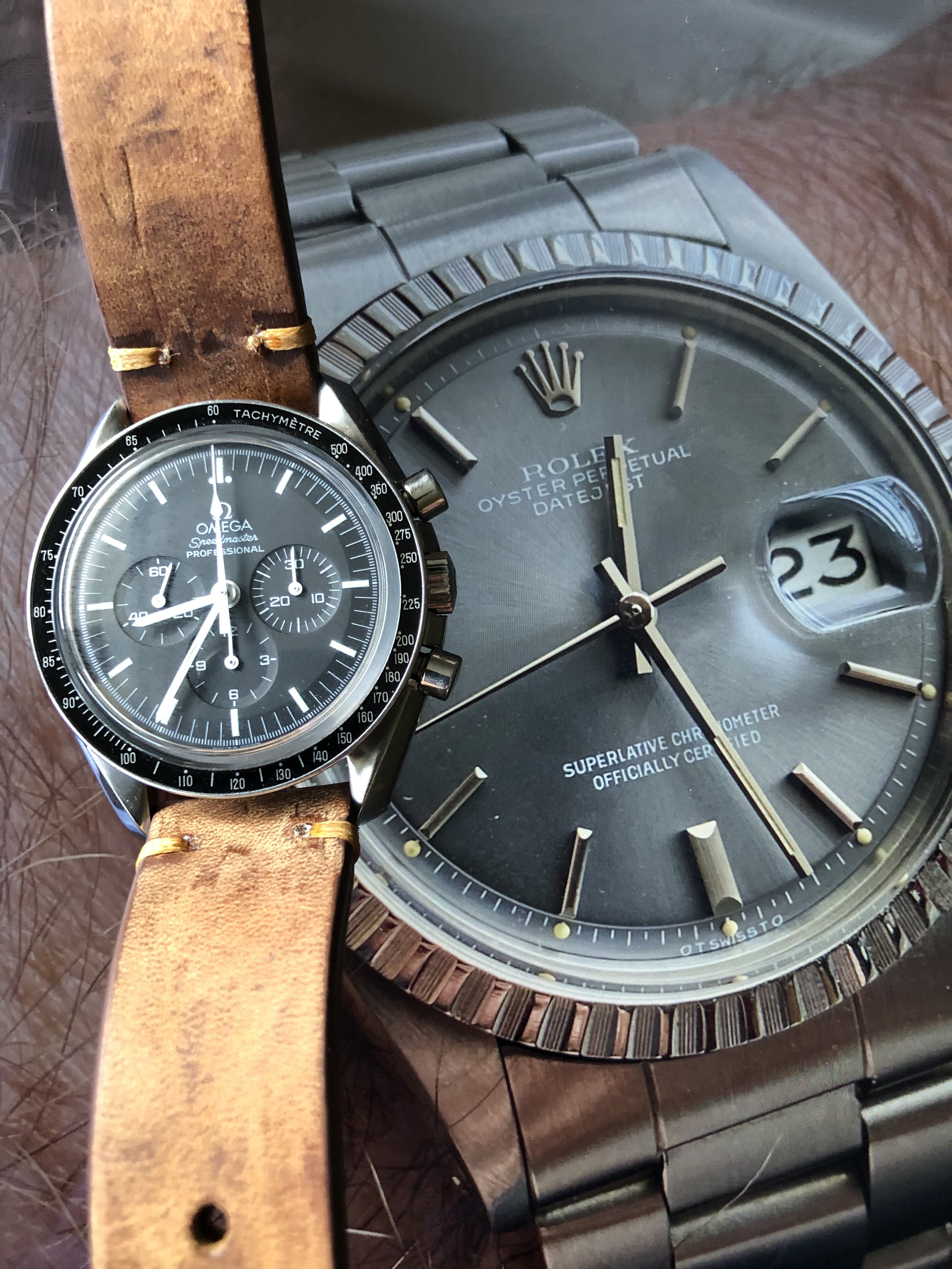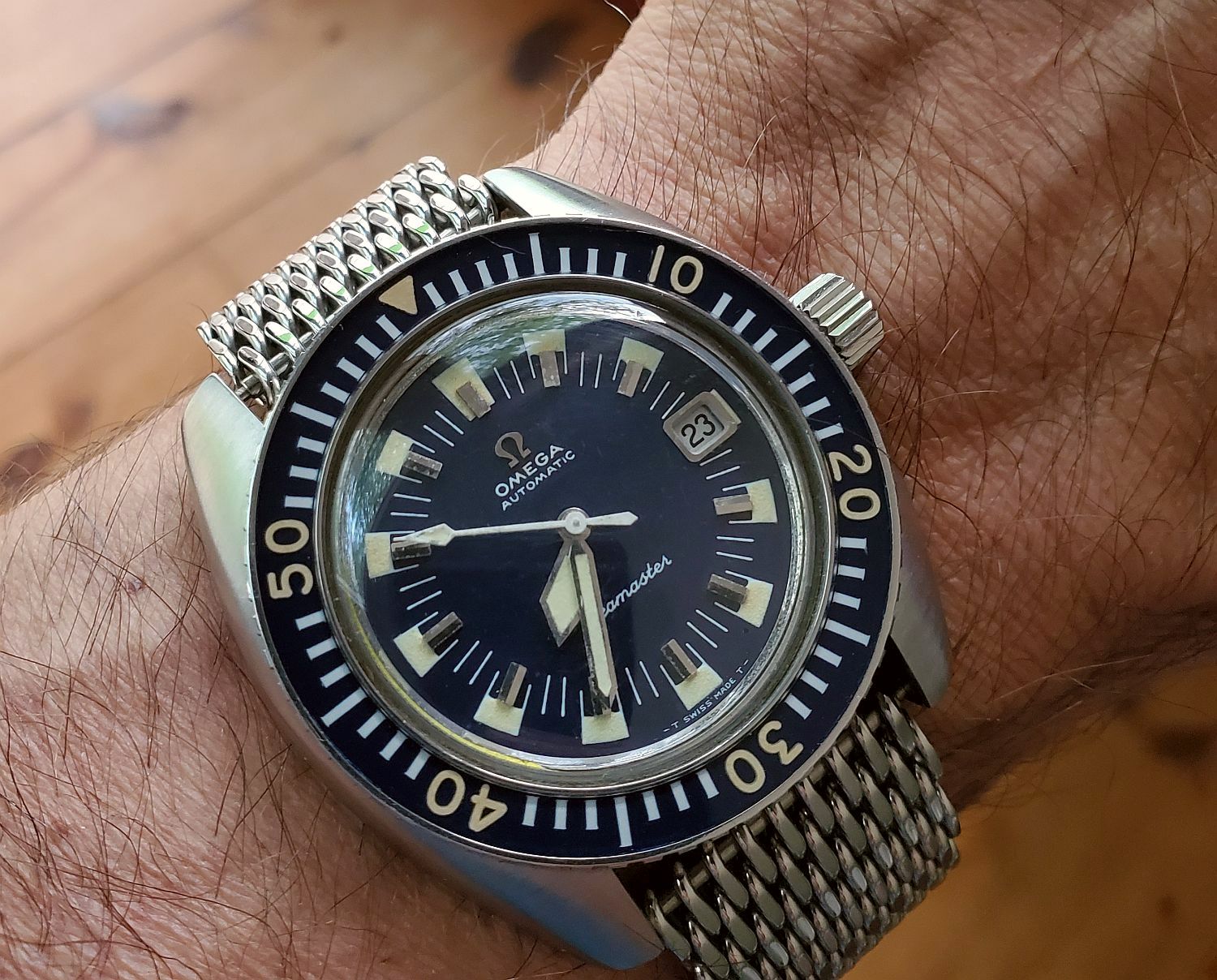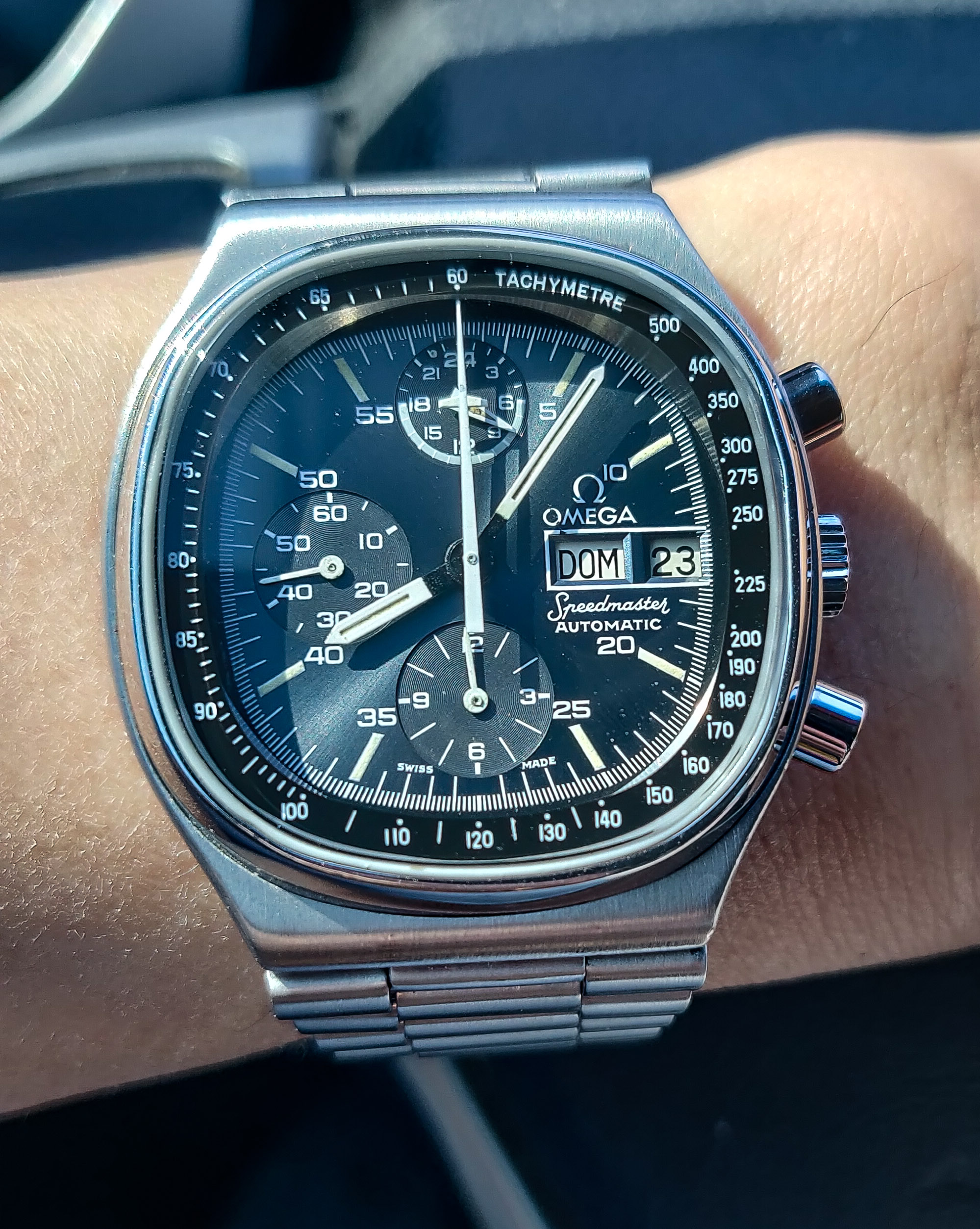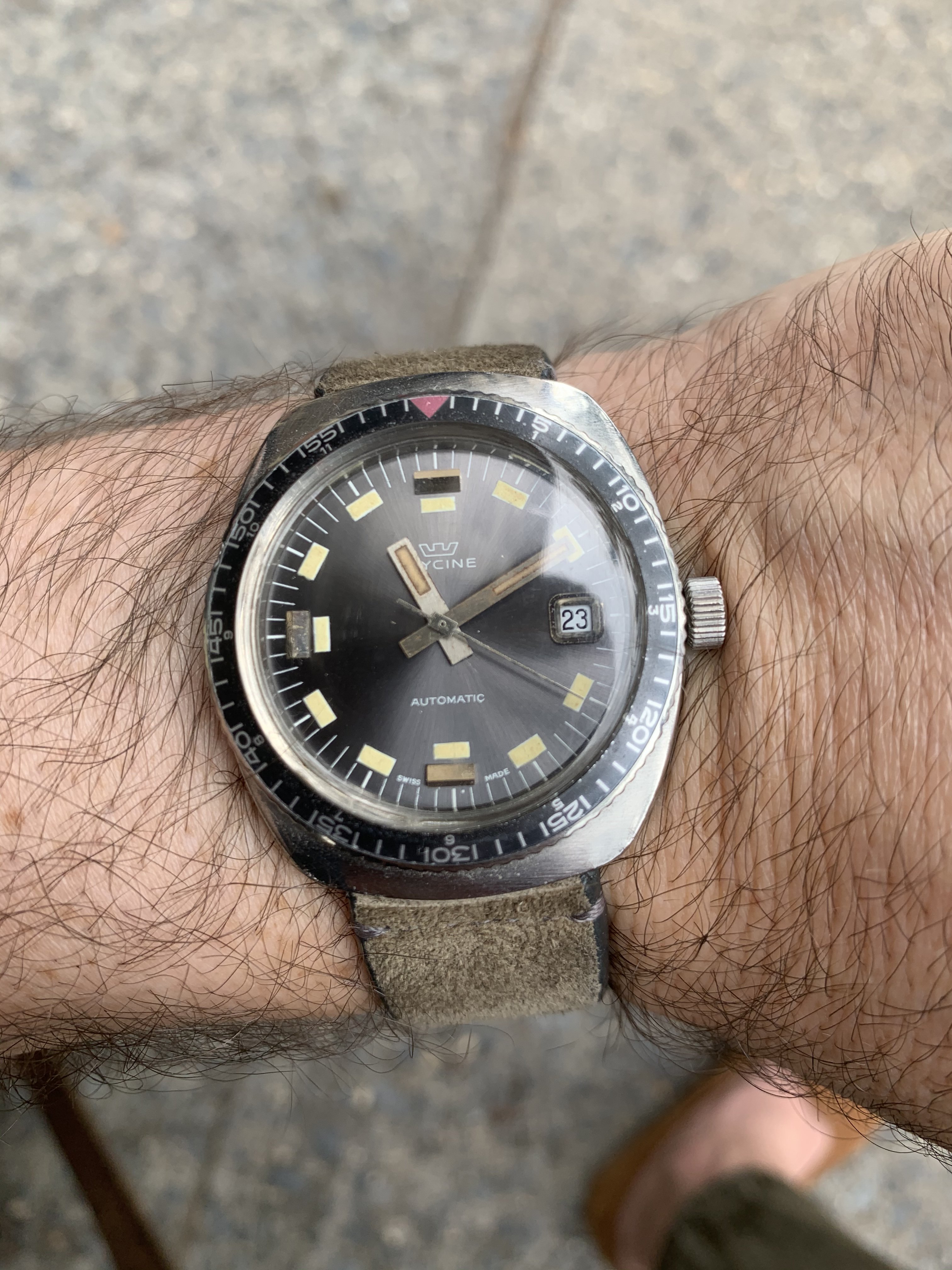 Bought this odd 70s Glycine diver from Analog/Shift back before they went legit. Can’t find much in the way of info about it online, and it doesn’t get much time on the wrist. But when it does, I always enjoy the cushion case and the radial finish on the dial.
