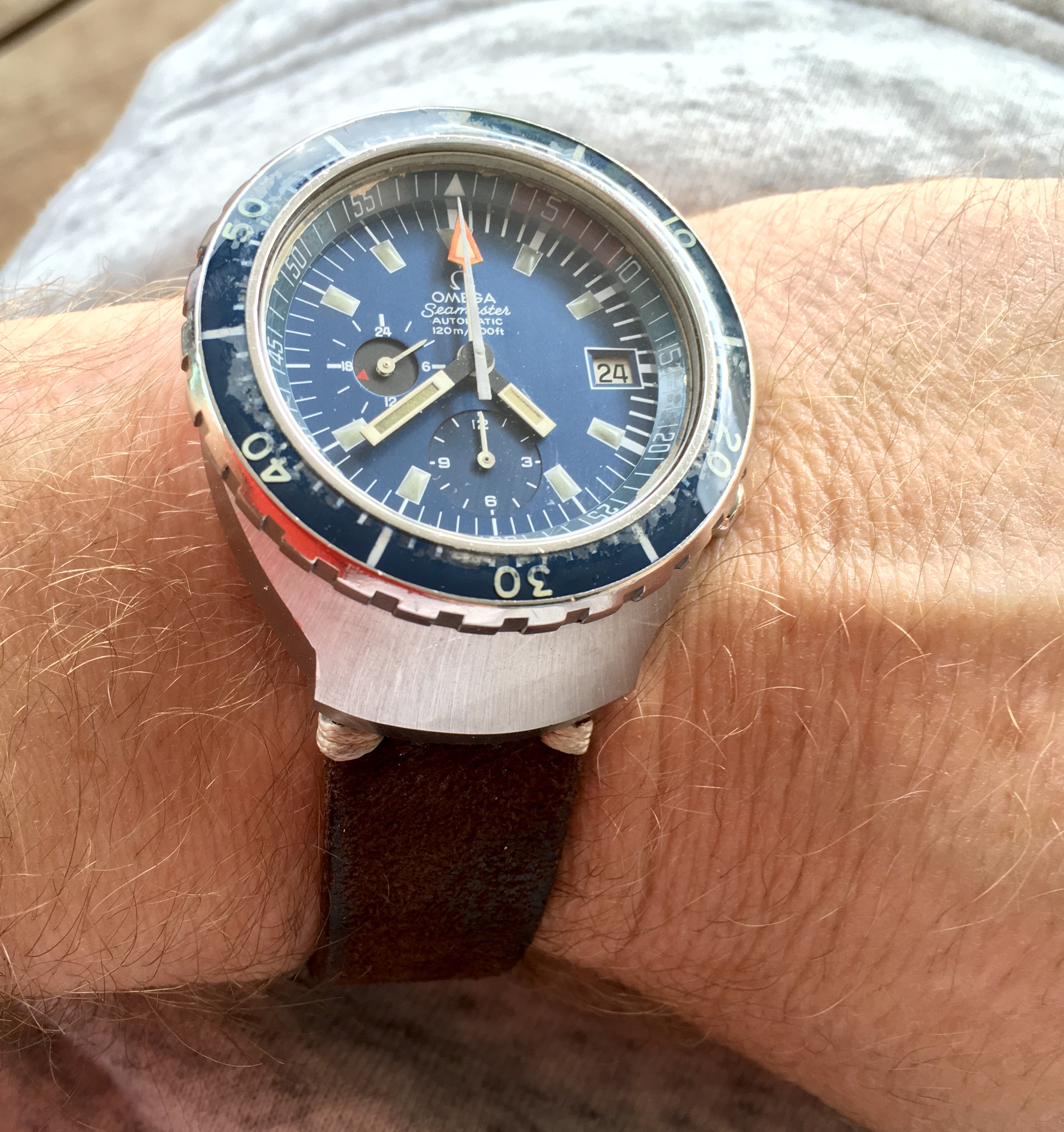 My new to me Seamaster 300. My local watchmaker took a Longines Avigation in trade this past Saturday. The dial and bezel are deep navy blue with red details. I think I did OK with this one.