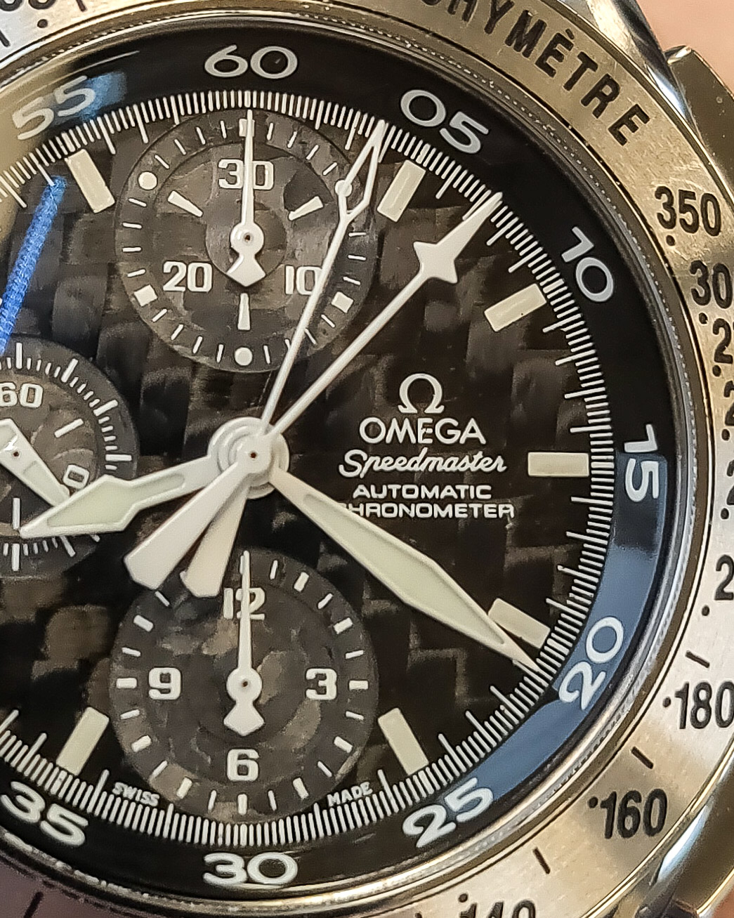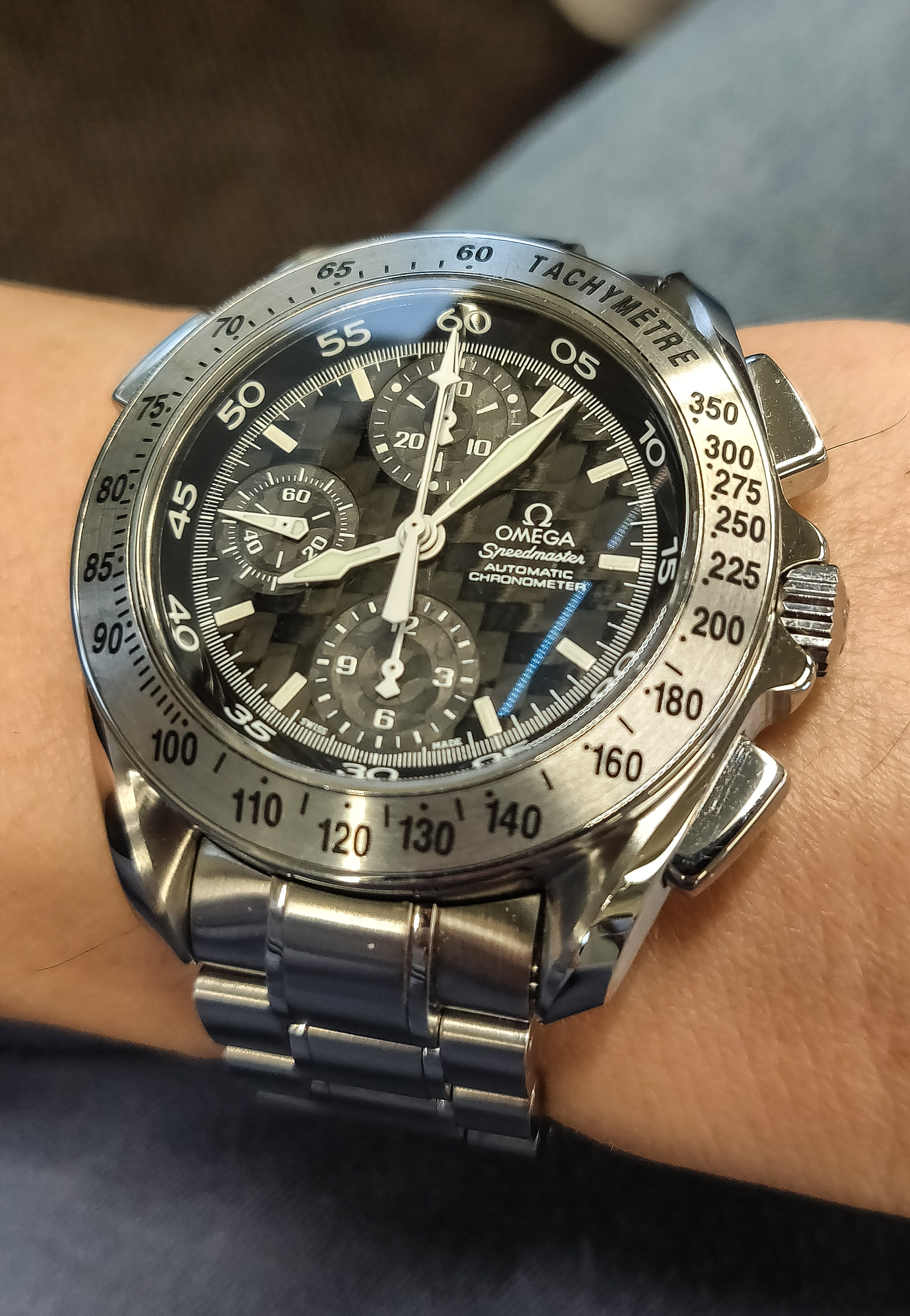 Omega Speedmaster Automatic Rattrapante 3540.50. I know this model is uncommon and largely unloved but it blew me away when I first saw it with its split second extra hand, carbon fiber dial, third pusher, hefty case, and bold texts.