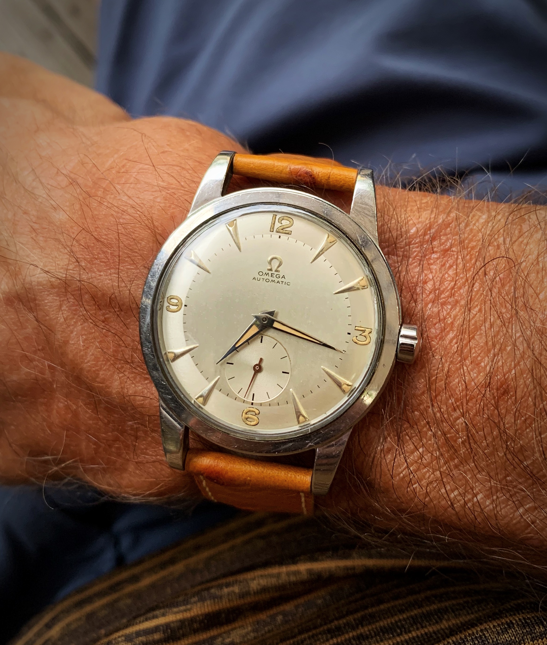 The Omega date at 6, caliber 355, bumper automatic I have worn continually now for about two weeks. This one also has been a challenge! It is little wonder to me how vintage watches end up being retired. If an owner had to pay someone like me to coax one of these old babies back to life, the watch would have been retired, or worse. Thrown out!
