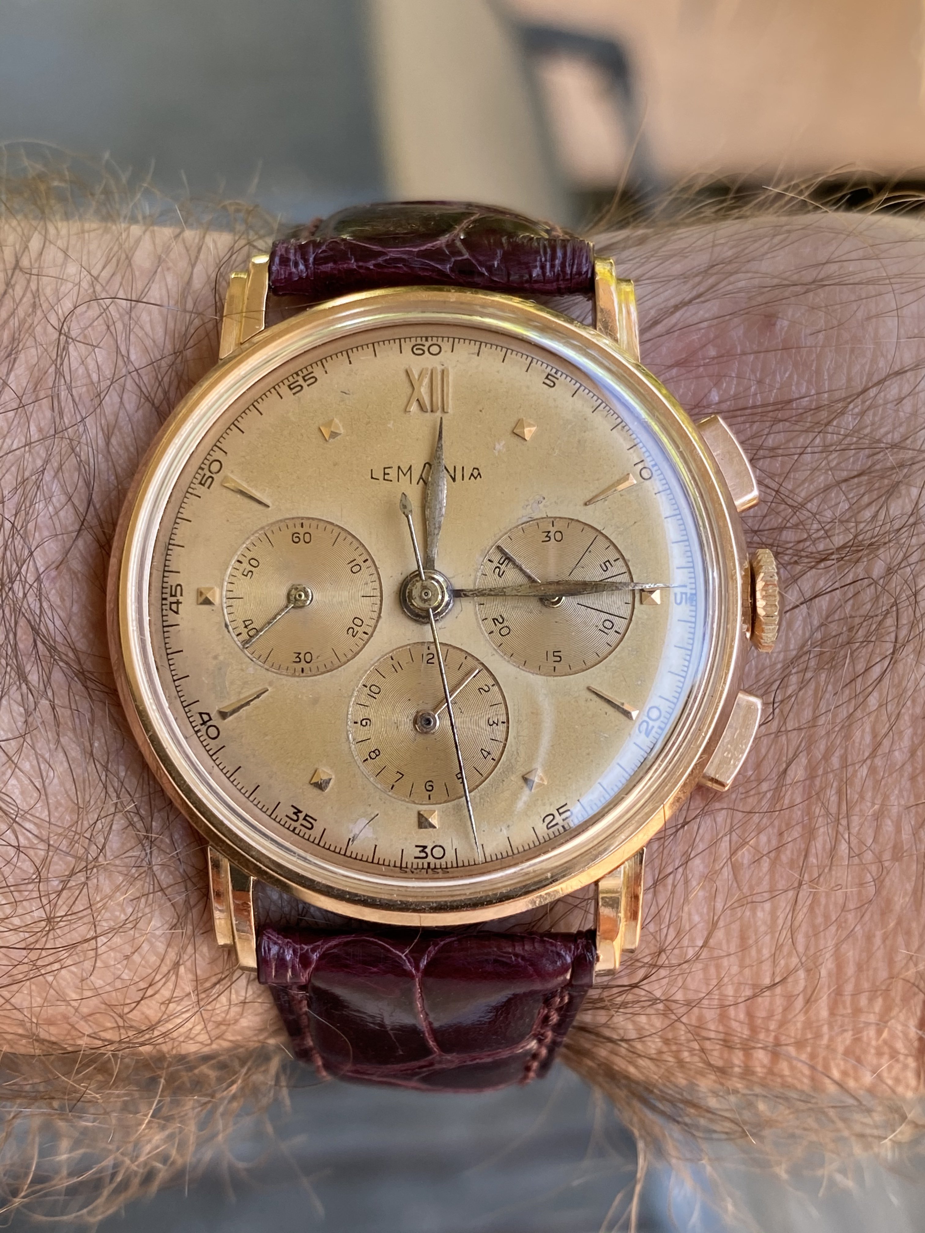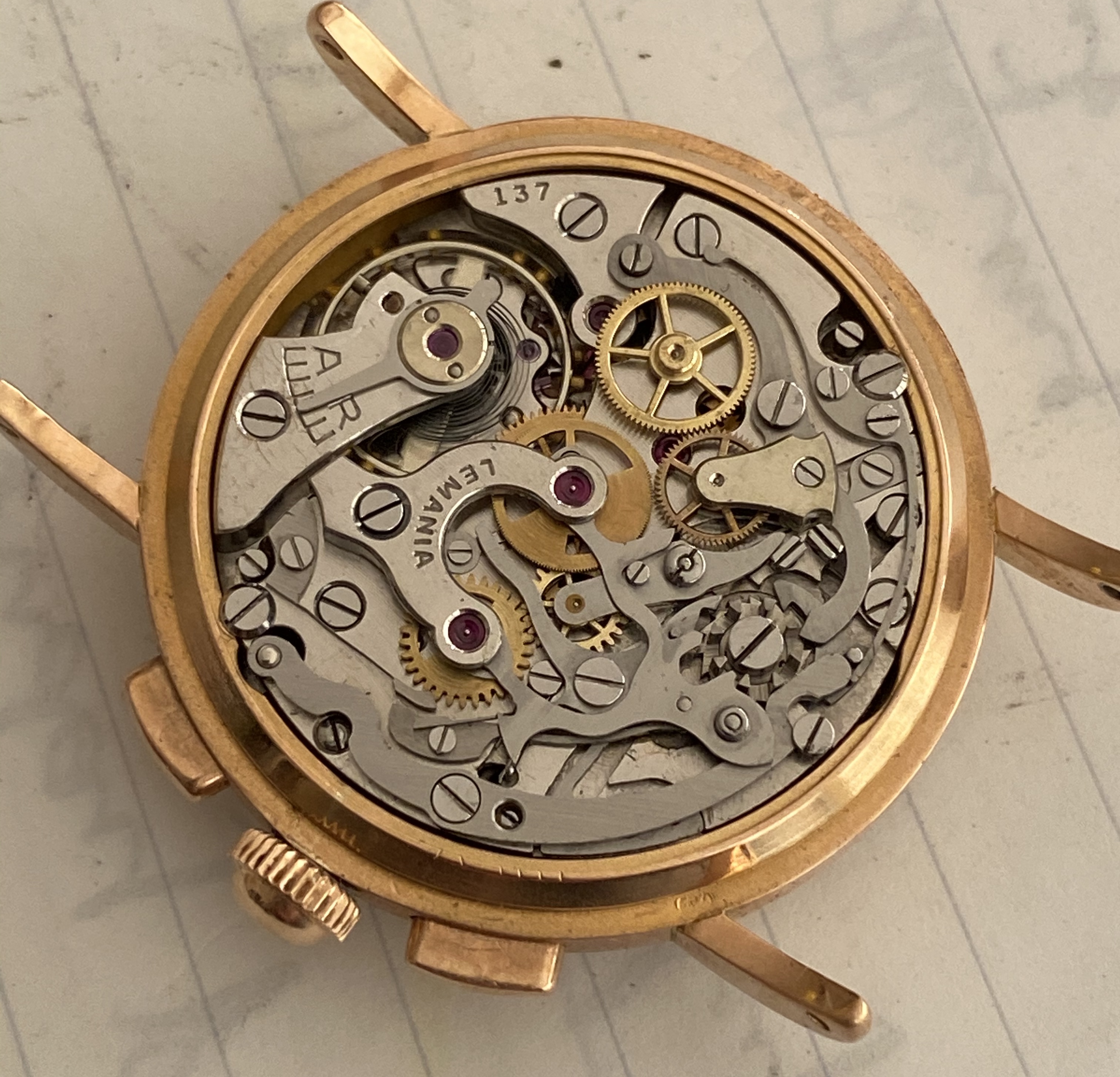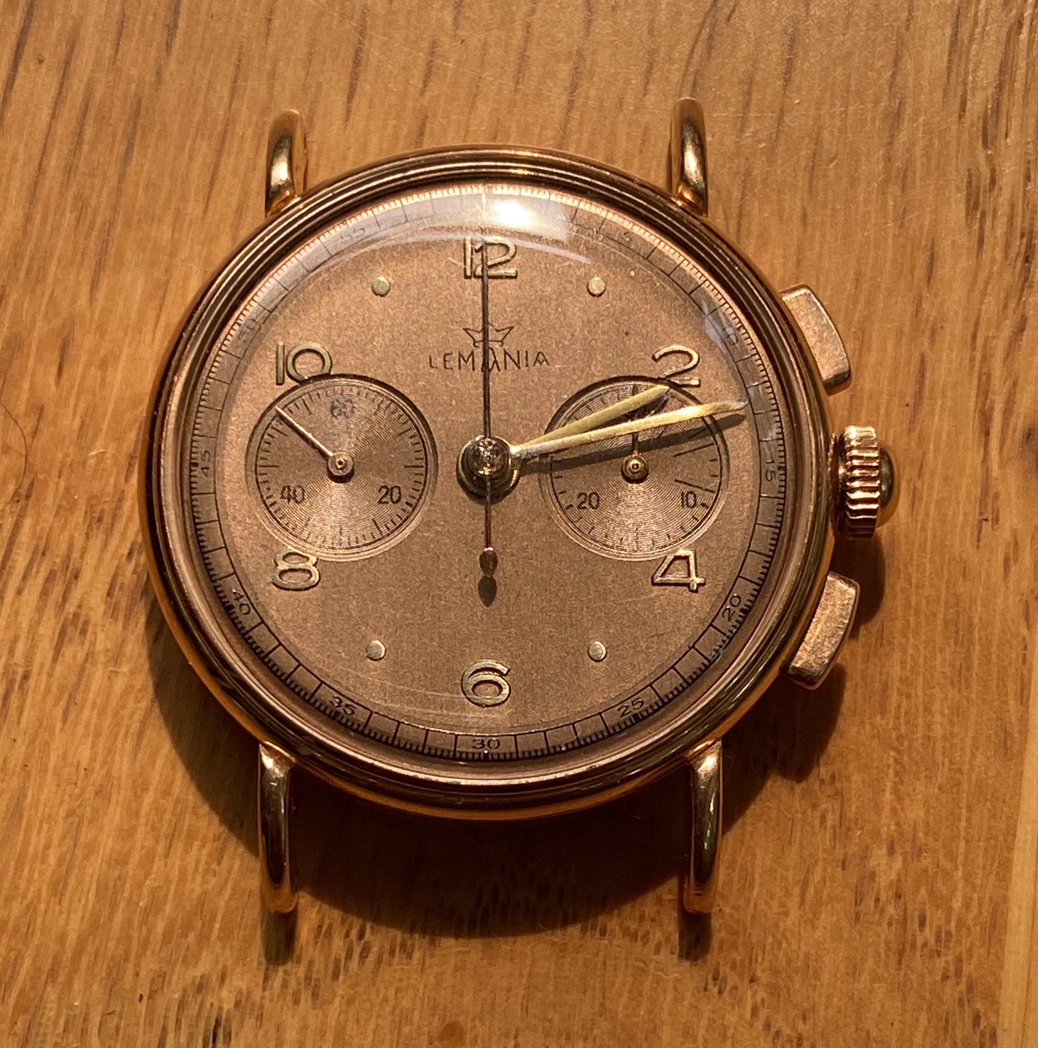 I believe this was one of that initial Lemania run, as the very low serial number puts it in 1942, when that run occurred.