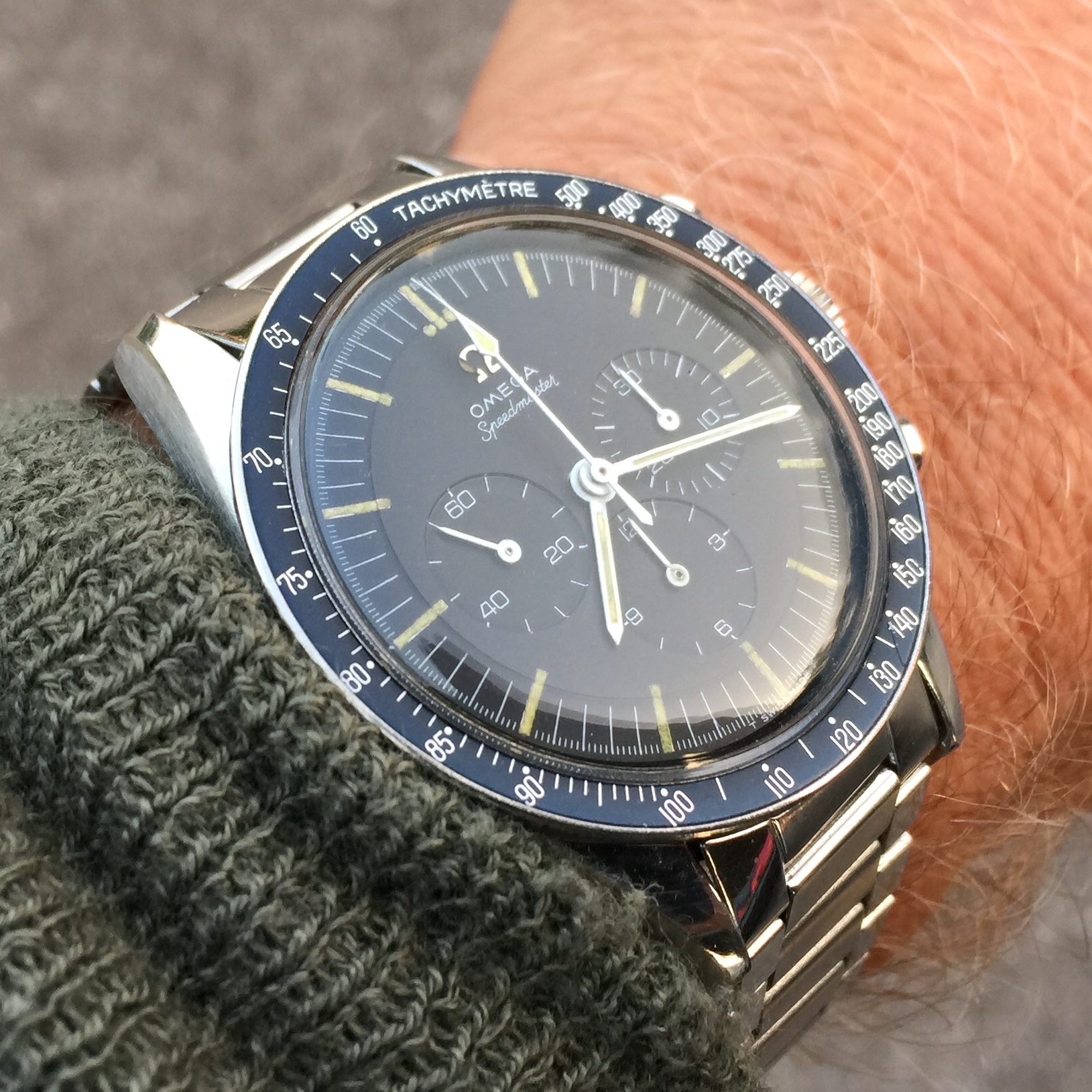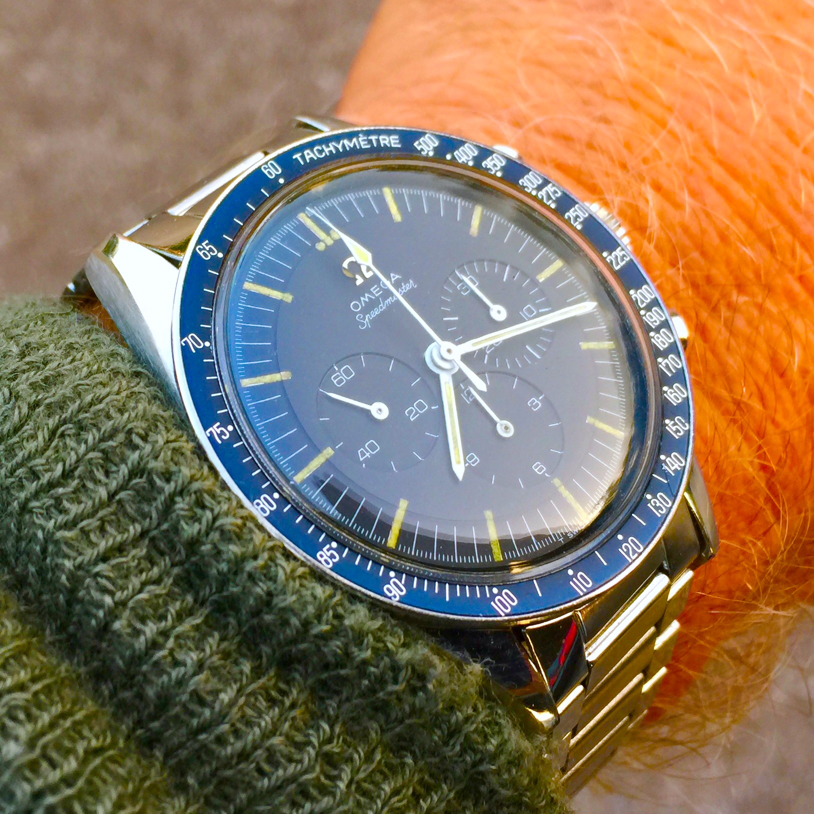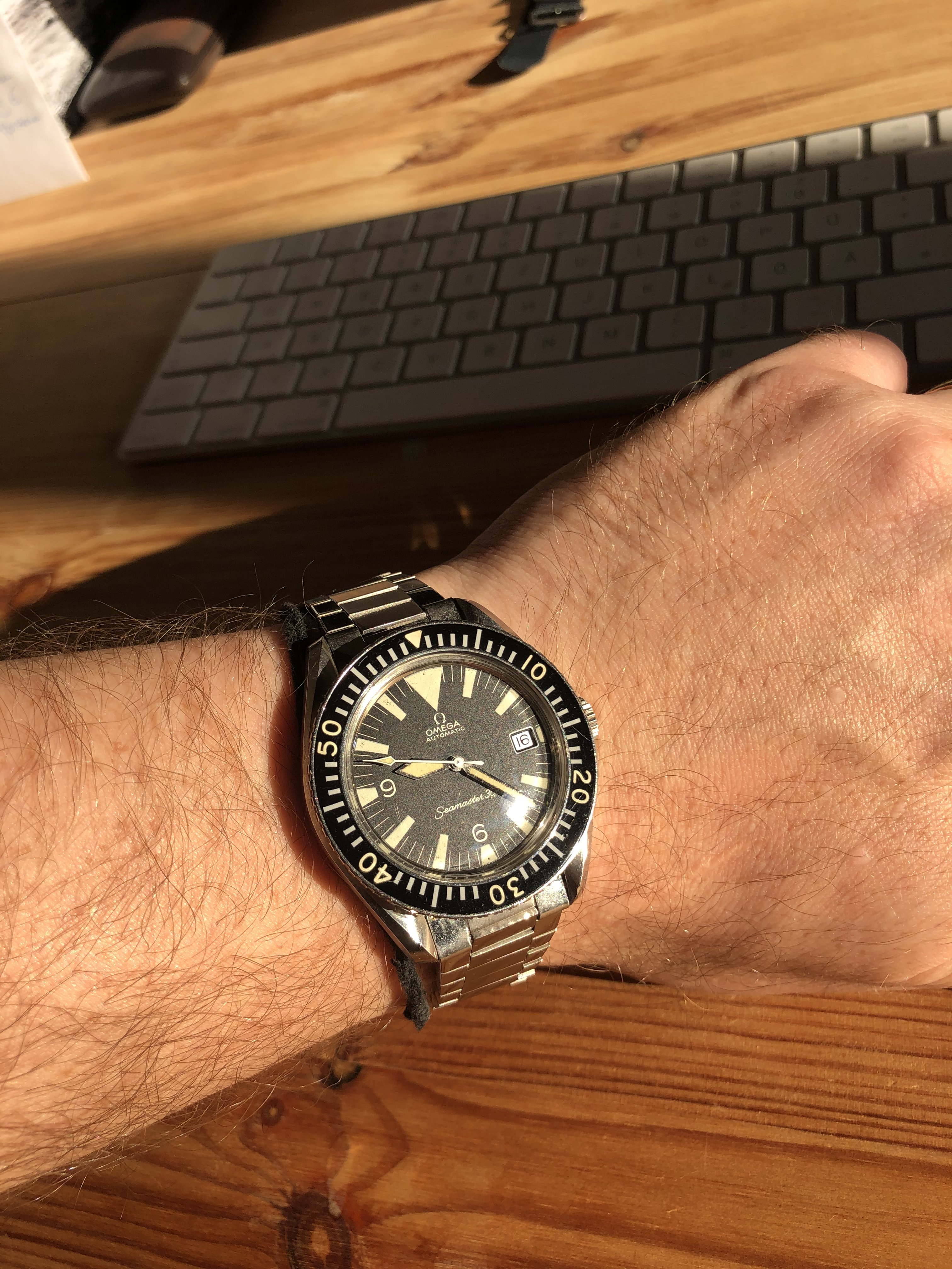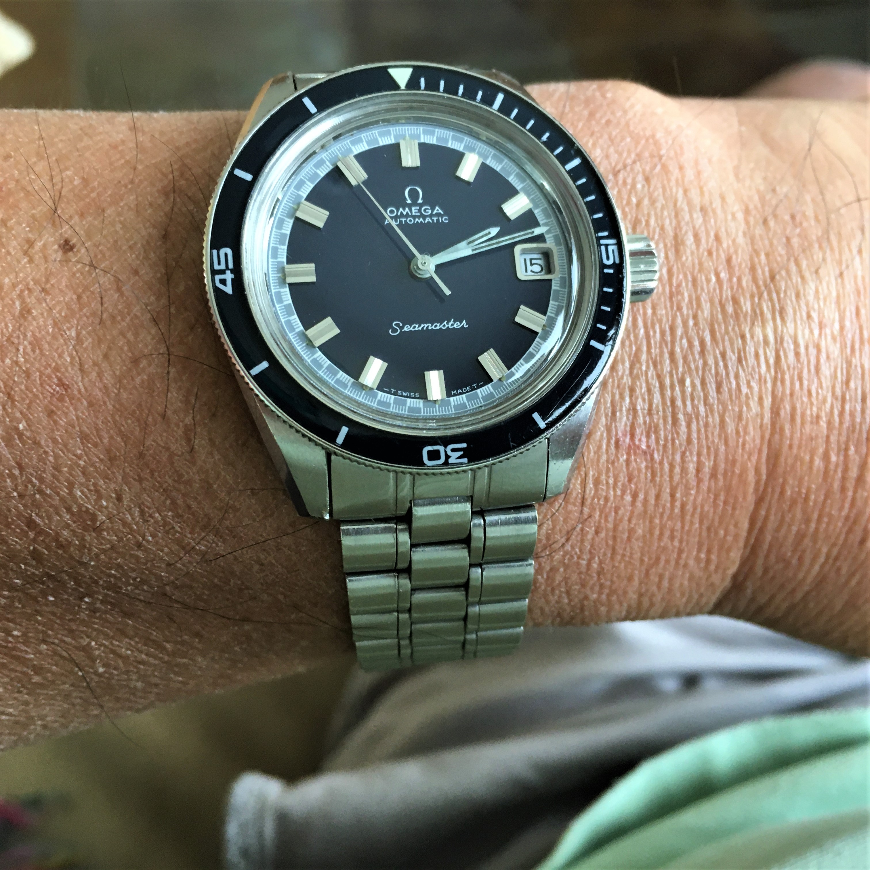 But here she is - an Omega Seamaster 60 "Big Crown", Ref.166.062. An absolutely beautiful watch. The clean blue dial mixes blends well with the grey racetrack - and the markers reflect light like crazy. And look at the glimmer of light off the bezel --- WOW. Everything about this watch is terrific. My pics do not compare to Jeff's and do not do justice to this watch, but here ya go....