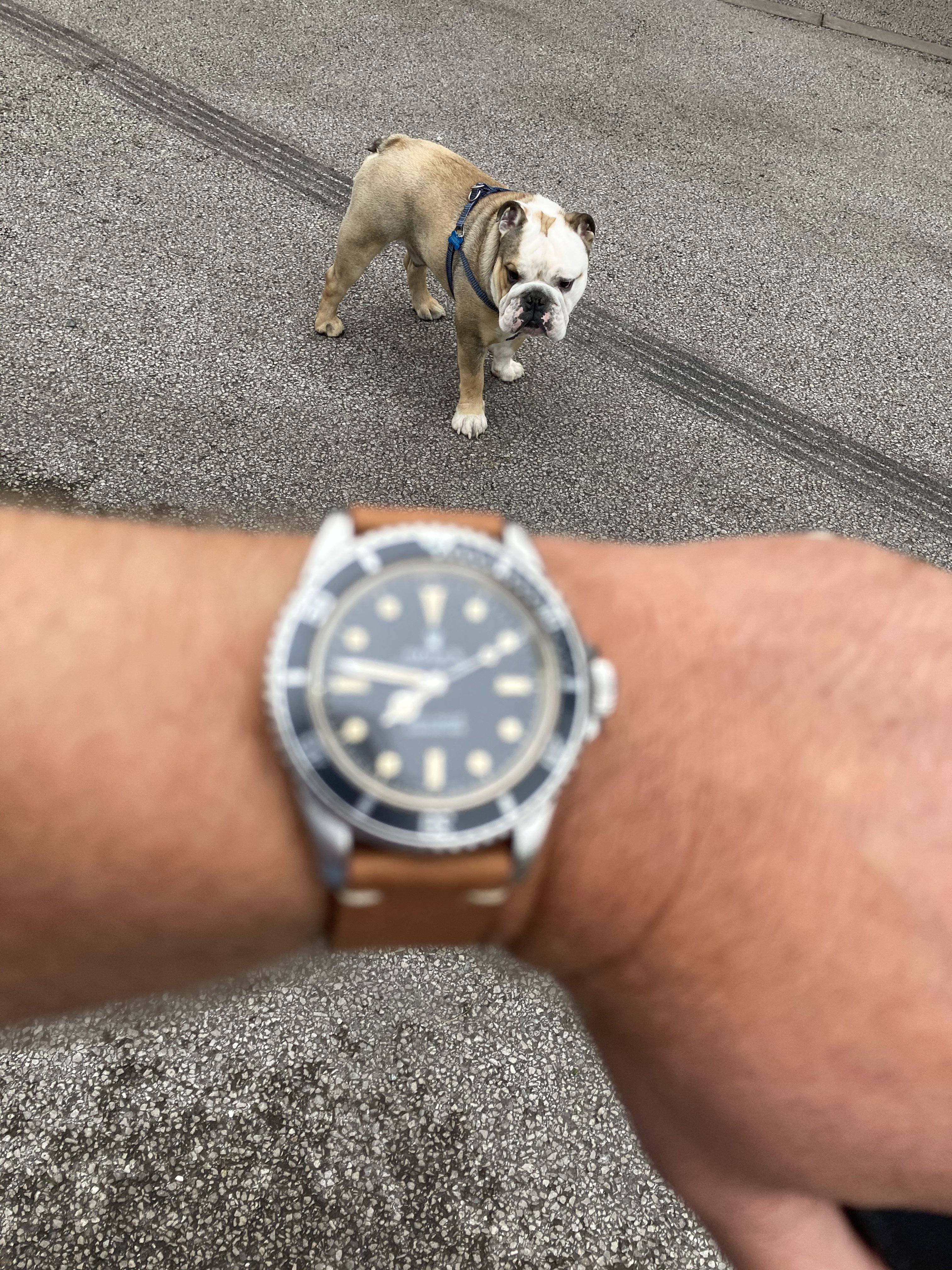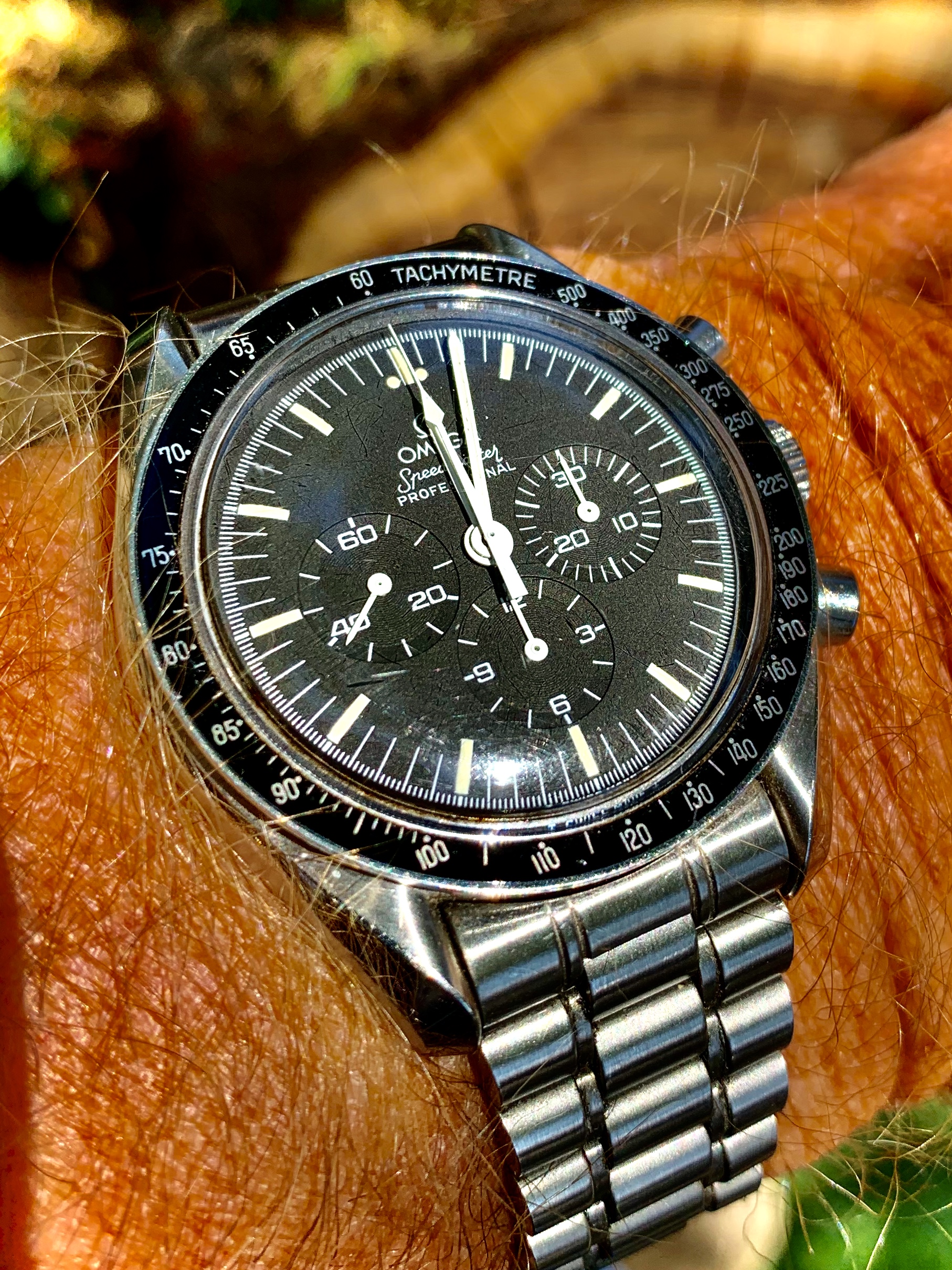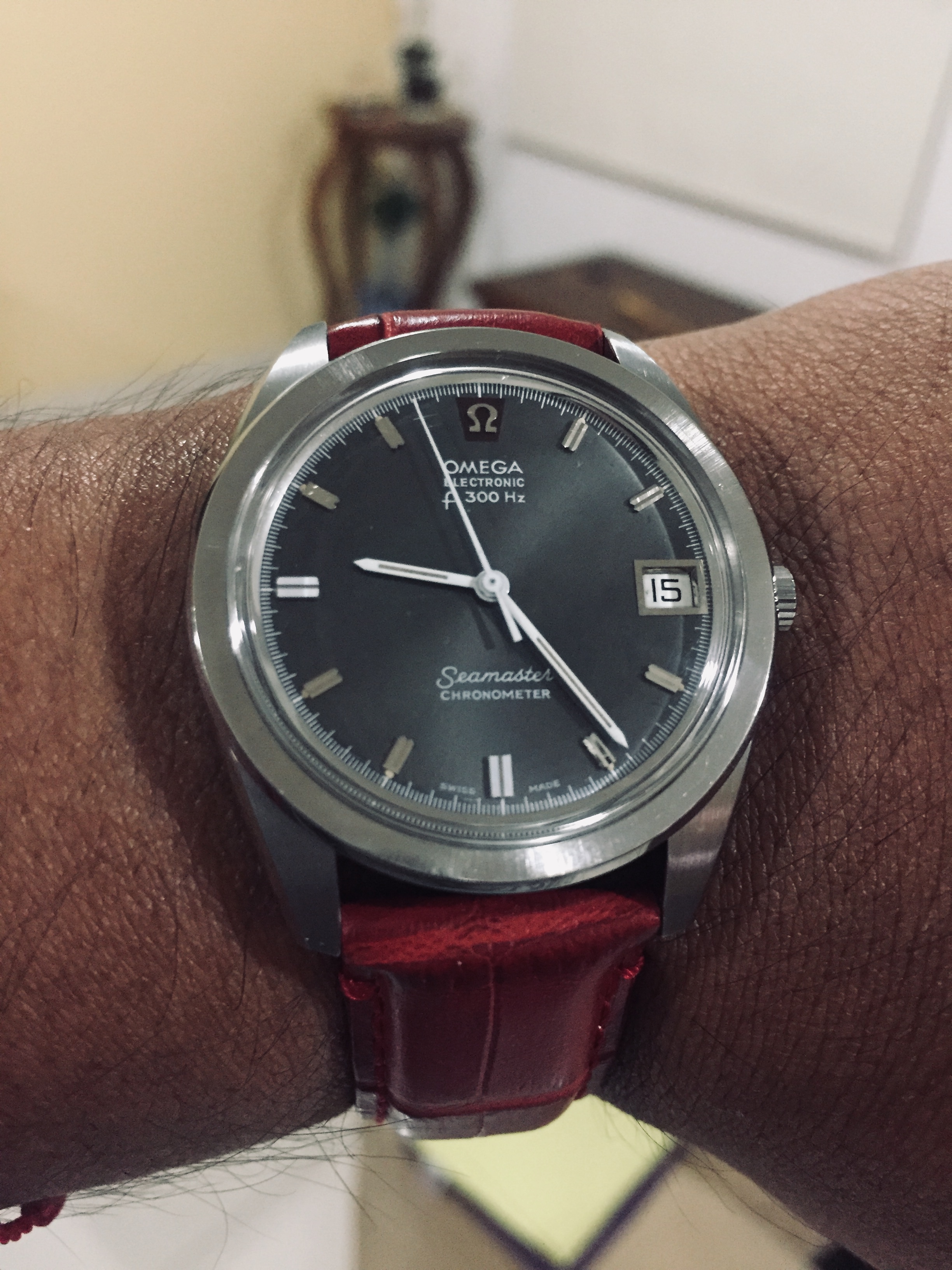 But here she is - an Omega Seamaster 60 "Big Crown", Ref.166.062. An absolutely beautiful watch. The clean blue dial mixes blends well with the grey racetrack - and the markers reflect light like crazy. And look at the glimmer of light off the bezel --- WOW. Everything about this watch is terrific. My pics do not compare to Jeff's and do not do justice to this watch, but here ya go....
