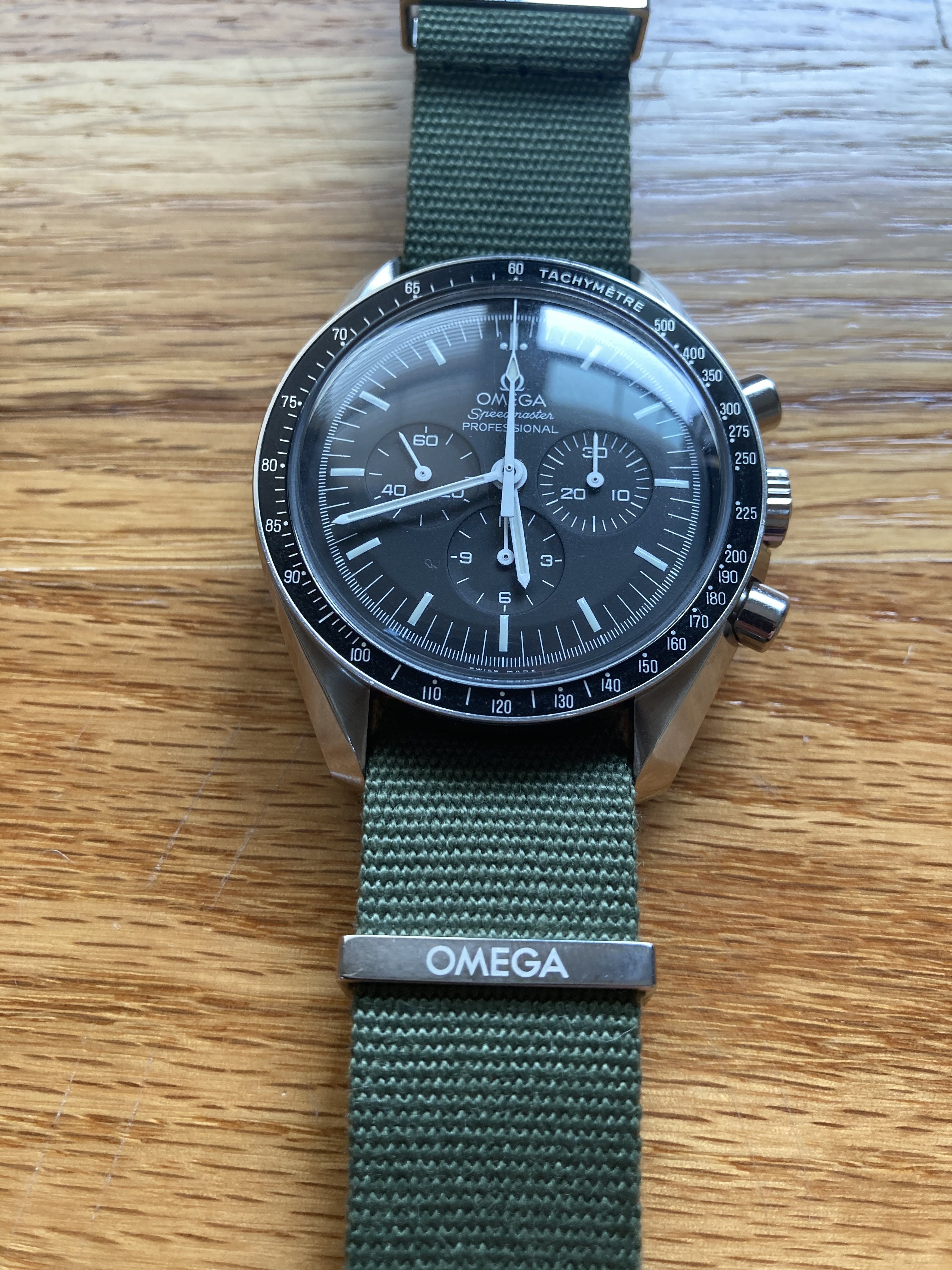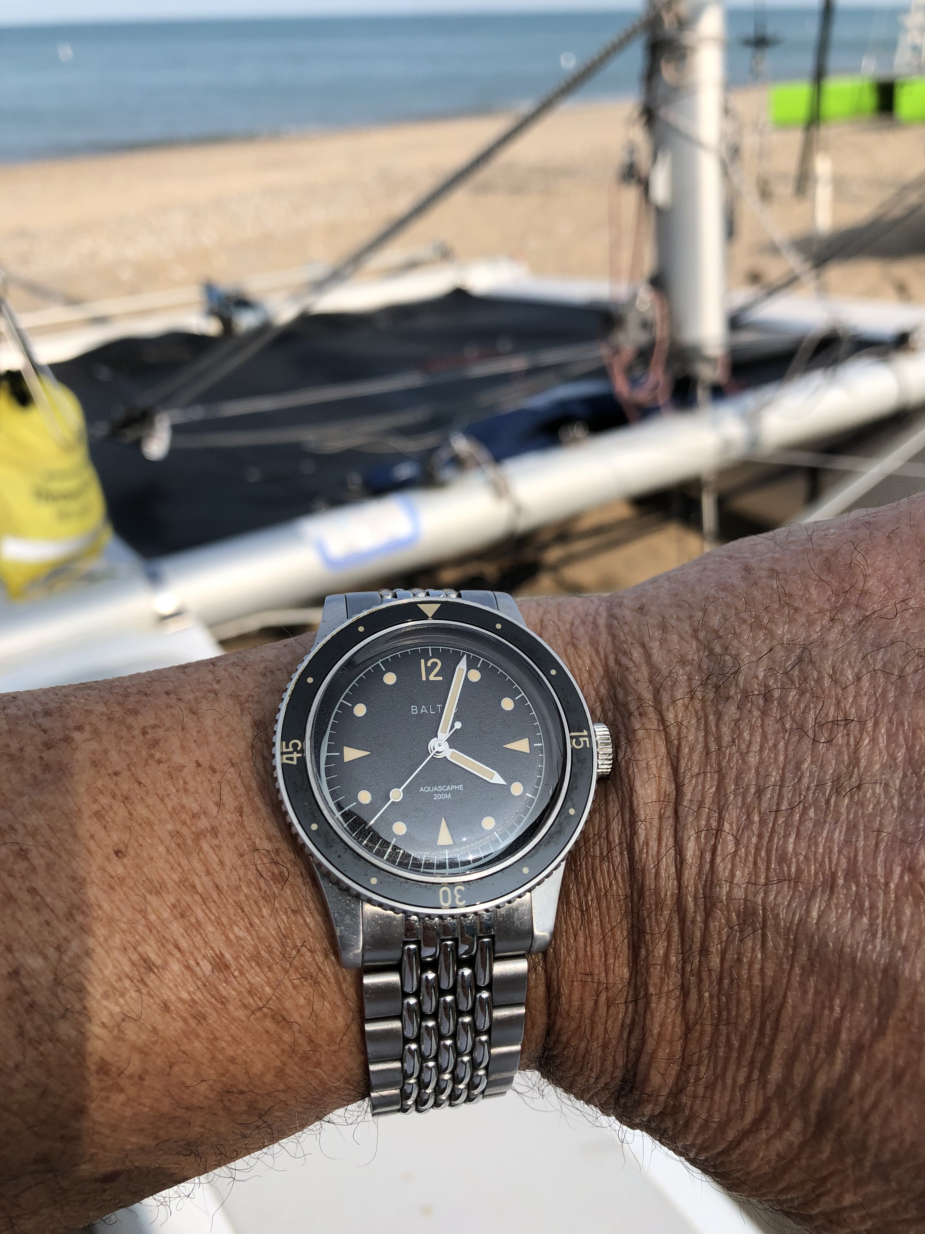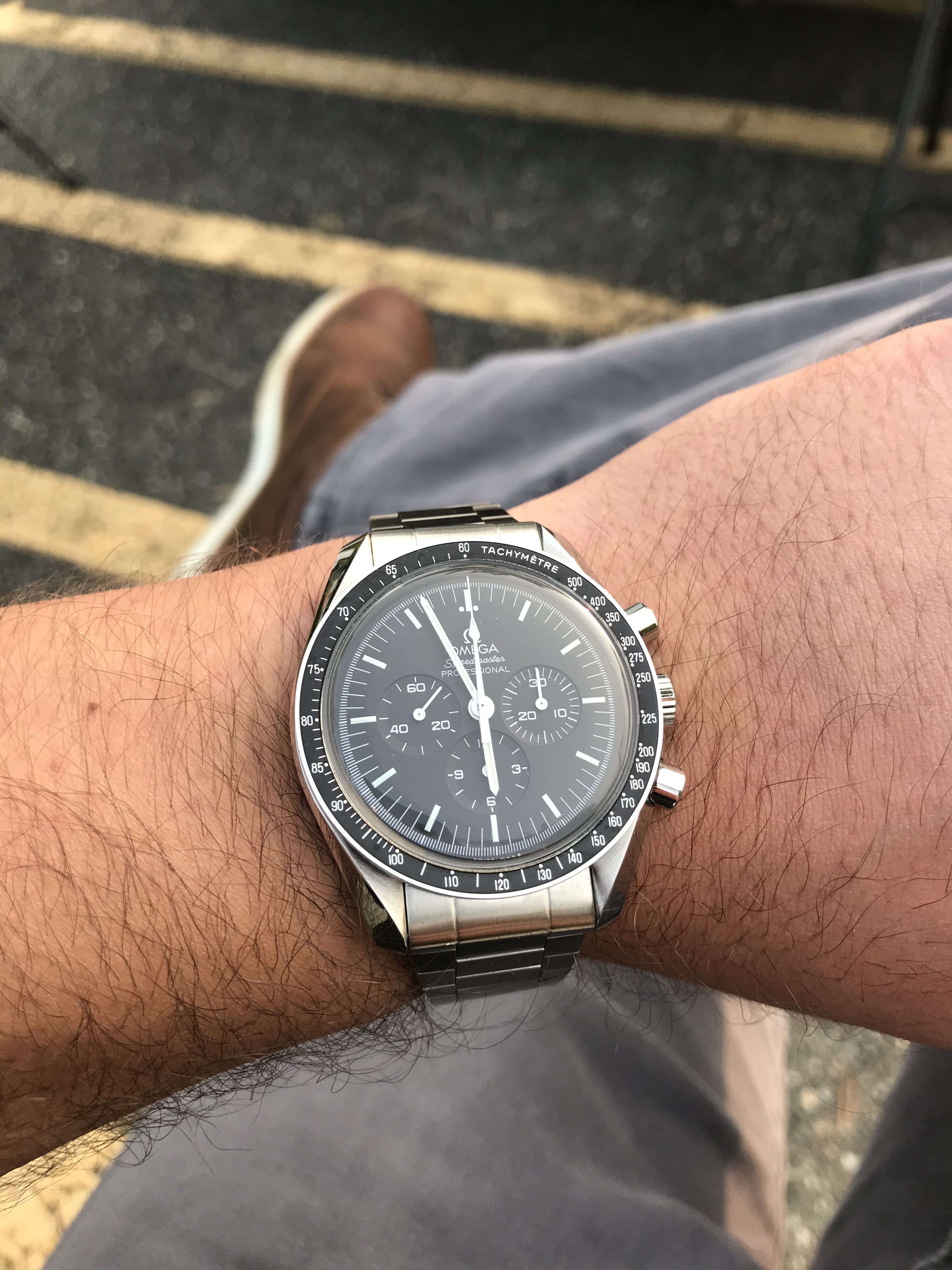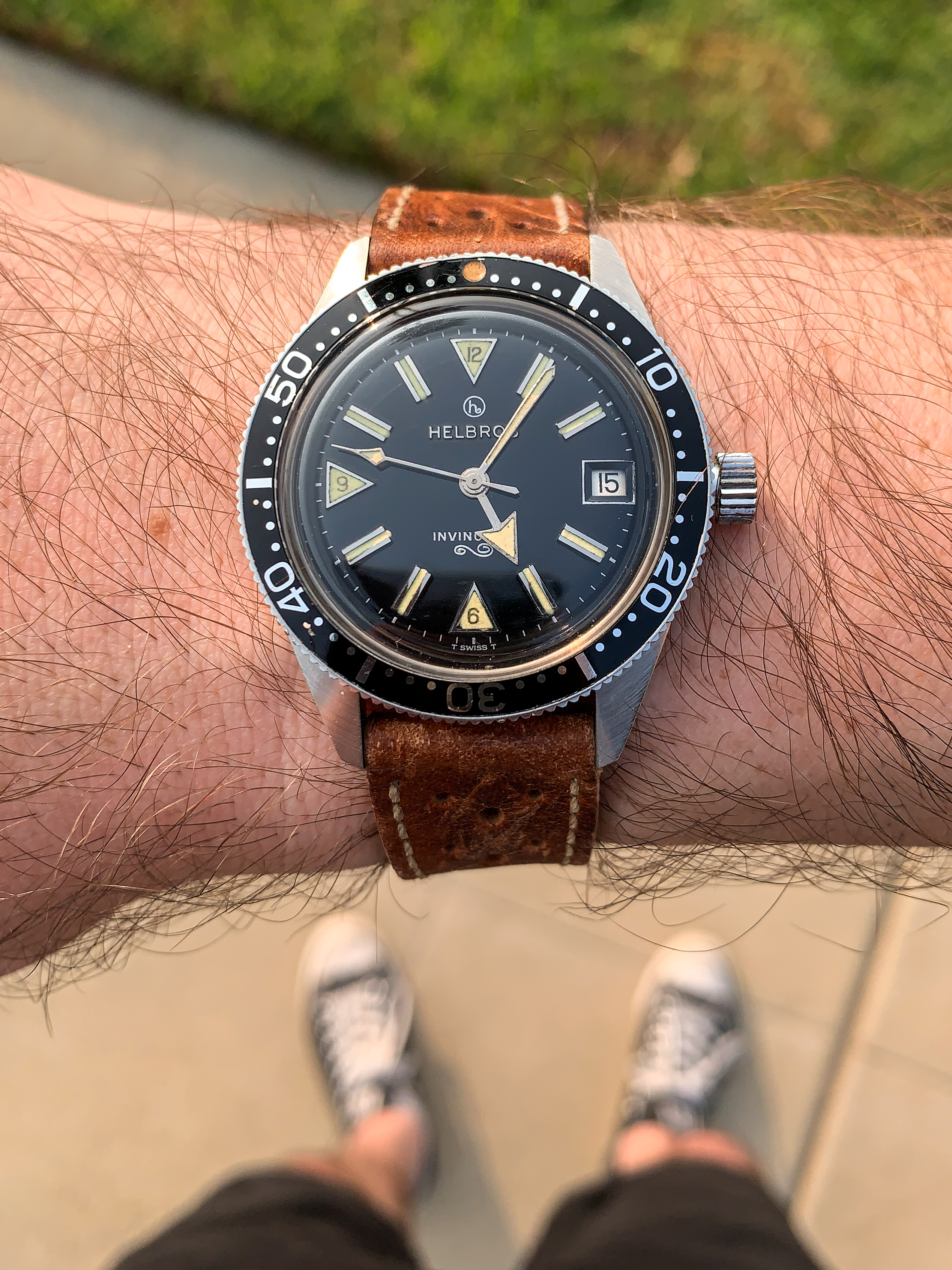 But here she is - an Omega Seamaster 60 "Big Crown", Ref.166.062. An absolutely beautiful watch. The clean blue dial mixes blends well with the grey racetrack - and the markers reflect light like crazy. And look at the glimmer of light off the bezel --- WOW. Everything about this watch is terrific. My pics do not compare to Jeff's and do not do justice to this watch, but here ya go....