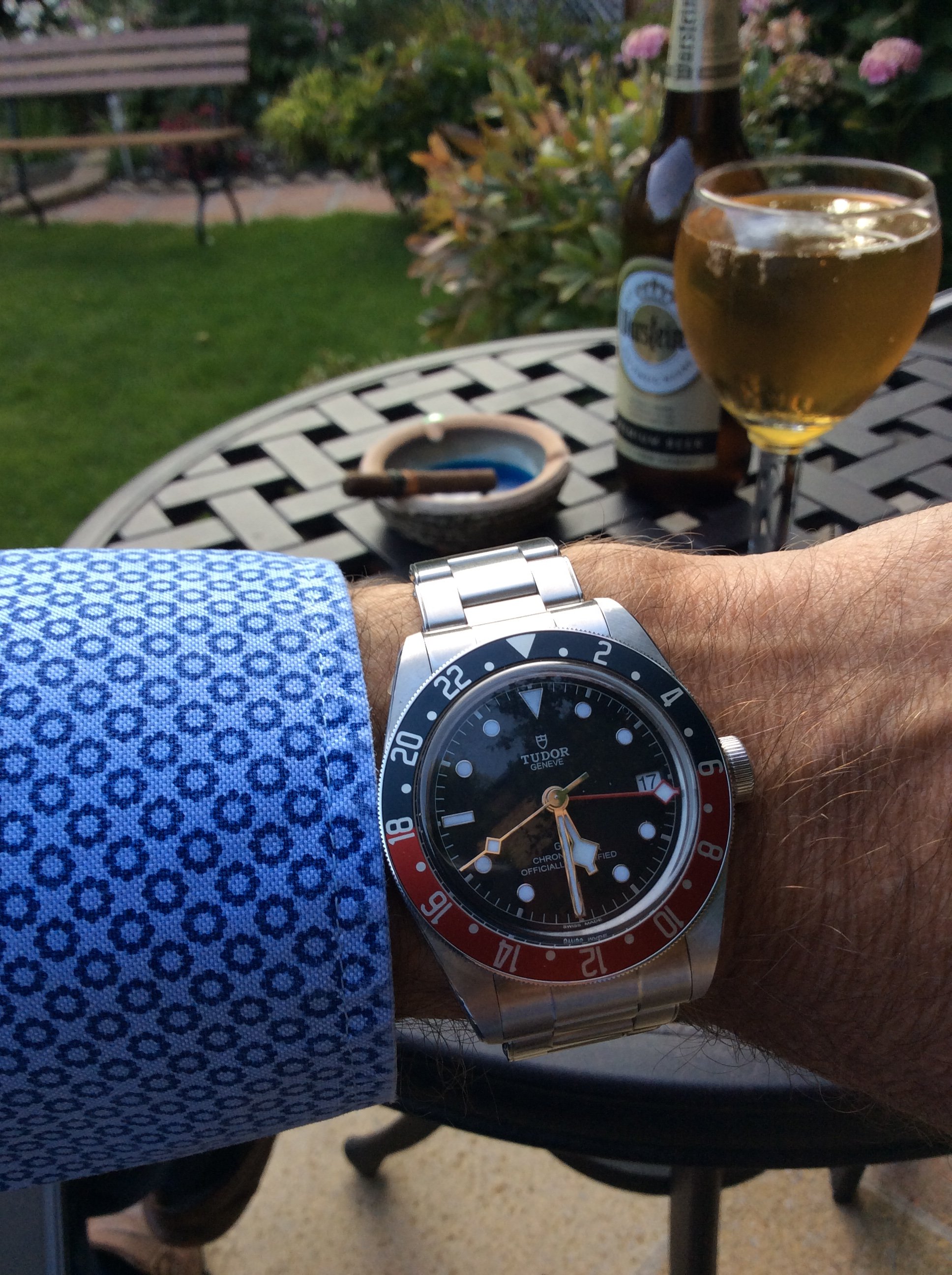 Really pleased to have this one back in the collection, everything seems fine, even had a case back protector on it this time, which I removed to check all was in order! Sun has gone down but still warm enough to sit outside for a beer and Davidoff.