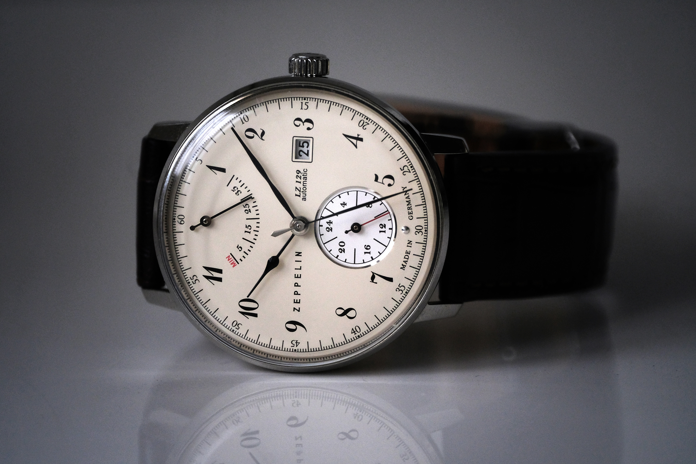 I've learned SCAFO in Italian means Hull (like boat or submarine hull). This likely relates to the depth a submarine hull can dive to. Looking at many old ads, Eberhard showed these depth lines frequently. Graf obviously related to keeping time. Thus Scafograf. Thank you to Fabio Spain Spagnolo