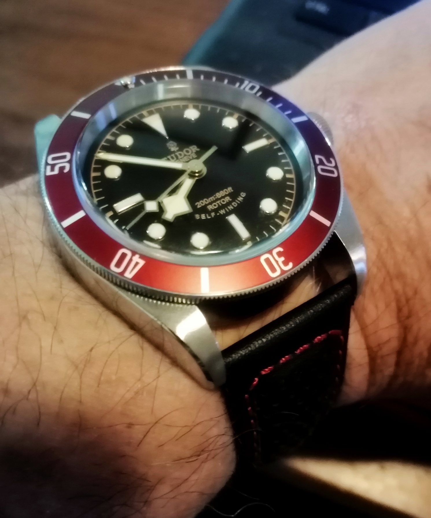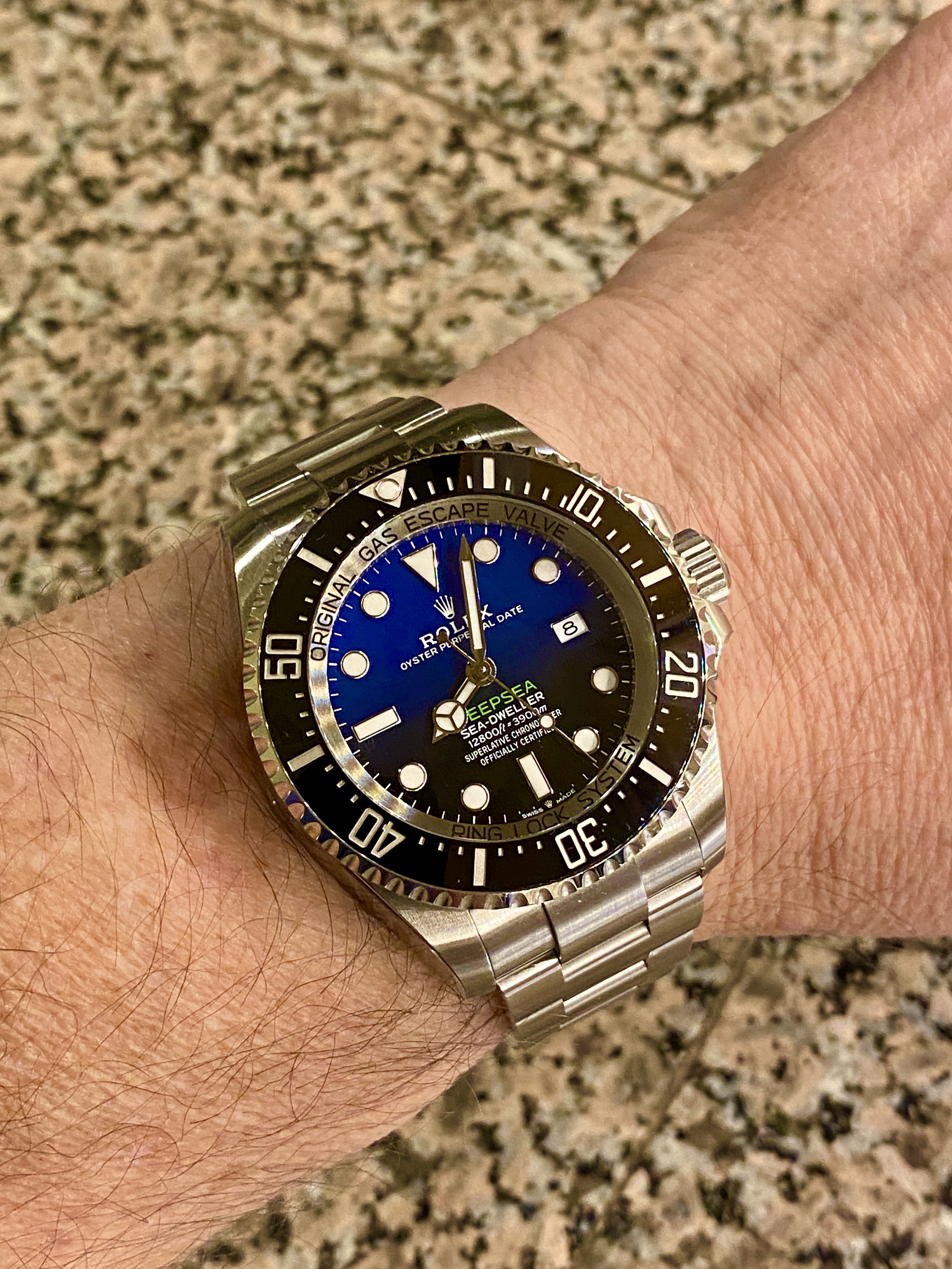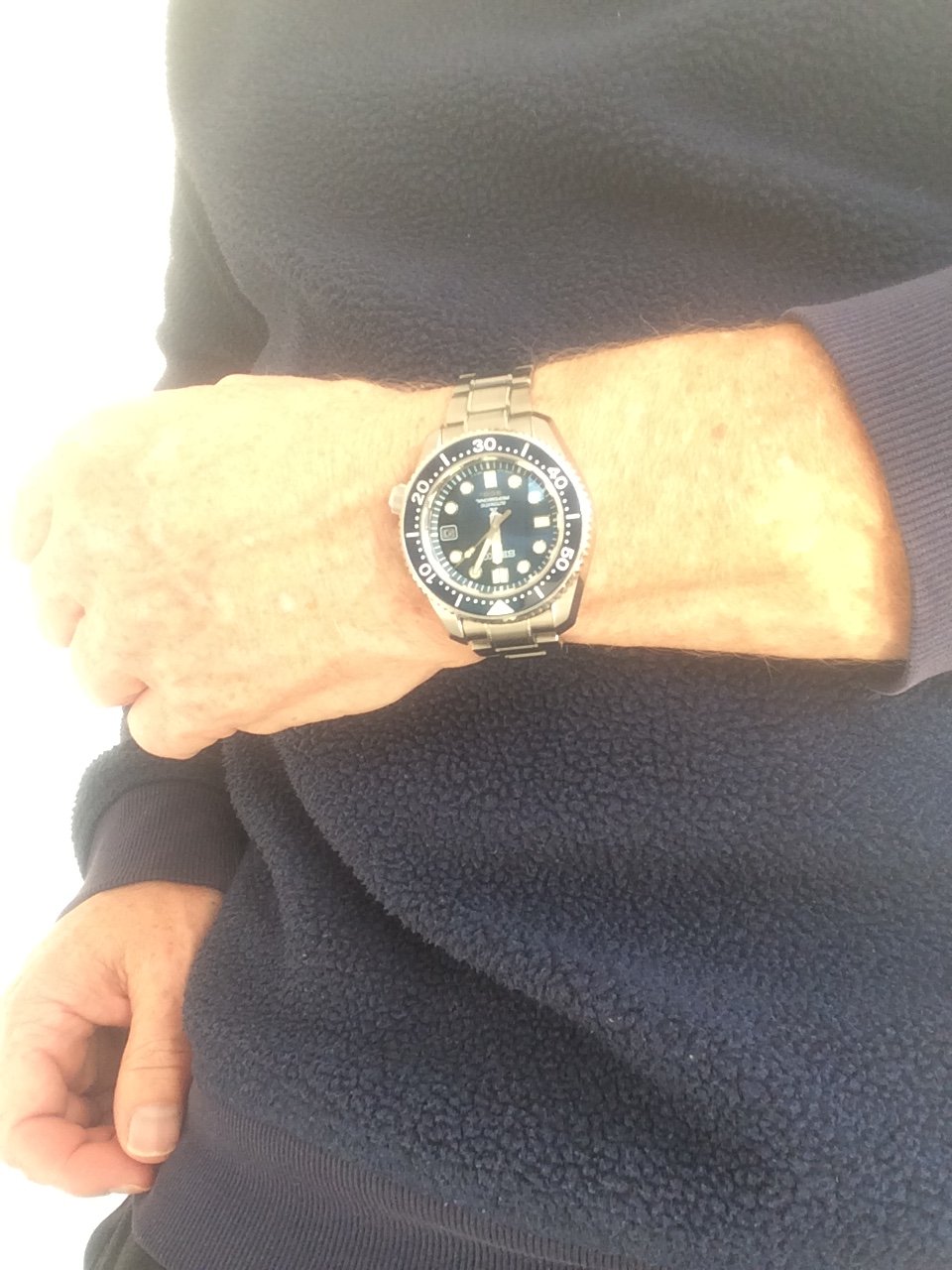 To give you an idea of my wrist size, and why I gravitate to larger watches > 40mm, here is picture proof that a 44mm DSSD is not too big. I'm not a giant = 5' 9" and 250 lbs. The pic makes the Deep Blue look "normal" size!
