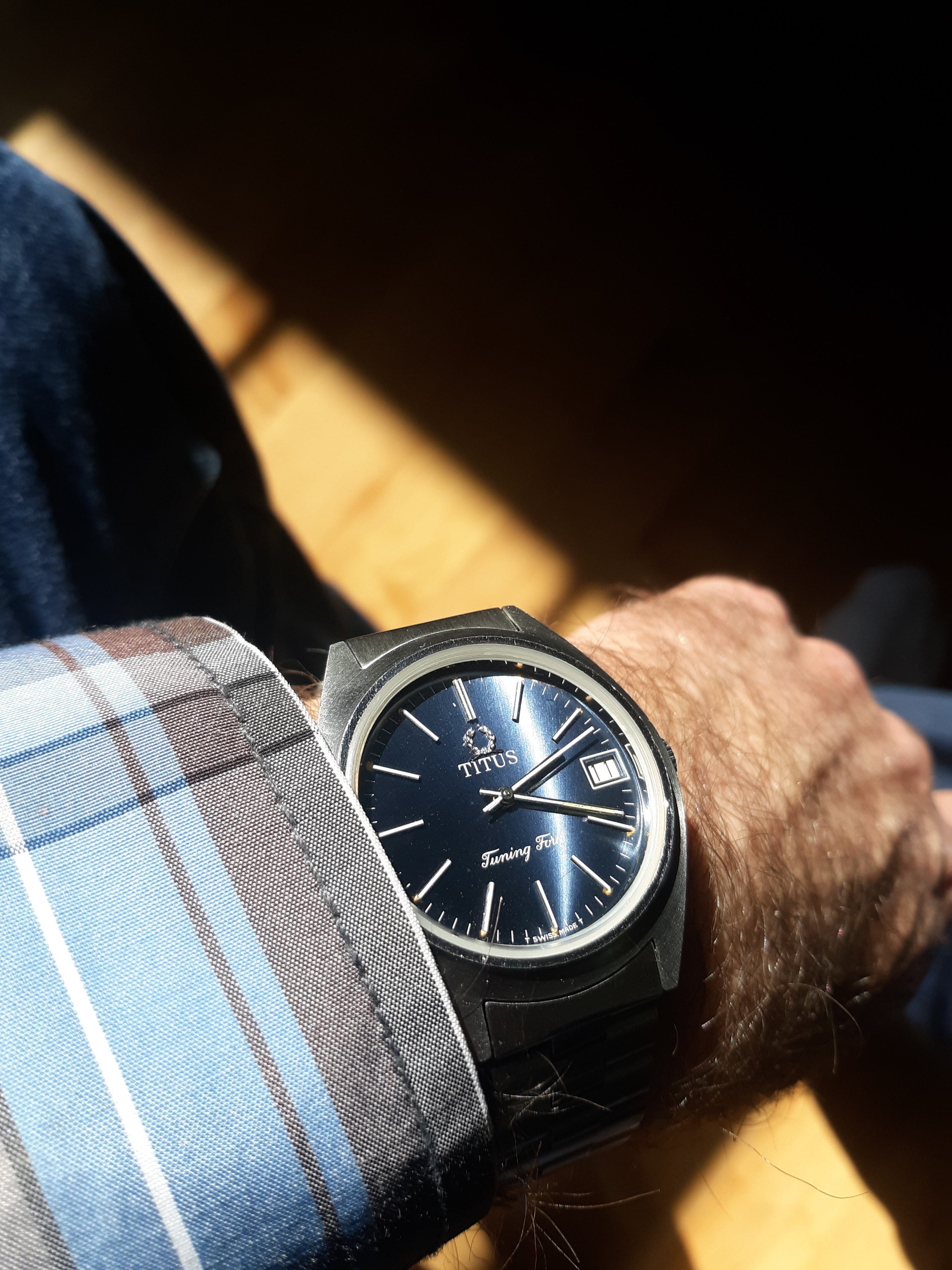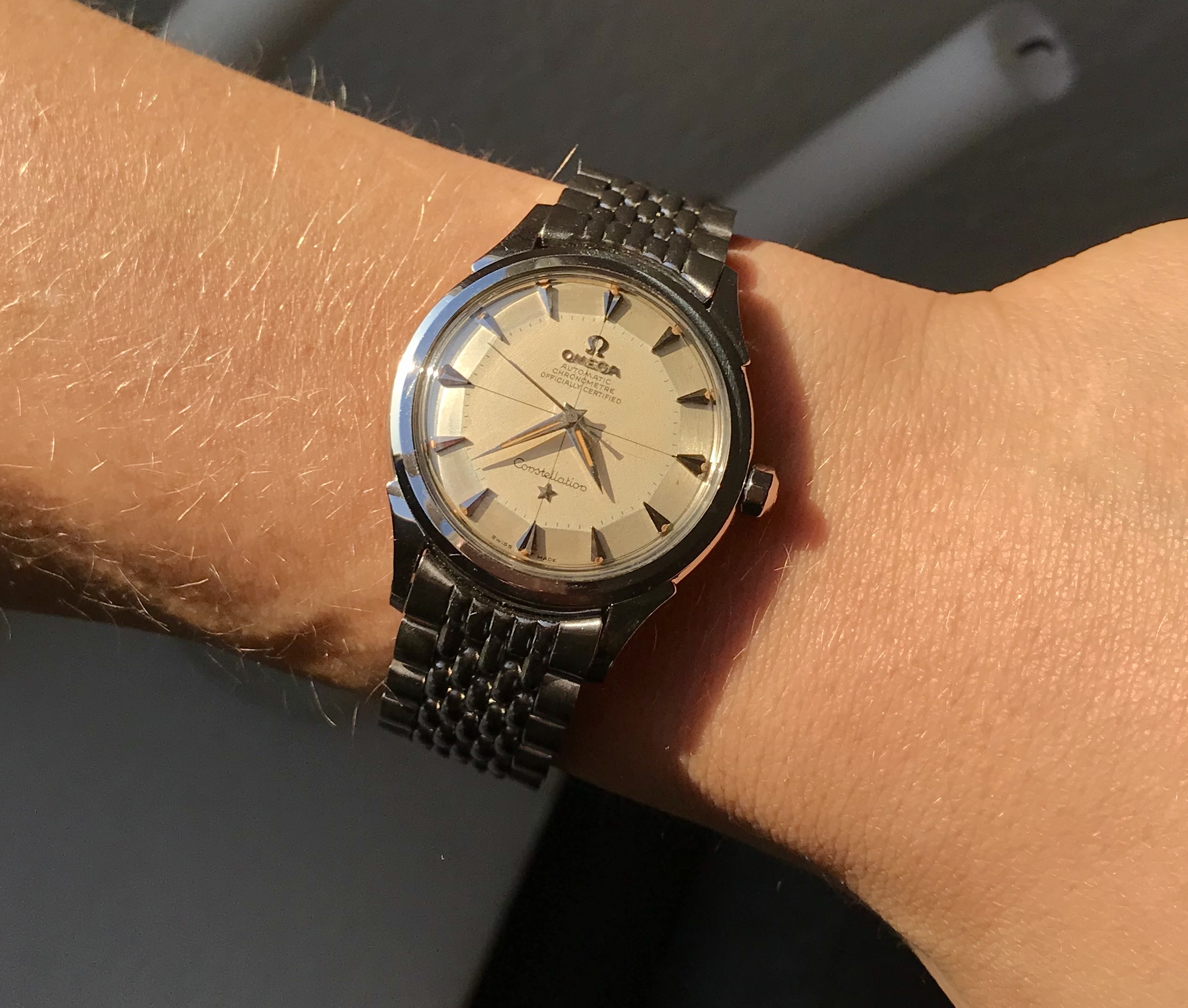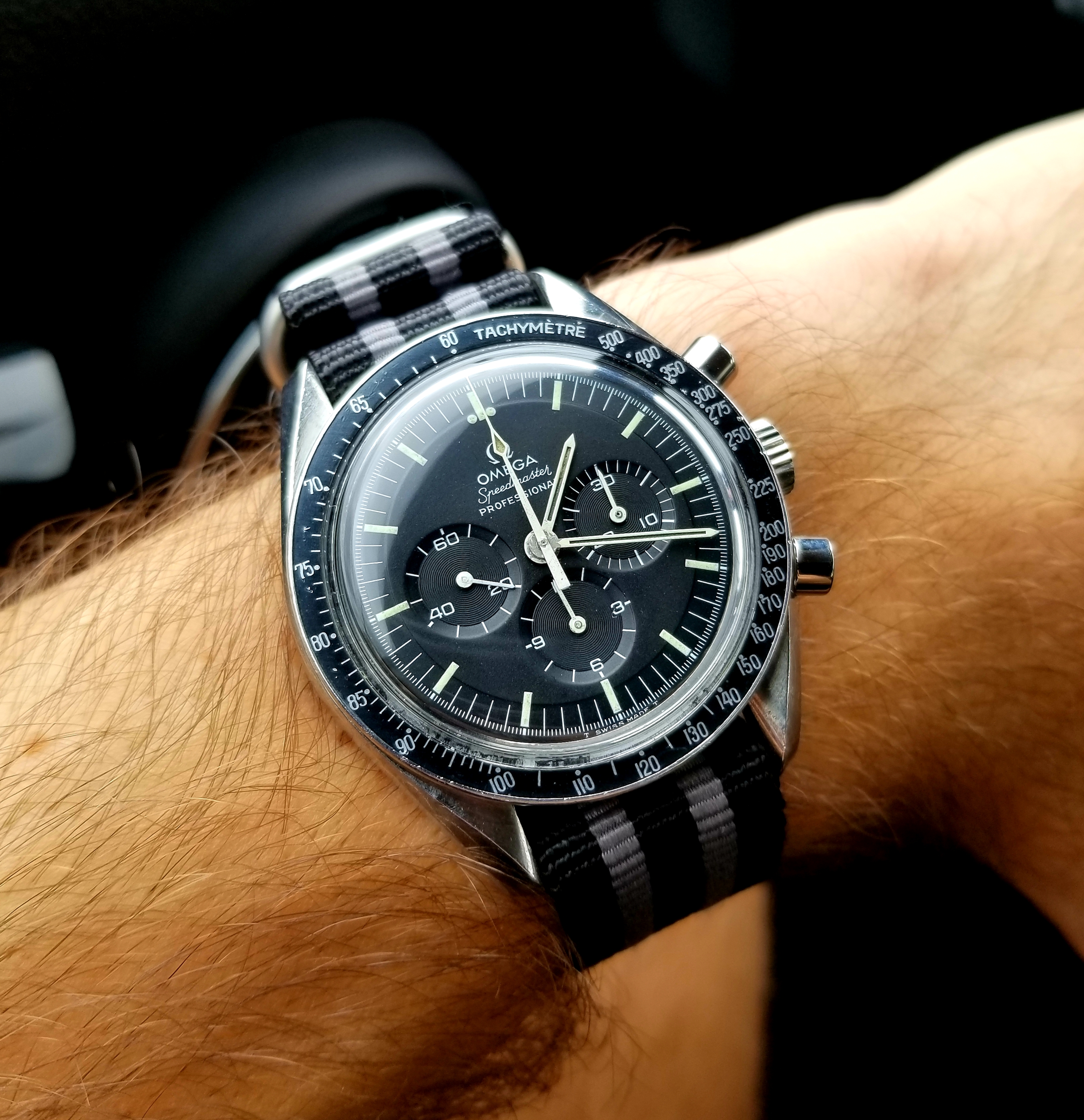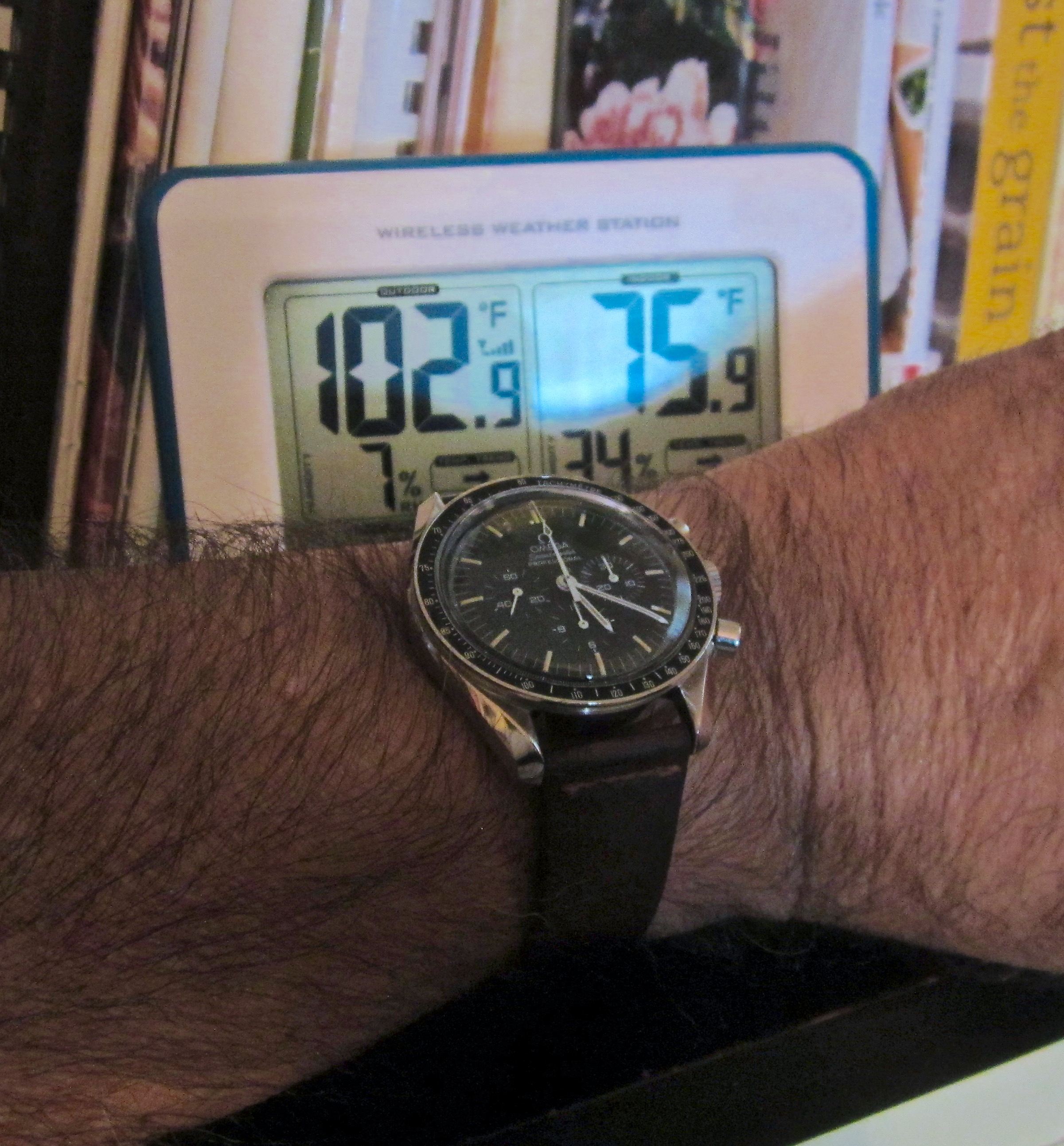 Speedmaster attended church this morning. Due to shoulder surgery the right arm is in a rather involved sling contraption so the coat and tie were abandoned for short sleeves. Besides which, high of 100F is forecast for this part of Texas this afternoon.