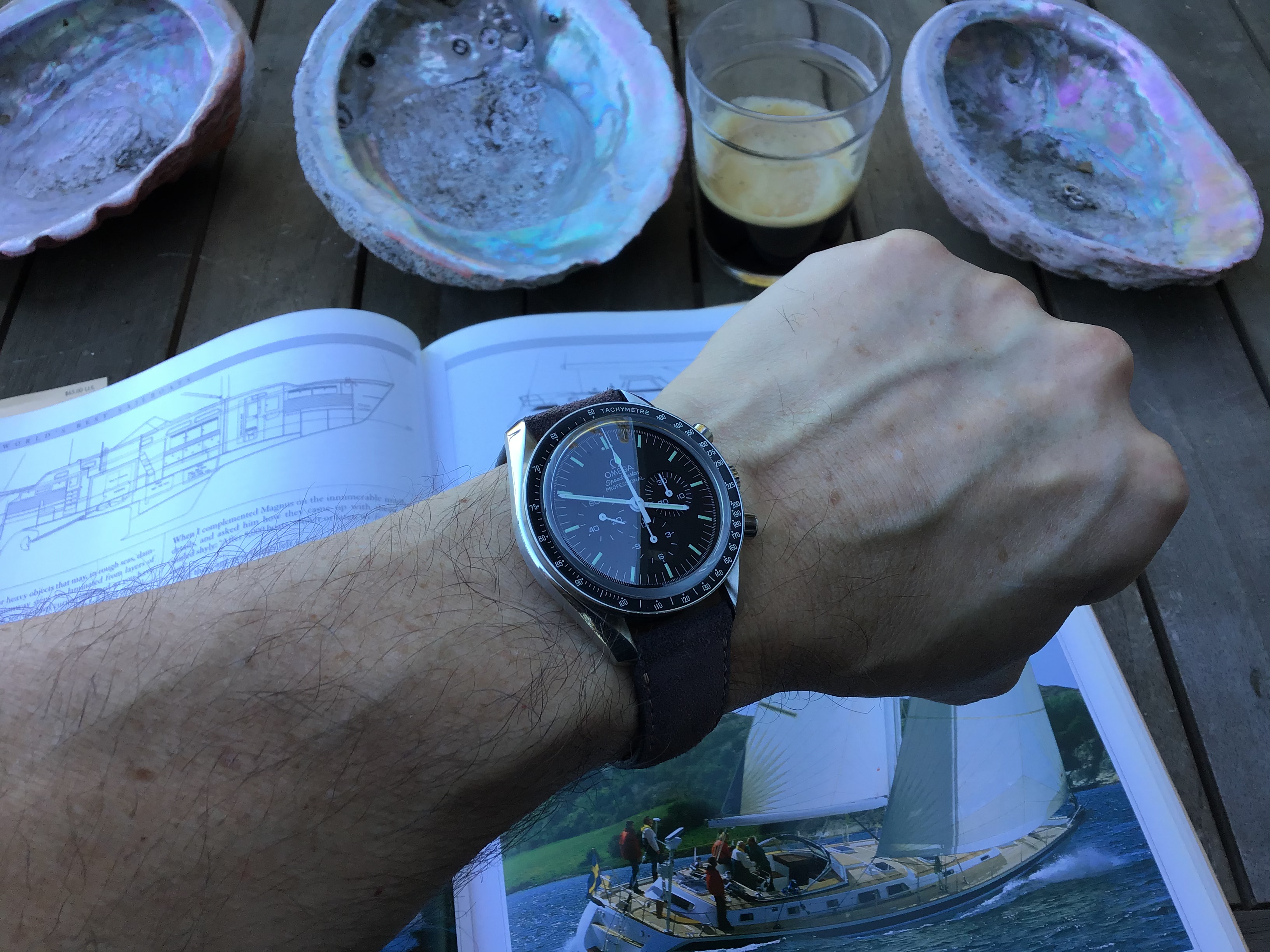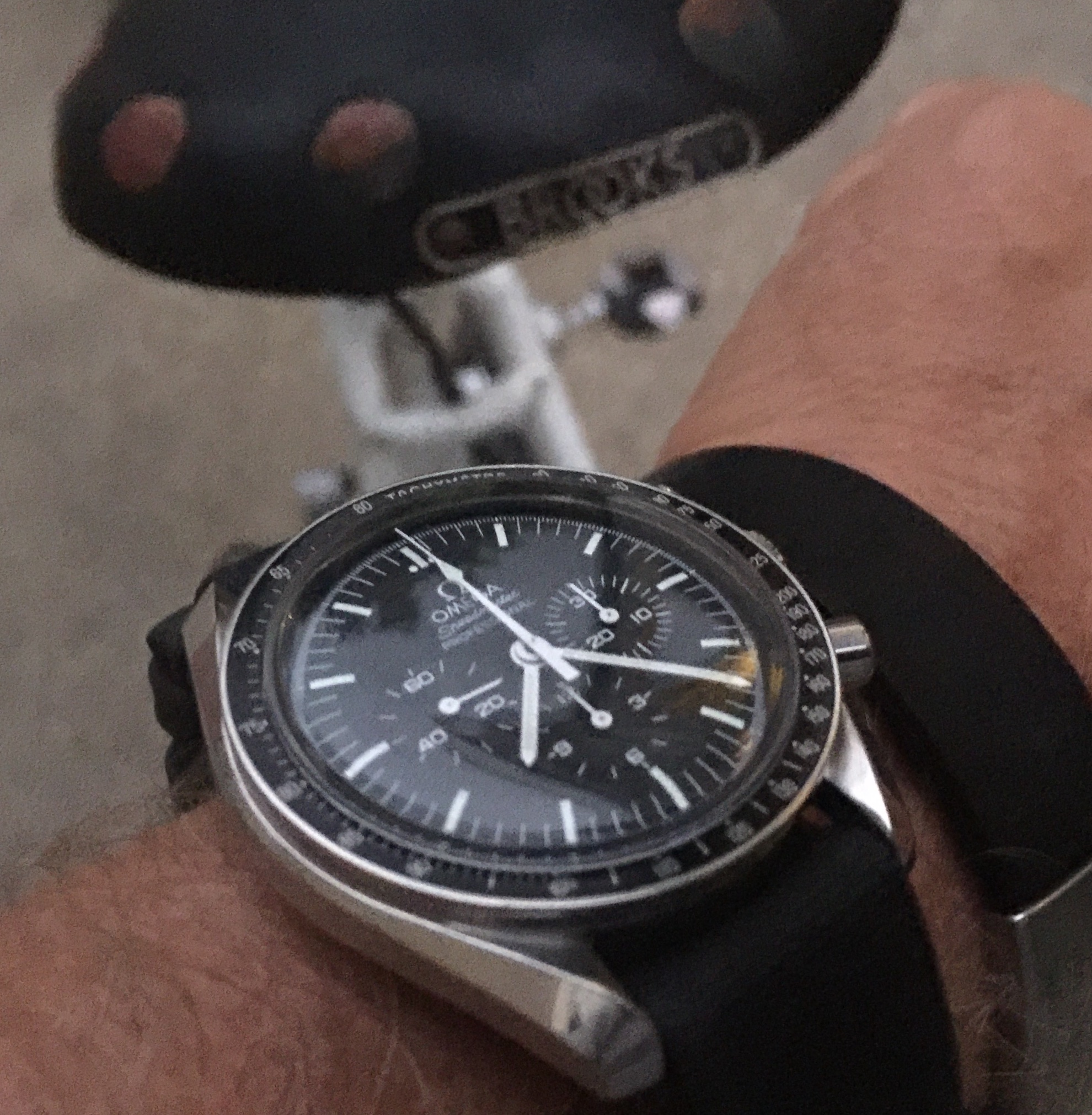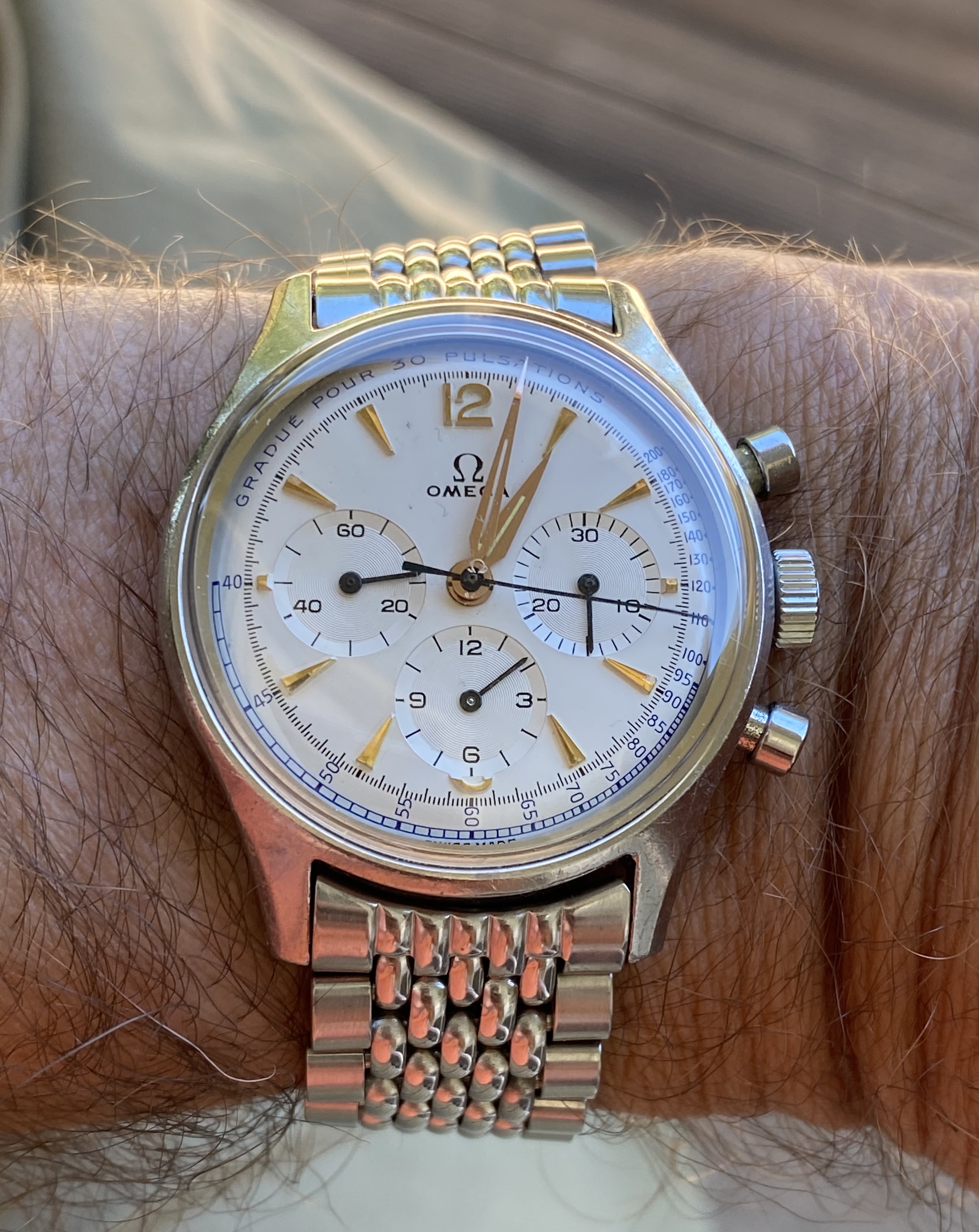 Speedmaster attended church this morning. Due to shoulder surgery the right arm is in a rather involved sling contraption so the coat and tie were abandoned for short sleeves. Besides which, high of 100F is forecast for this part of Texas this afternoon.