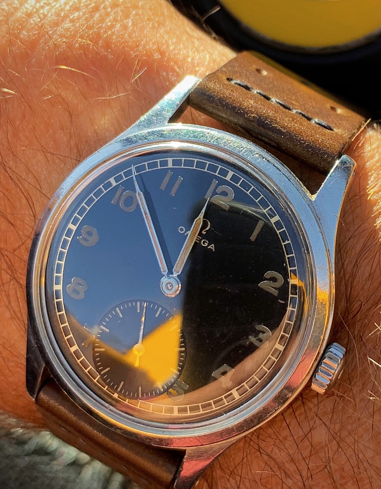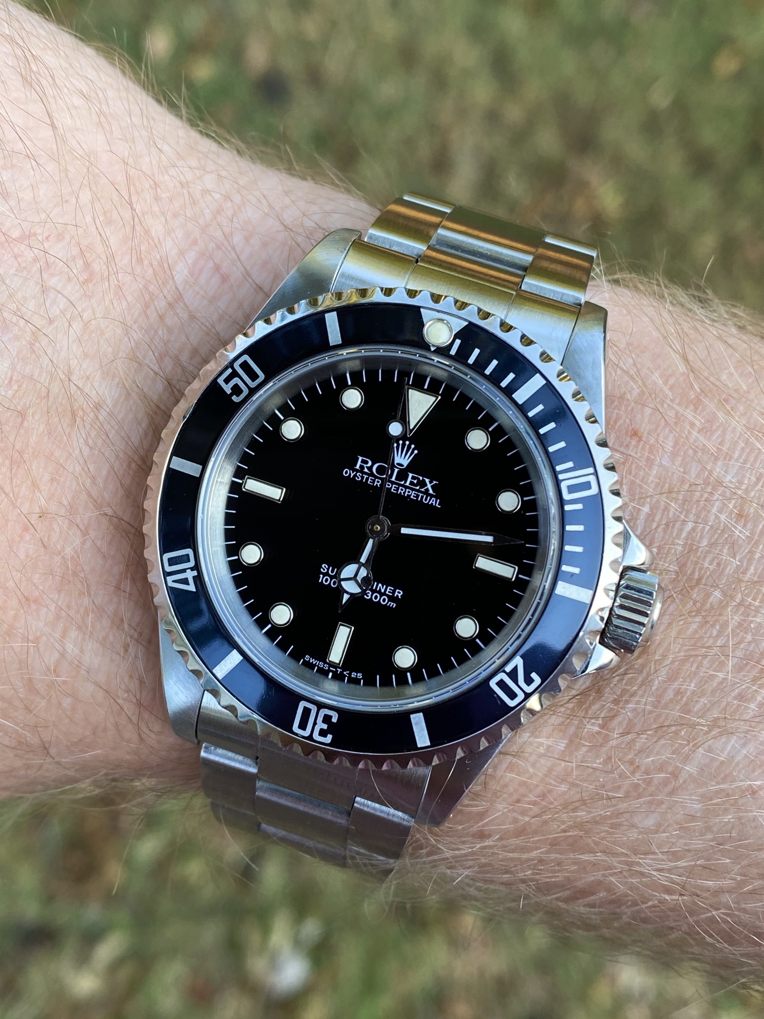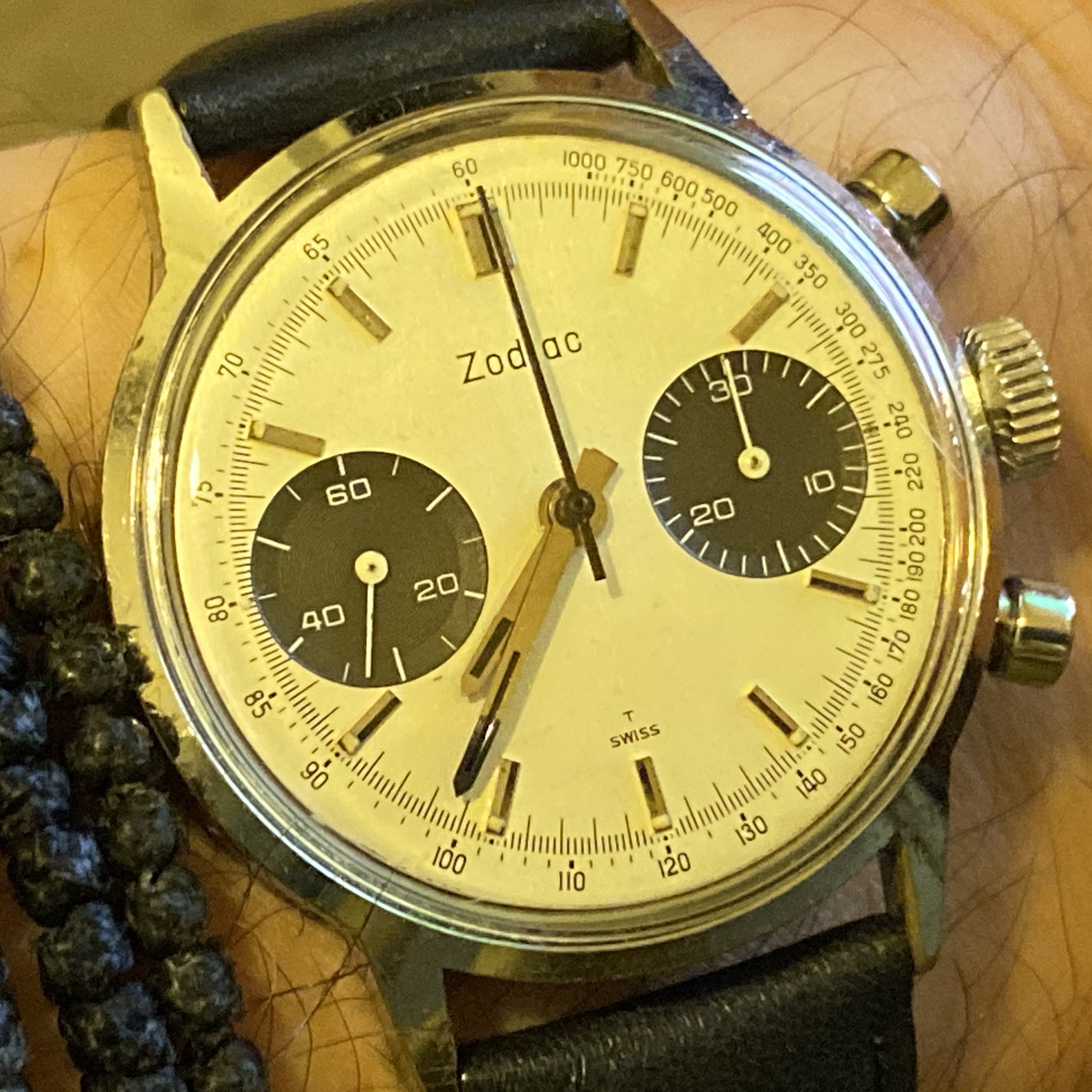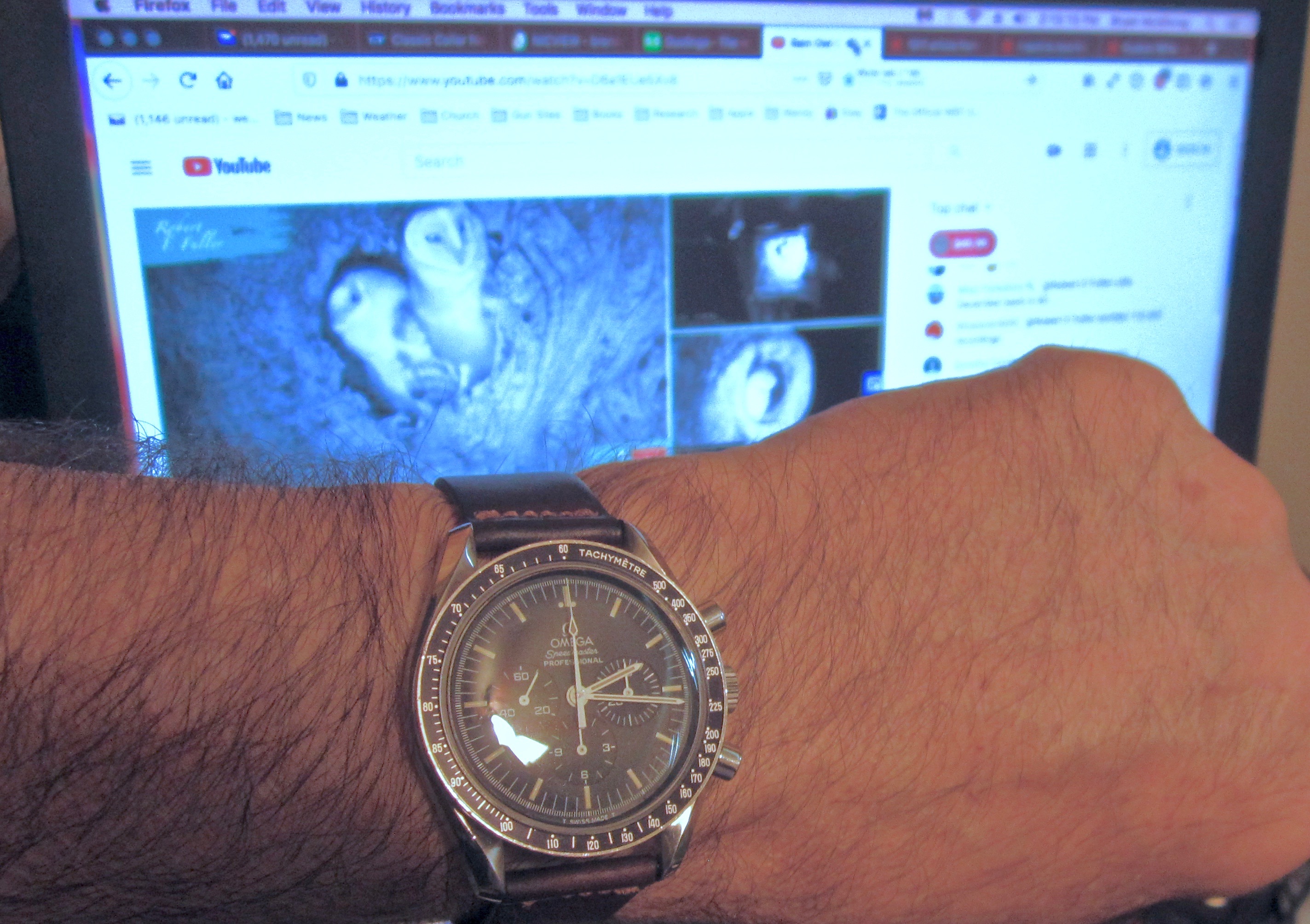 Speedmaster attended church this morning. Due to shoulder surgery the right arm is in a rather involved sling contraption so the coat and tie were abandoned for short sleeves. Besides which, high of 100F is forecast for this part of Texas this afternoon.