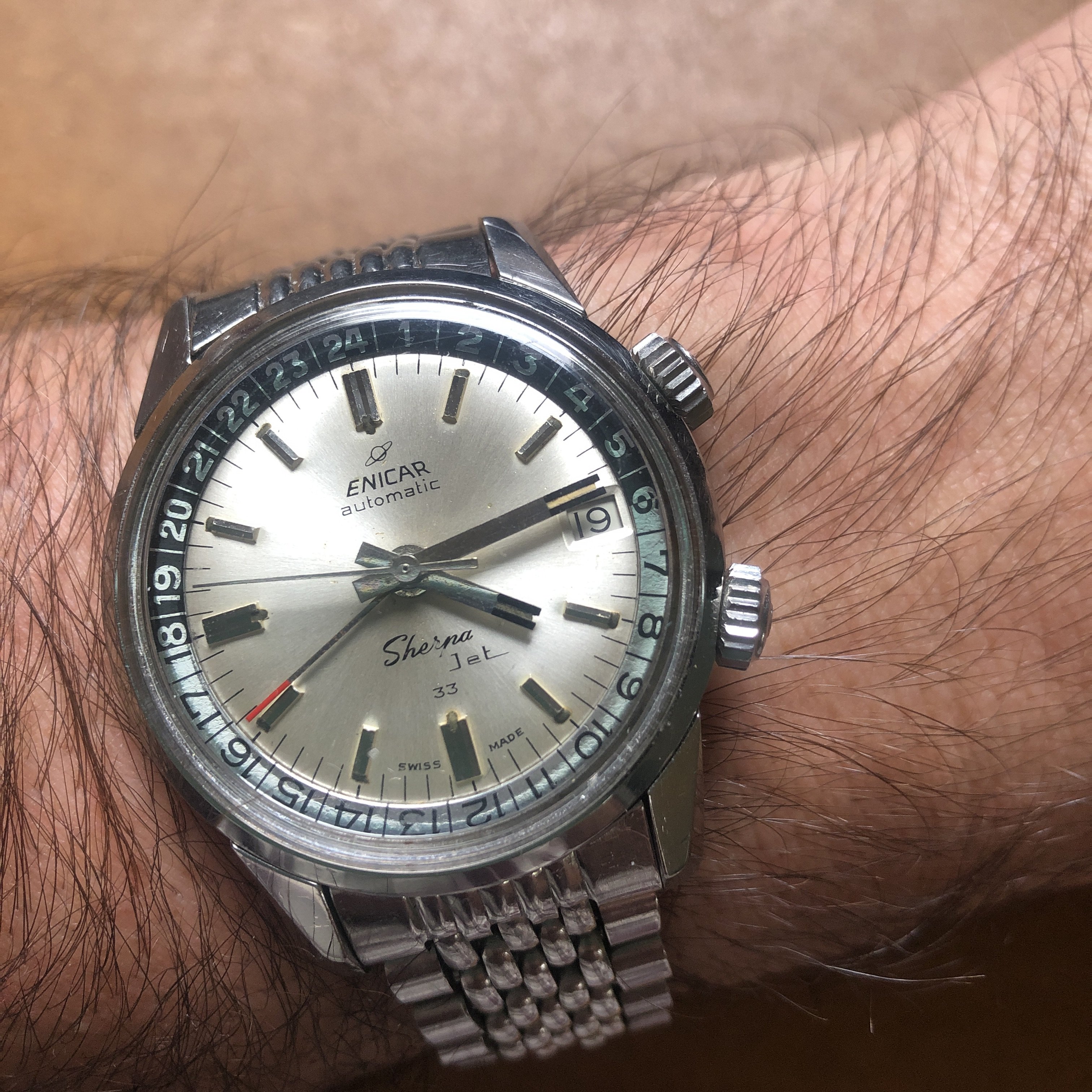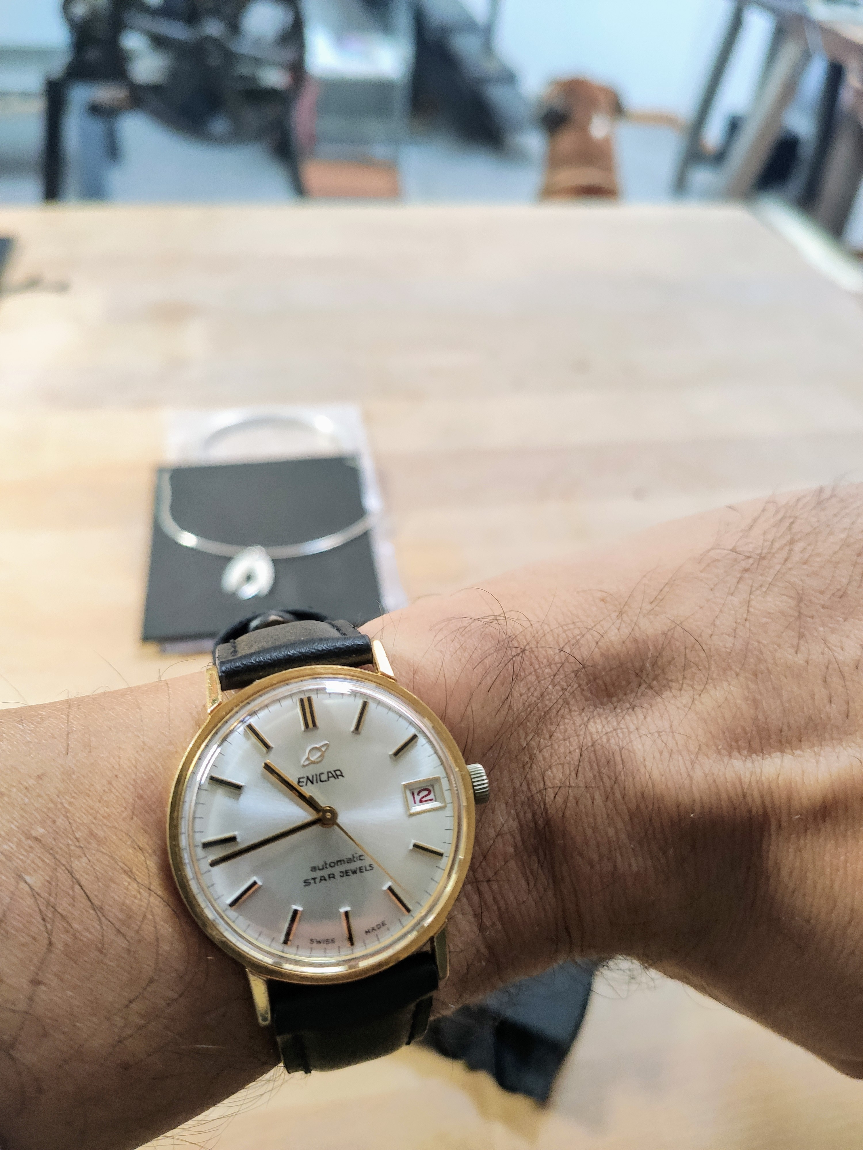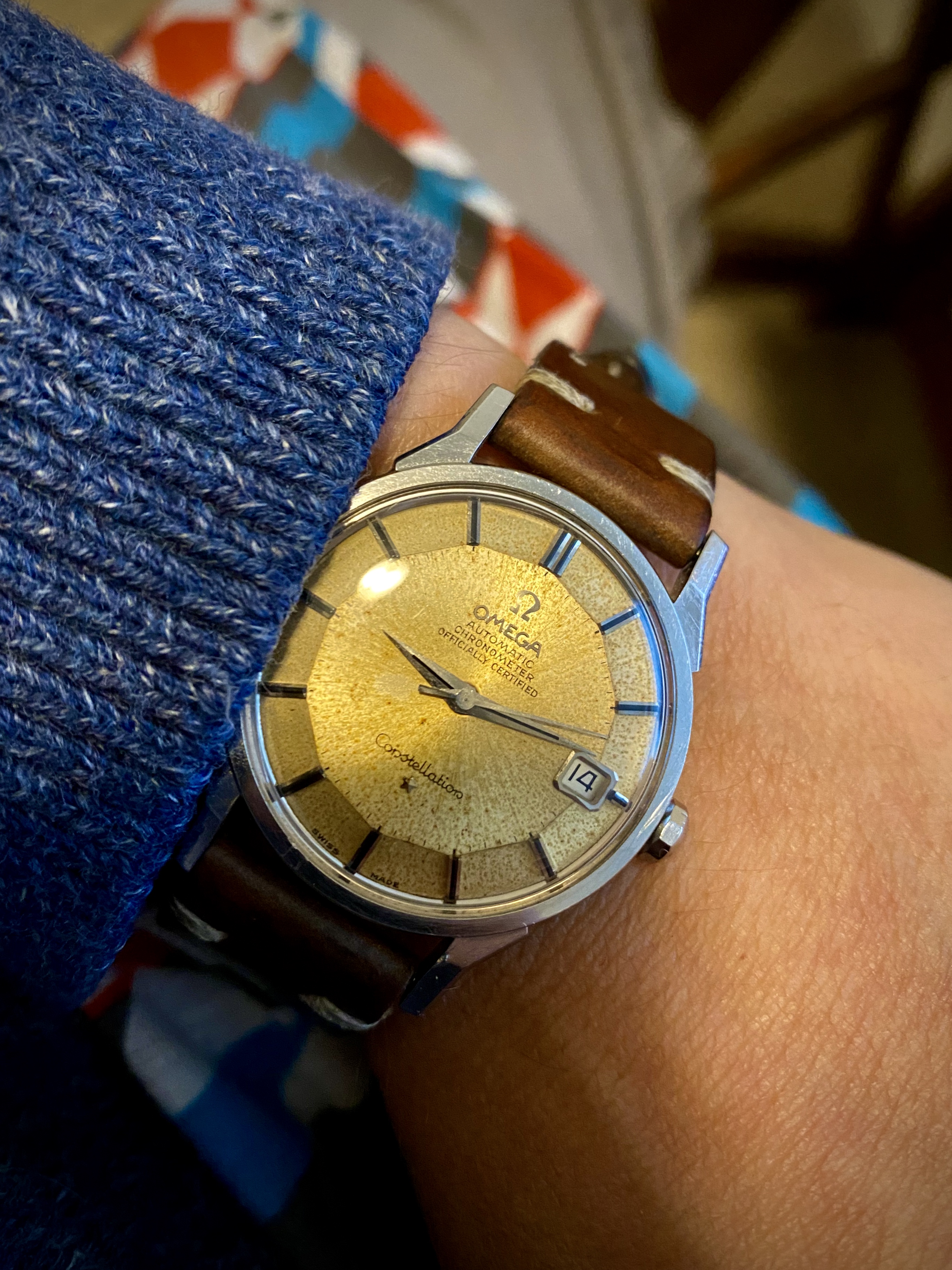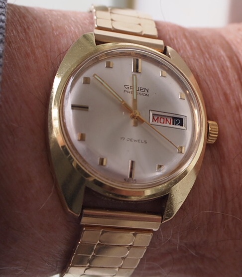 Among the things I give thanks for is having more than one watch to wear. Thanksgiving Day in Canada, today. I pulled this artifact out of my archives. Haven鈥檛 shown it here before, as I recall. Seamaster Cosmic 2000 automatic in a gold shell over steel case. Calibre 1012 movement. I am the second owner, having acquired it about 25 years ago. It has always been an erratic performer, so I went through it today, and this is its trial run. This artifact is likely from the early to mid-1970s, an era when this style of coloured dial was fashionable for men. Is there another watch company who would design and produce such a weird case. To uncase it, you remove the crown (two-piece stem), then the whole thing is pressed out of the case ring, after which you separate the case components to access the movement. A case I have never particularly liked.
