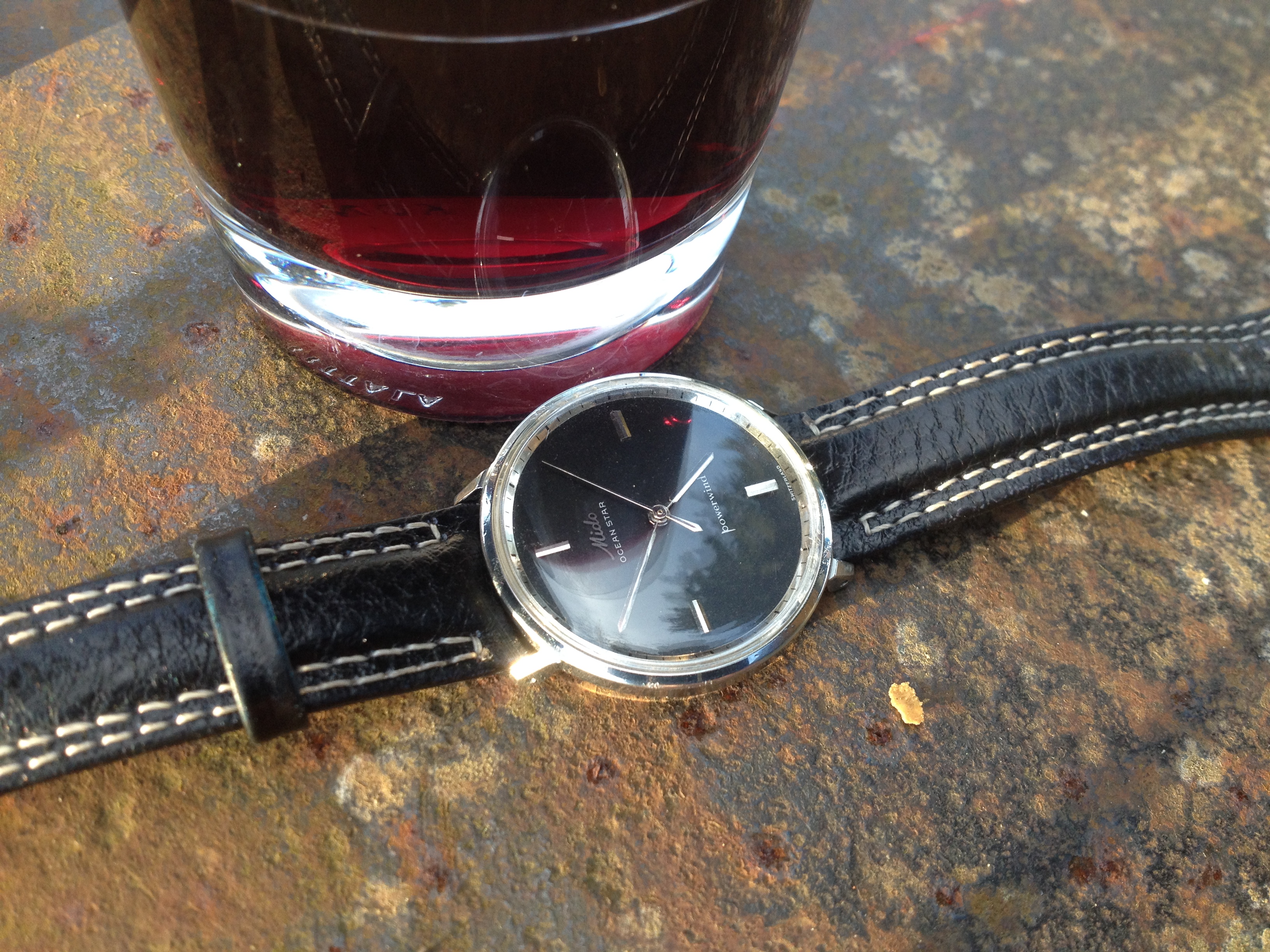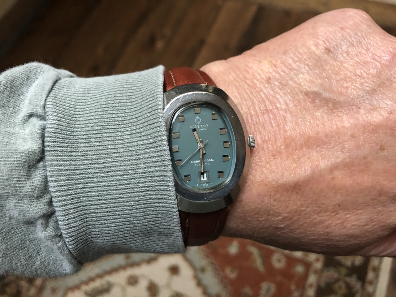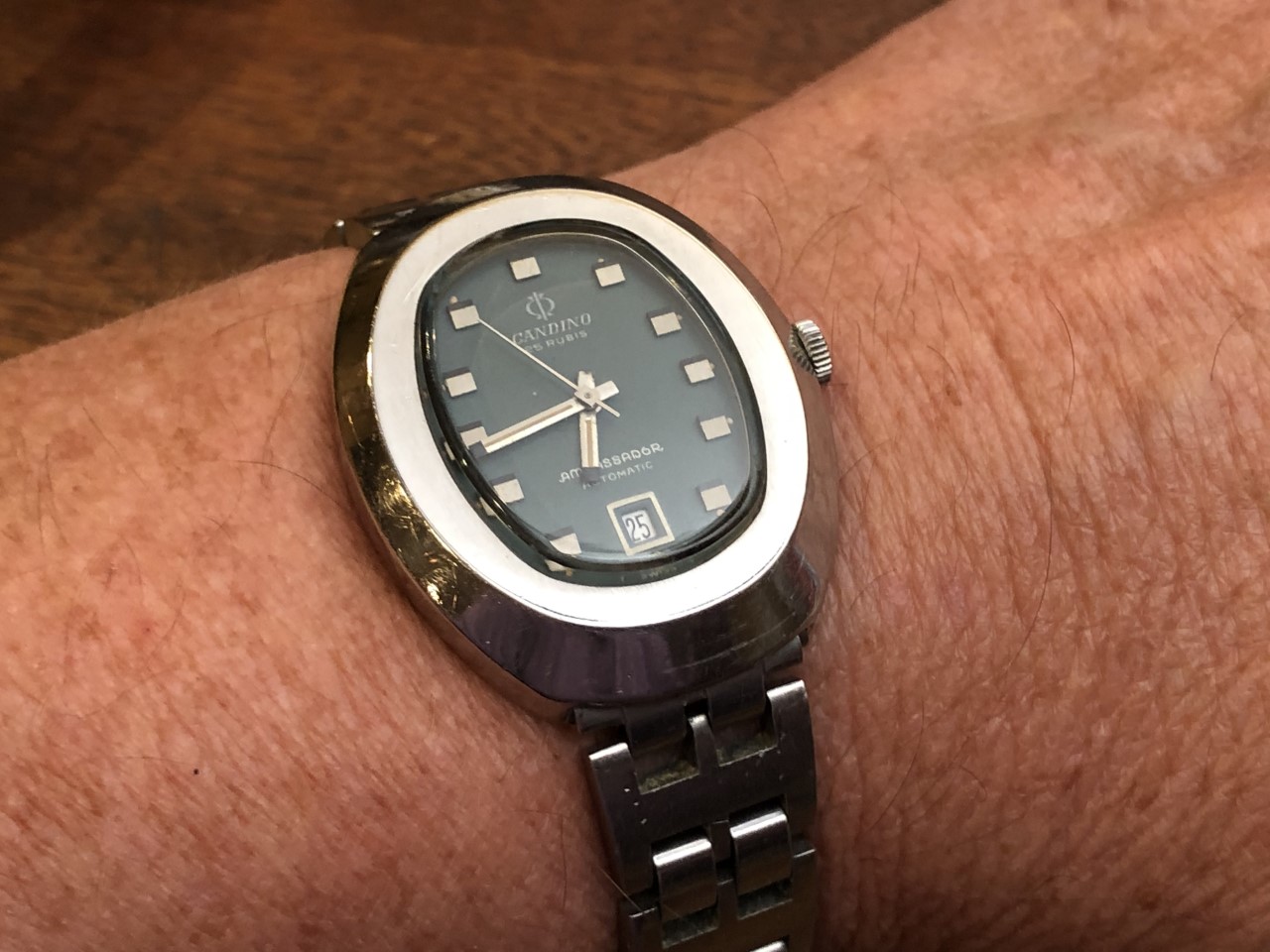 It's beginning to grow on me....this 25 jewel automatic was a "freebie" included in an auction lot I purchase for one particular watch....I know nothing about the "Candino" brand but the chunky late-'60s early-'70s case is "something different"....it's powered by an ETA 2472 that has been adjusted in six position....arrived on a JB Champion bracelet...trying it out today on a leather strap....comfortable and accurate.