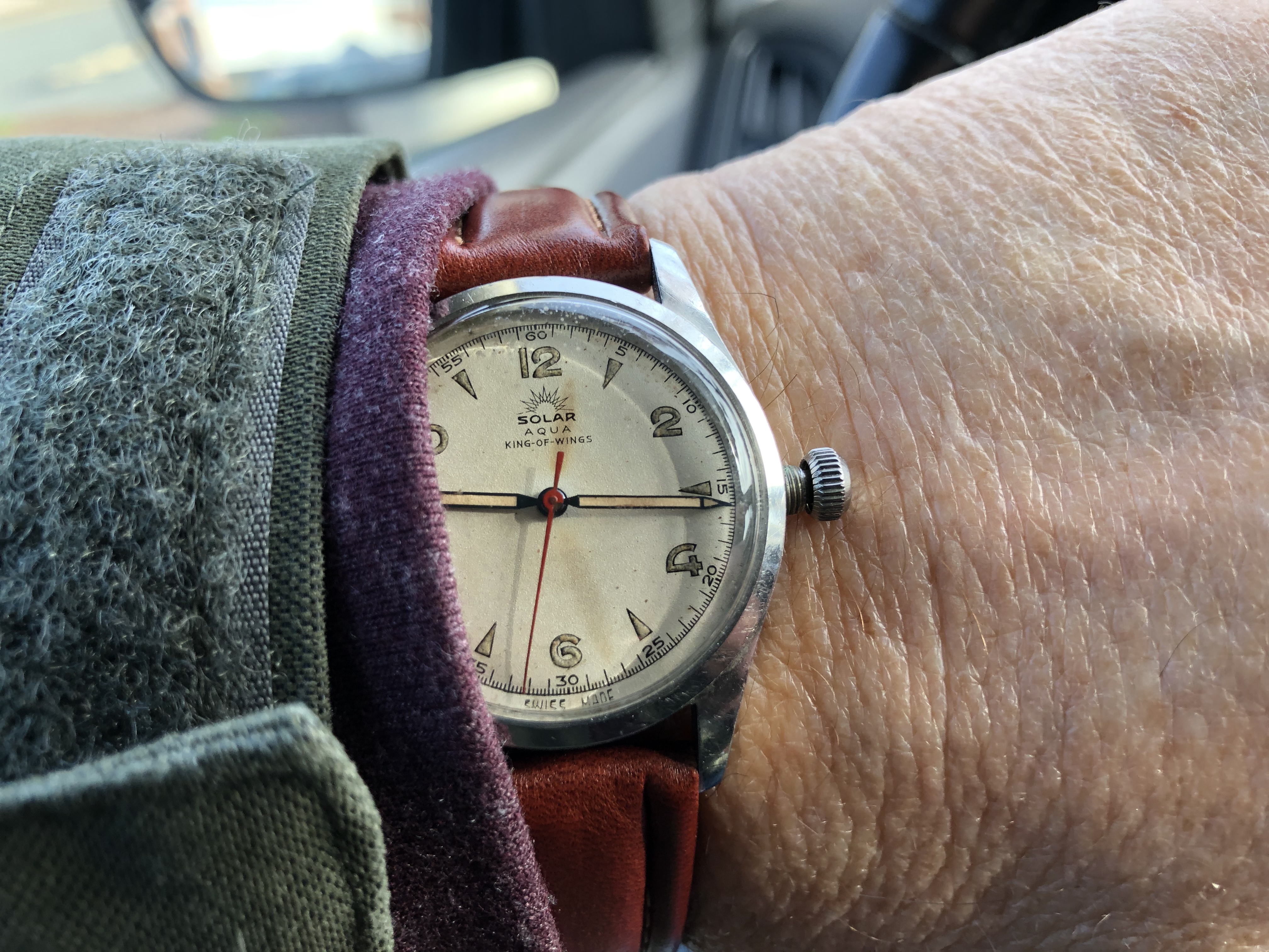Posts 1,957 Likes 25,748 allwoundup ·Nov 3, 2020 Early ‘40s Solar “King Of Wings”....Canadian retailer in-house brand Tudor/Rolex Oyster.