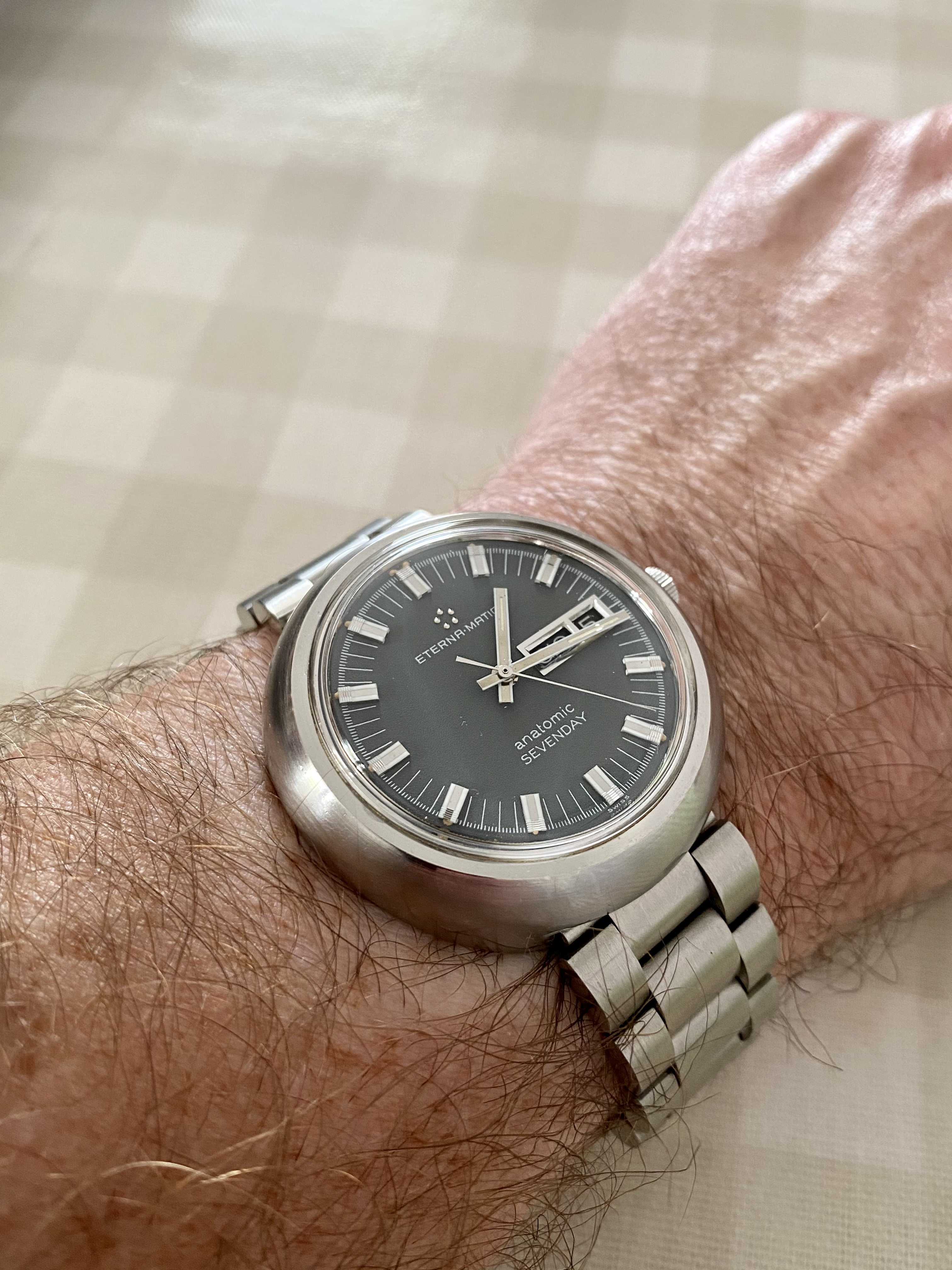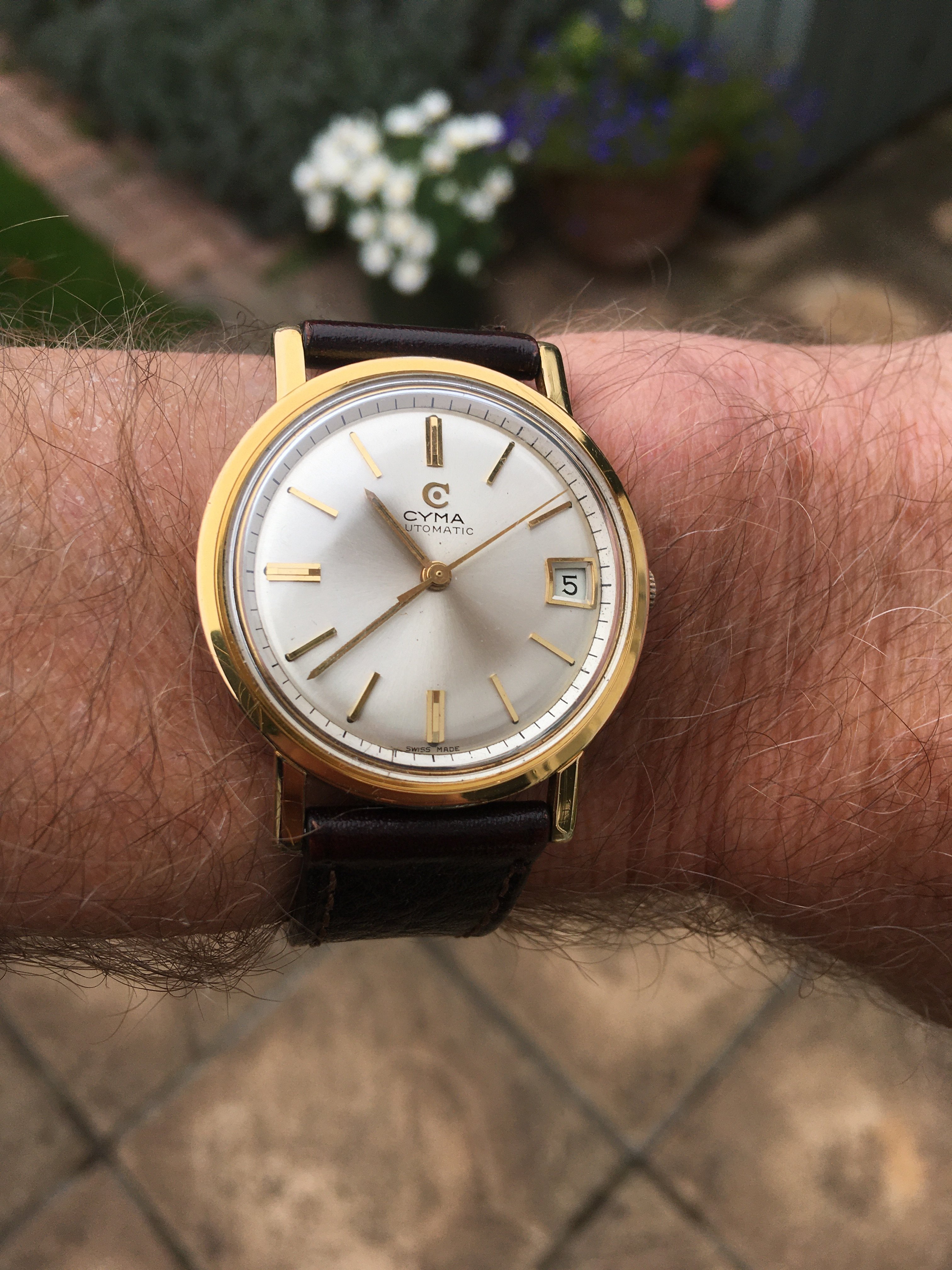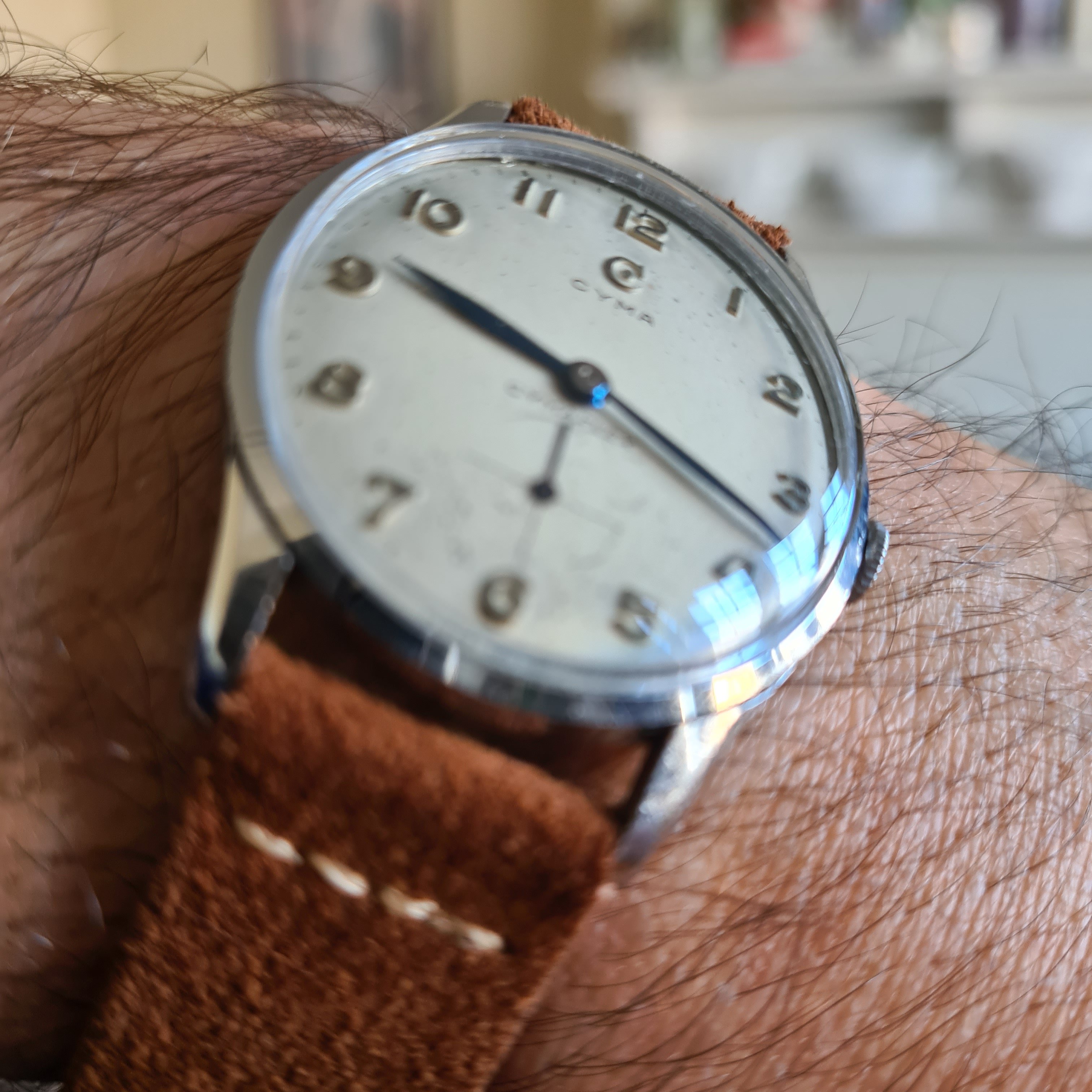 During lockdown I have found myself logging into televised auctions from Salerooms all around the UK. I find it interesting and its also educational as I can see which watches are selling for what price. Last week I tentatively bid for a quite unremarkable Cyma Cymaflex. I was the only bidder and I got it for under the estimate. The only problem was when it came to shipping the watch the auction house would only use their own couriers! This, as you can imagine was quite expensive and so my little bargain Cyma was suddenly not as much of a bargain as I thought. In addition to this I didn't even know what the mechanical condition was. What a fool I am. Anyway the watch arrived and I am pleased to say that I quite like it. Arabic numerals, blued hands , keeps time well. Happy days. I also learned a few things about buying at auction. Things I probably could have learned without purchasing the watch but hey ho. Anyway here it is. What do you reckon?