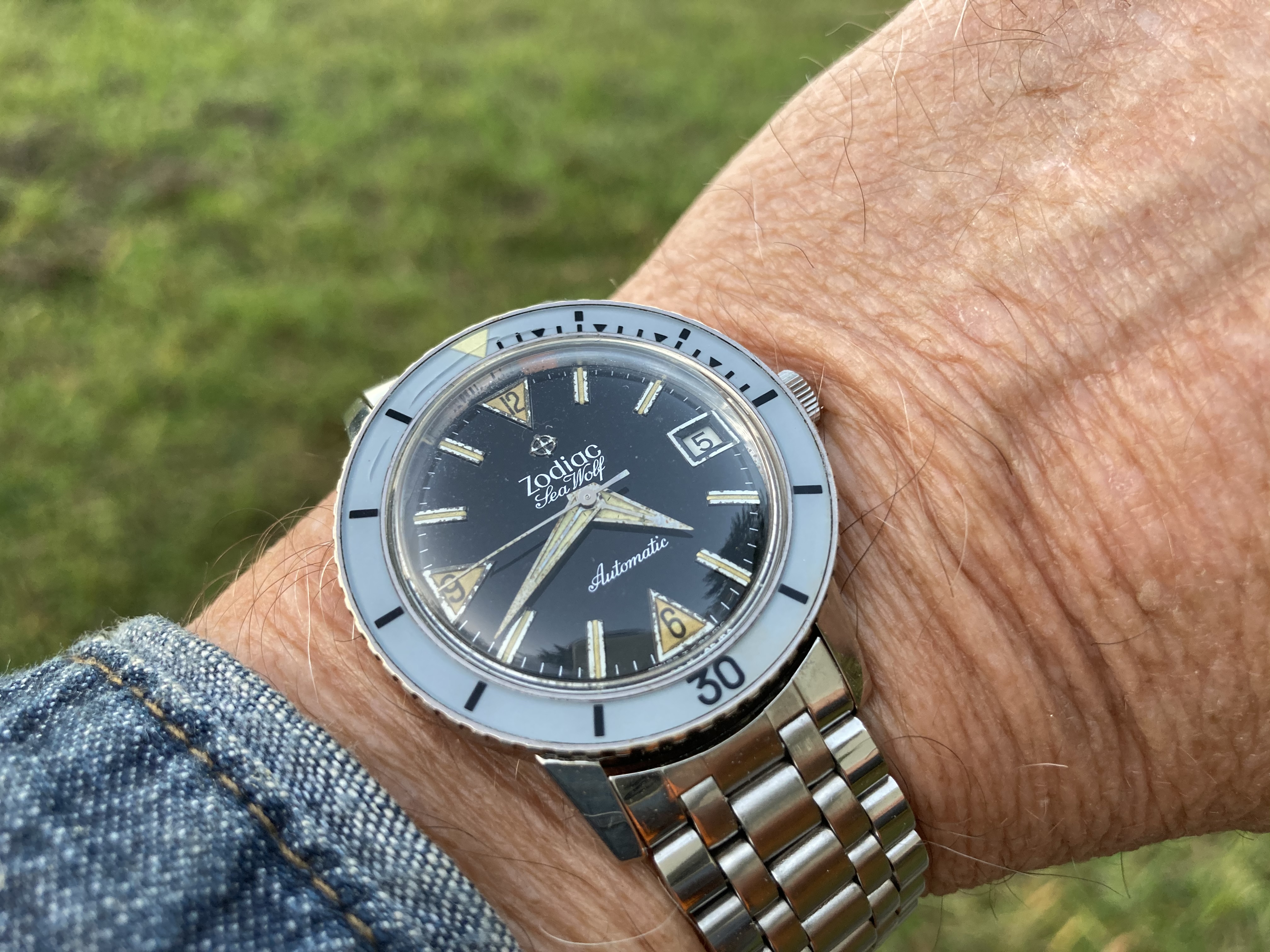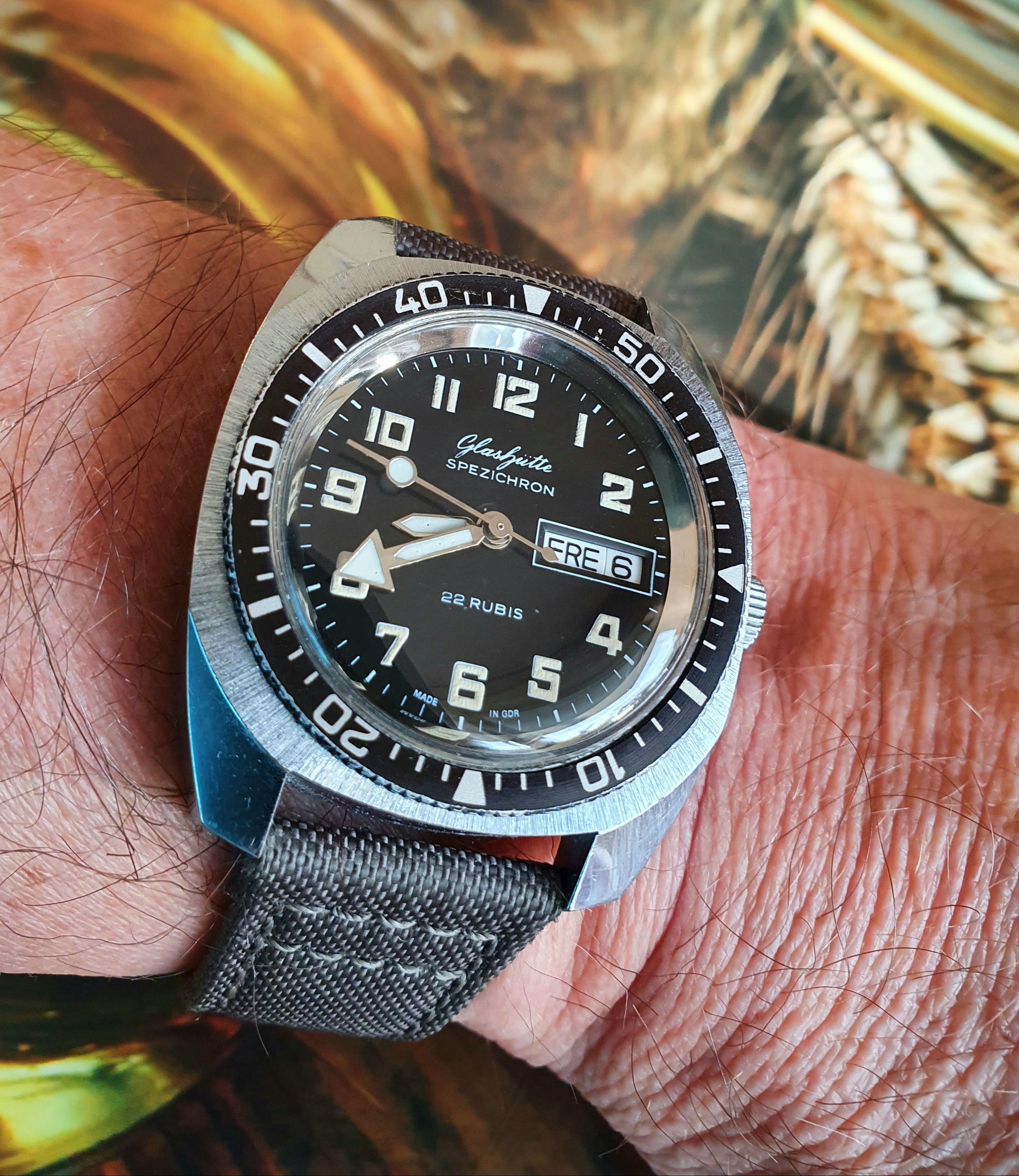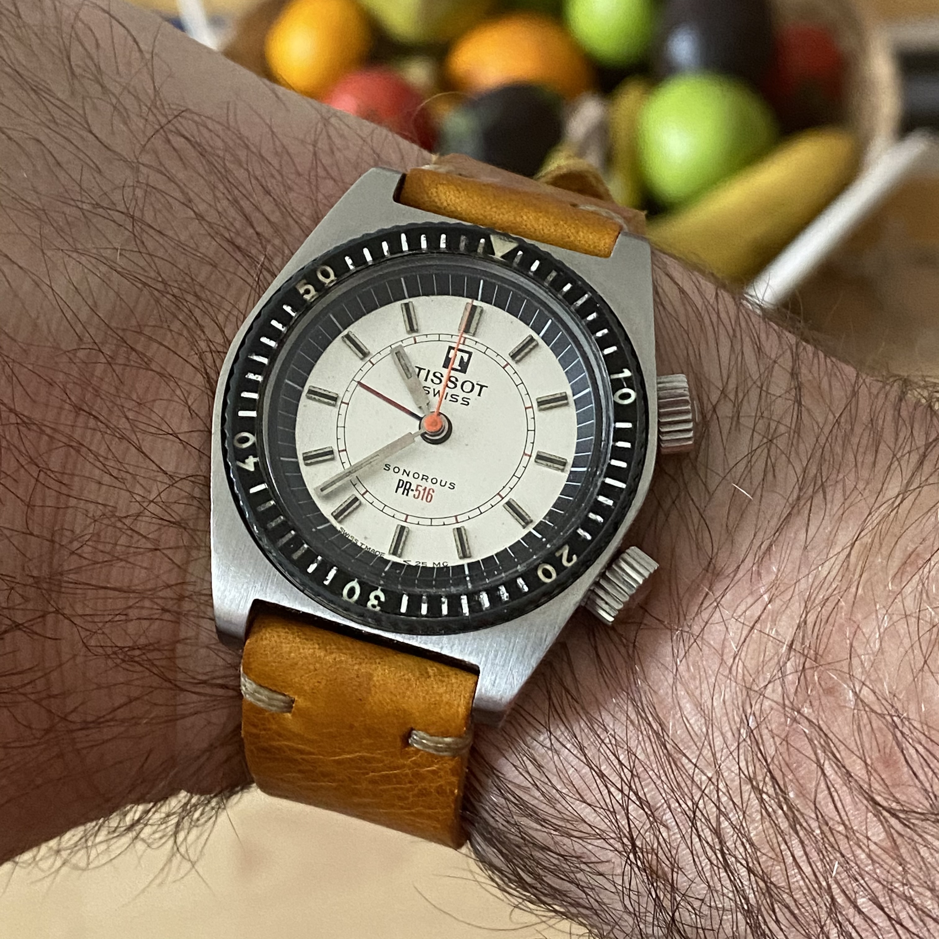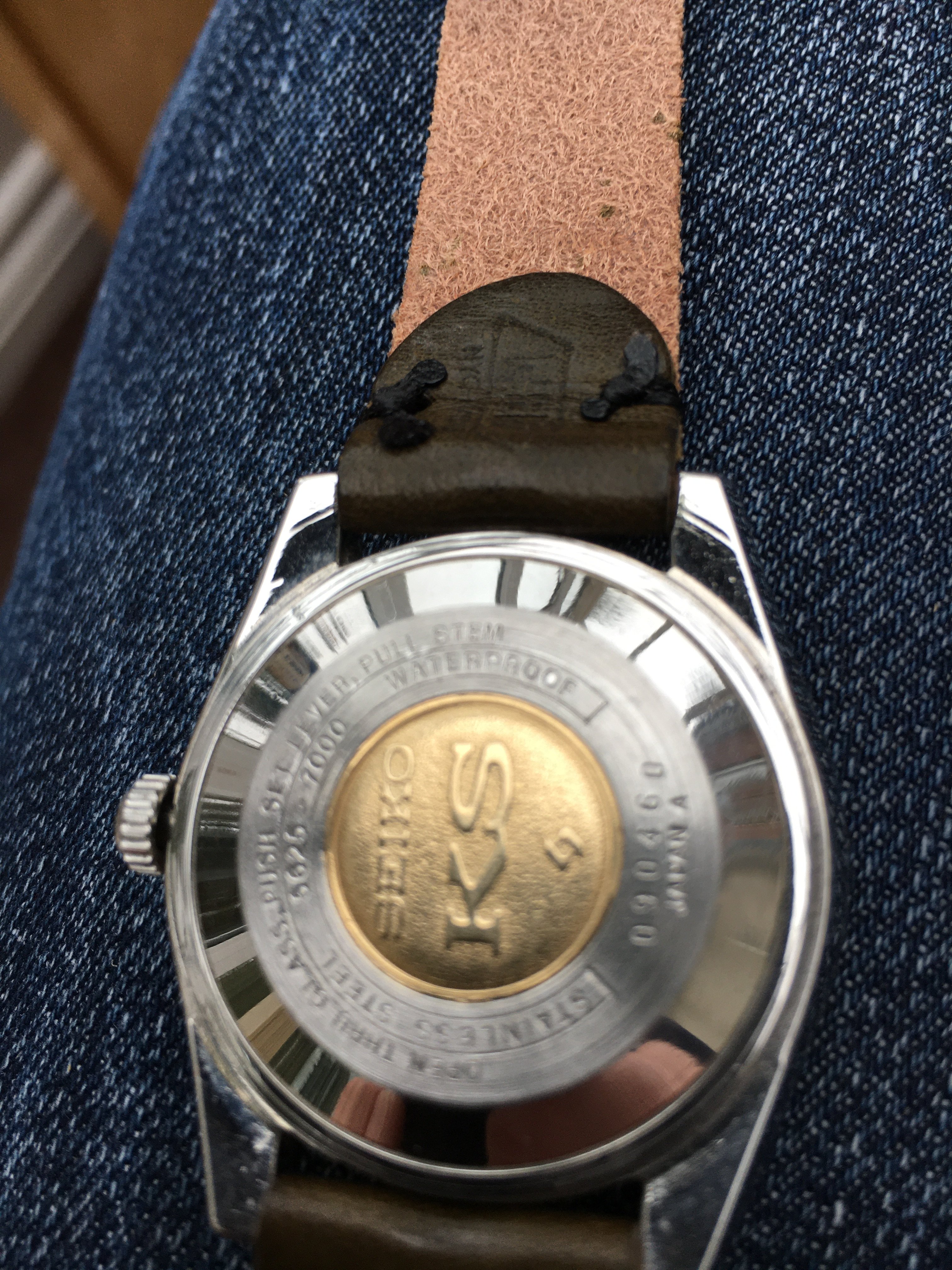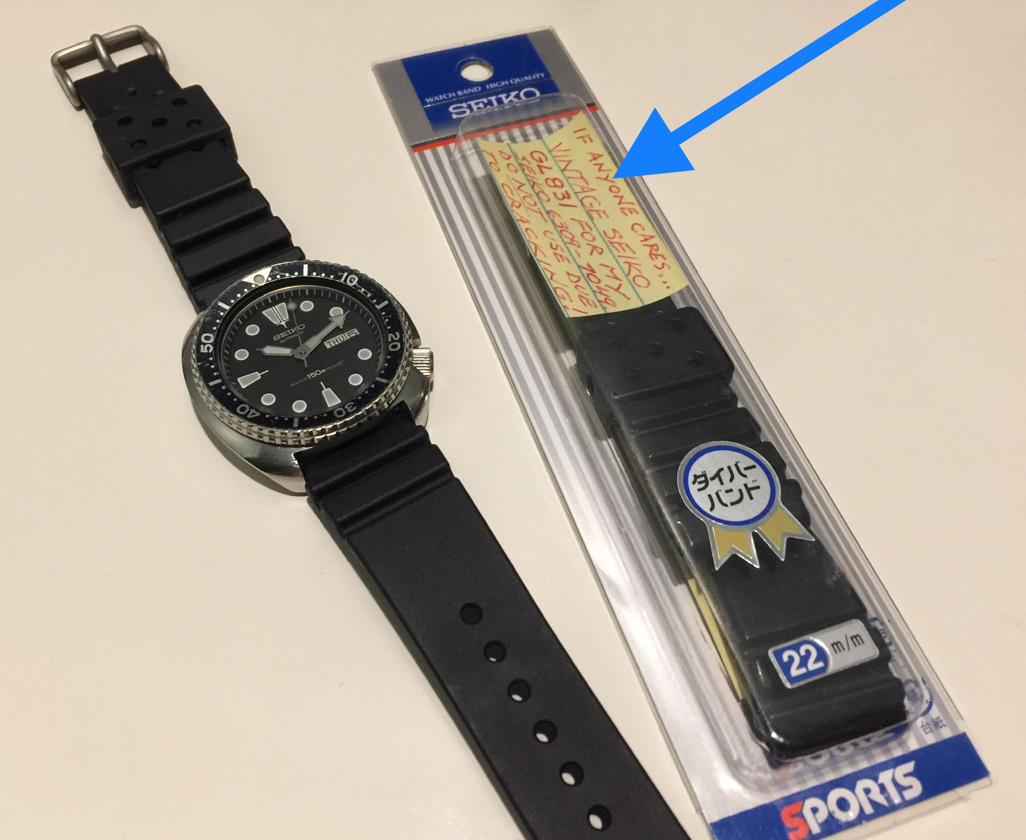 Beloved 1986 Seiko 6309-7049 on a Seiko DAL1BP replacement band for today. Also pictured is an original Seiko GL831 band that I sort of forgot I had. Can’t use the GL831...too brittle...see crack indicated by blue circle...good for “display only”...