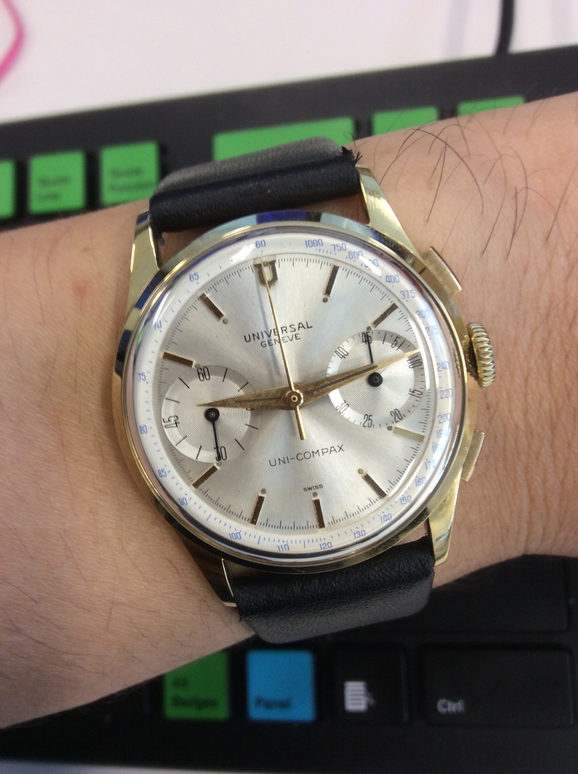 ·So, after too long, my most ambitious bit of tinkering yet. My first three register chronograph service - Lemania 1387 (Omega 681). My first replacement of a mineral crystal and I had to replace the hour recorder hand. The nearest Omega one was too light in colour so I had to mix 3 parts Humbrol 48 to 5 parts Humbrol 47 - that experiment took a few dummy runs. Also had to broach the Omega hand to get it to fit (another first)