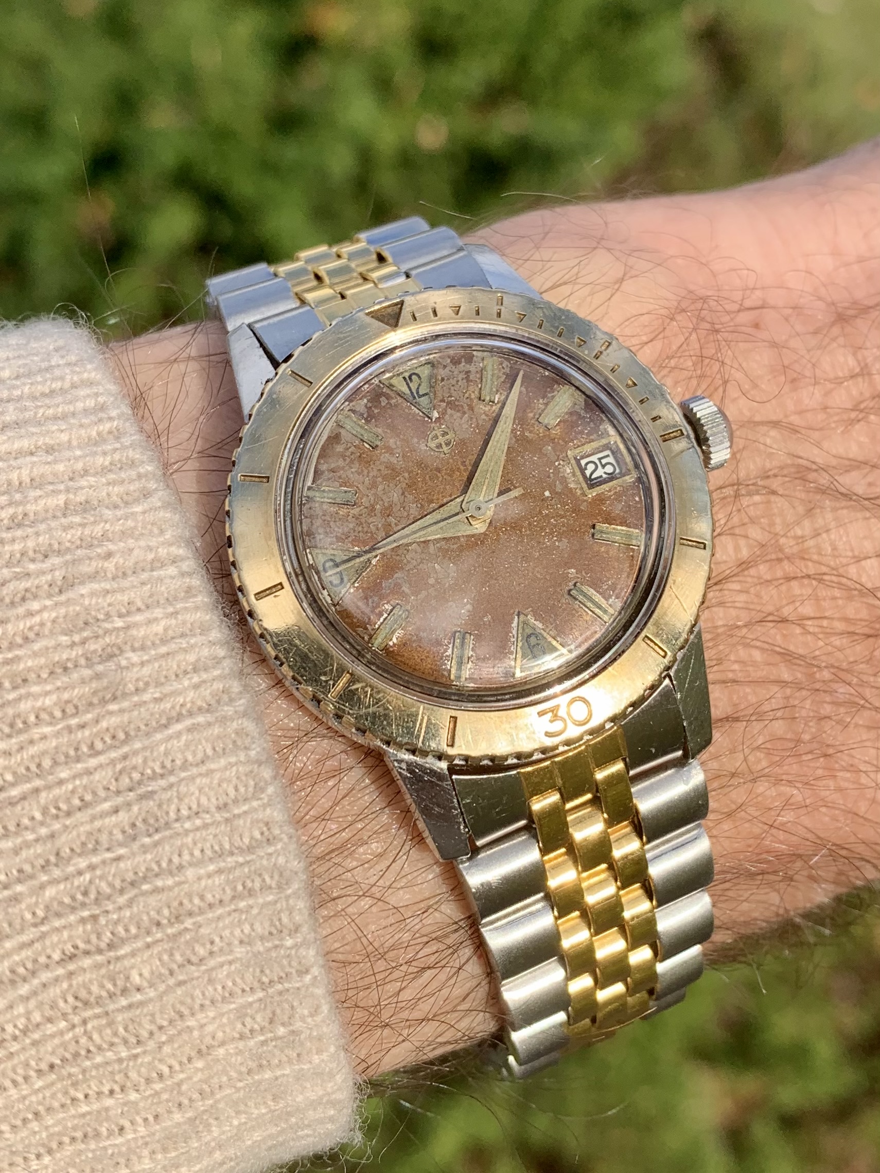 Posts 2,053 Likes 22,099 Norfolk ·Nov 25, 2020 So...tried different strap on the 69 Speedy.... and then opted for 60s TT Zodiac Seawolf with...erm...some dial patination. Honestly who needs a DateJust with this beauty?