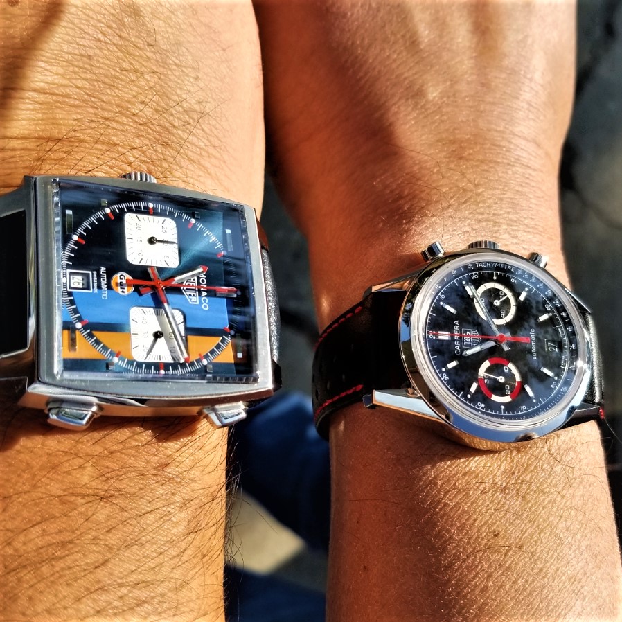 Happy Thanksgiving to those in the US. Here's a pic of my brother and I comparing watches, I much prefer my Carrera to his Monaco. Call it sibling rivalry. 👍