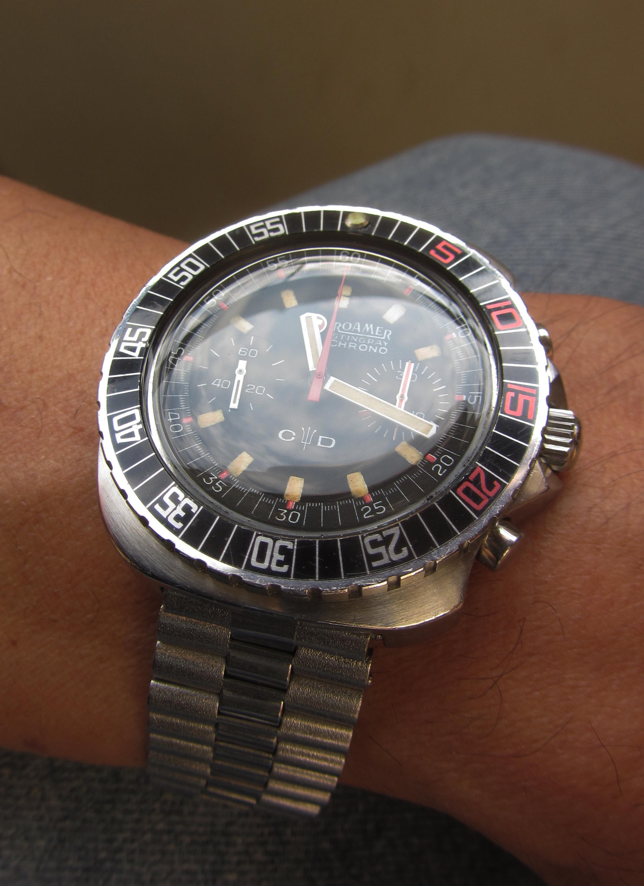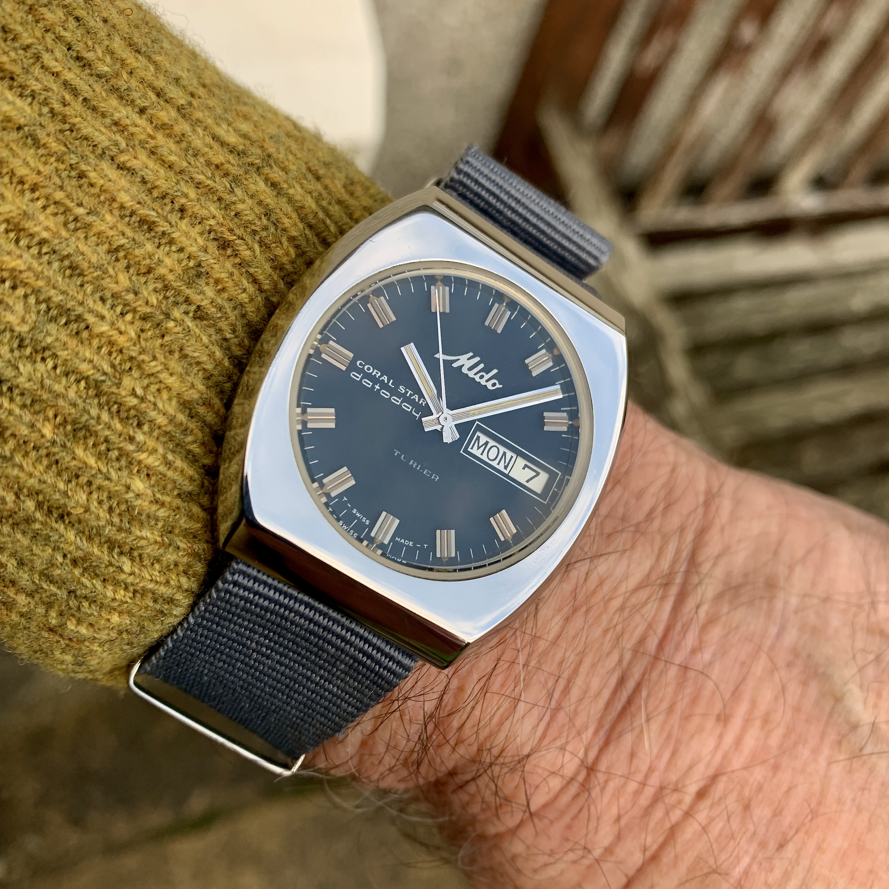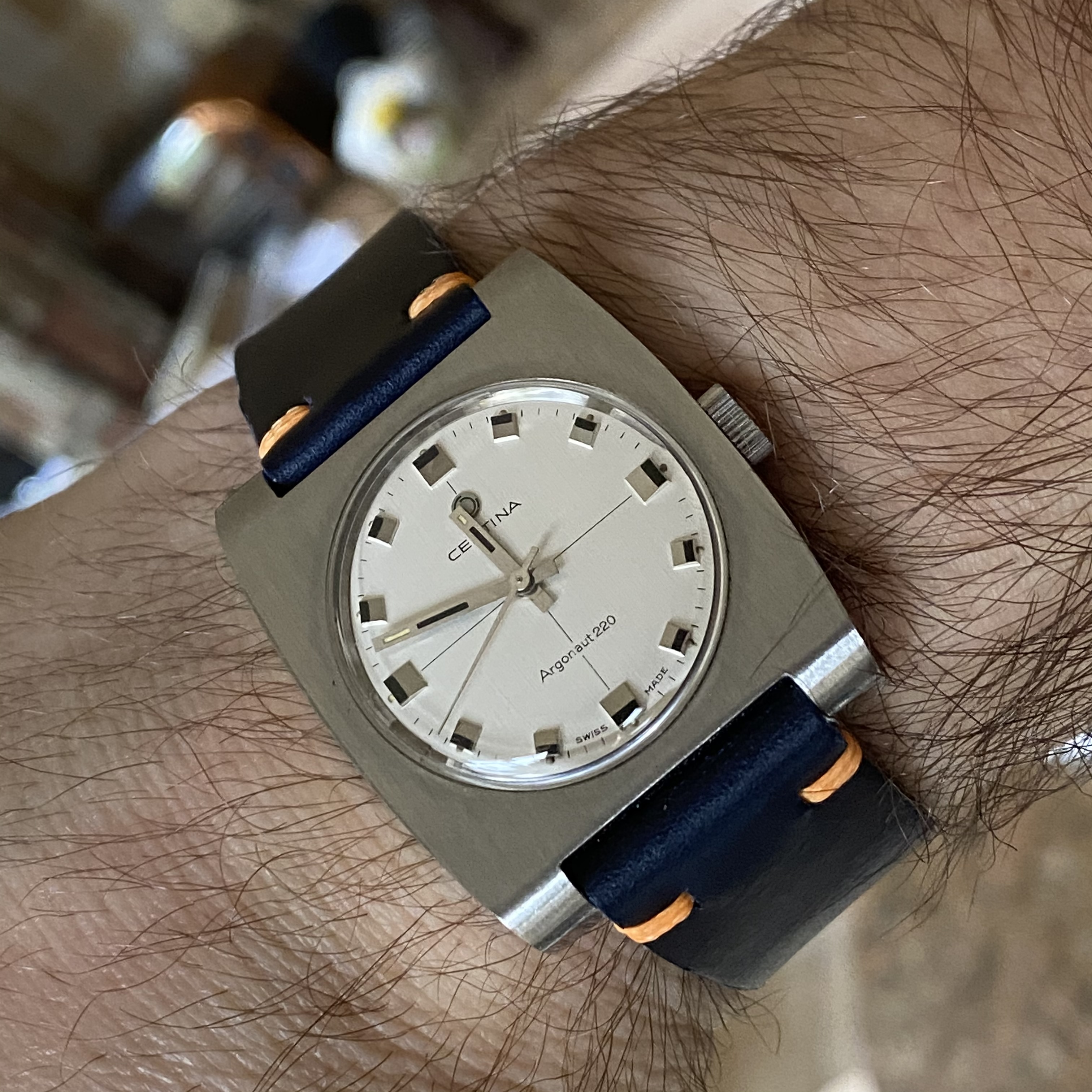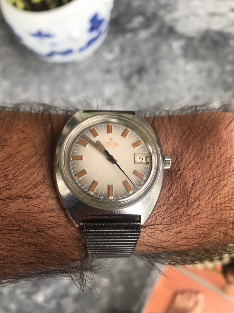 Recent pick-up of an Edox Delfin with a funky 1970s stainless steel C-case and a cream/grey fume dial with orange markers. Just back from service and the manually-wound 17-jewel AS 1951 is within 10 seconds per day after six days. Not bad...