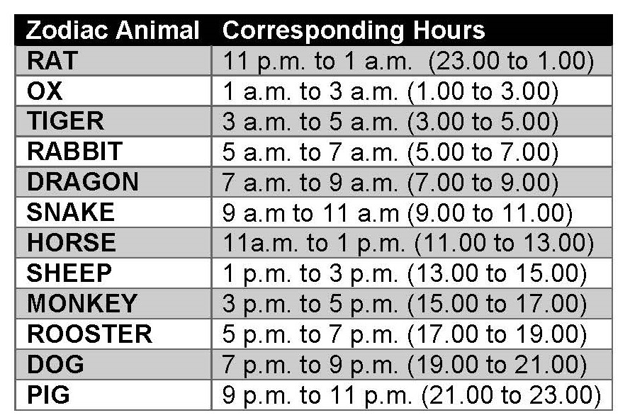 My Shi-Chen watch. The larger subdial shows Chinese zodiac hours of which there are twelve in a day. A table listing the specific zodiac symbol and corresponding times is below.