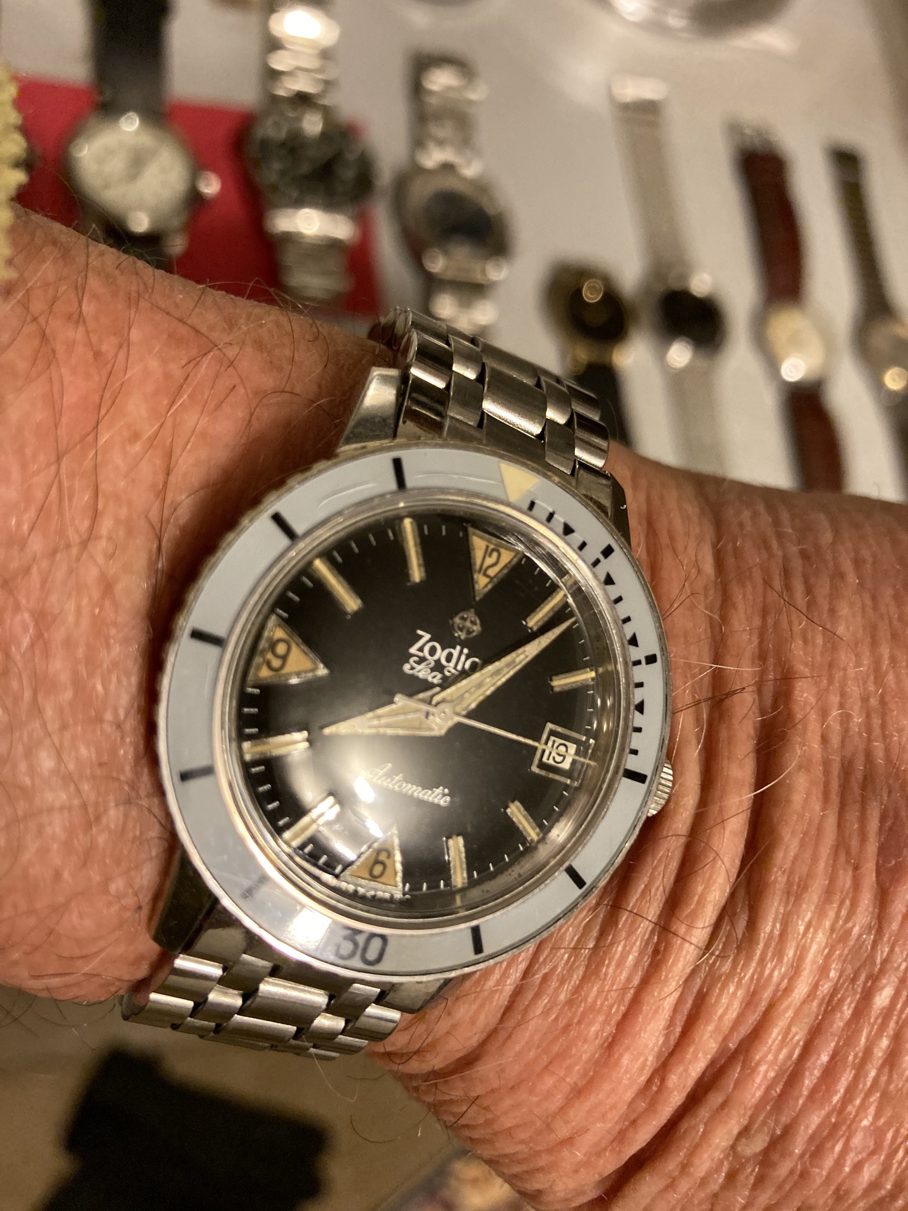 It was a tangle of cheap-o, out of style, fashion quartz watches, mostly womens, and not worth the effort it would take to place the mess in the nearest waste basket. Down at the bottom was a wretched Seiko. Filthy, green with verdigris, and with a horribly scuffed crystal and on an equally tarnished and filthy Twist-O-Flex. Shook the watch and it wanted to run. Was missing the crown.