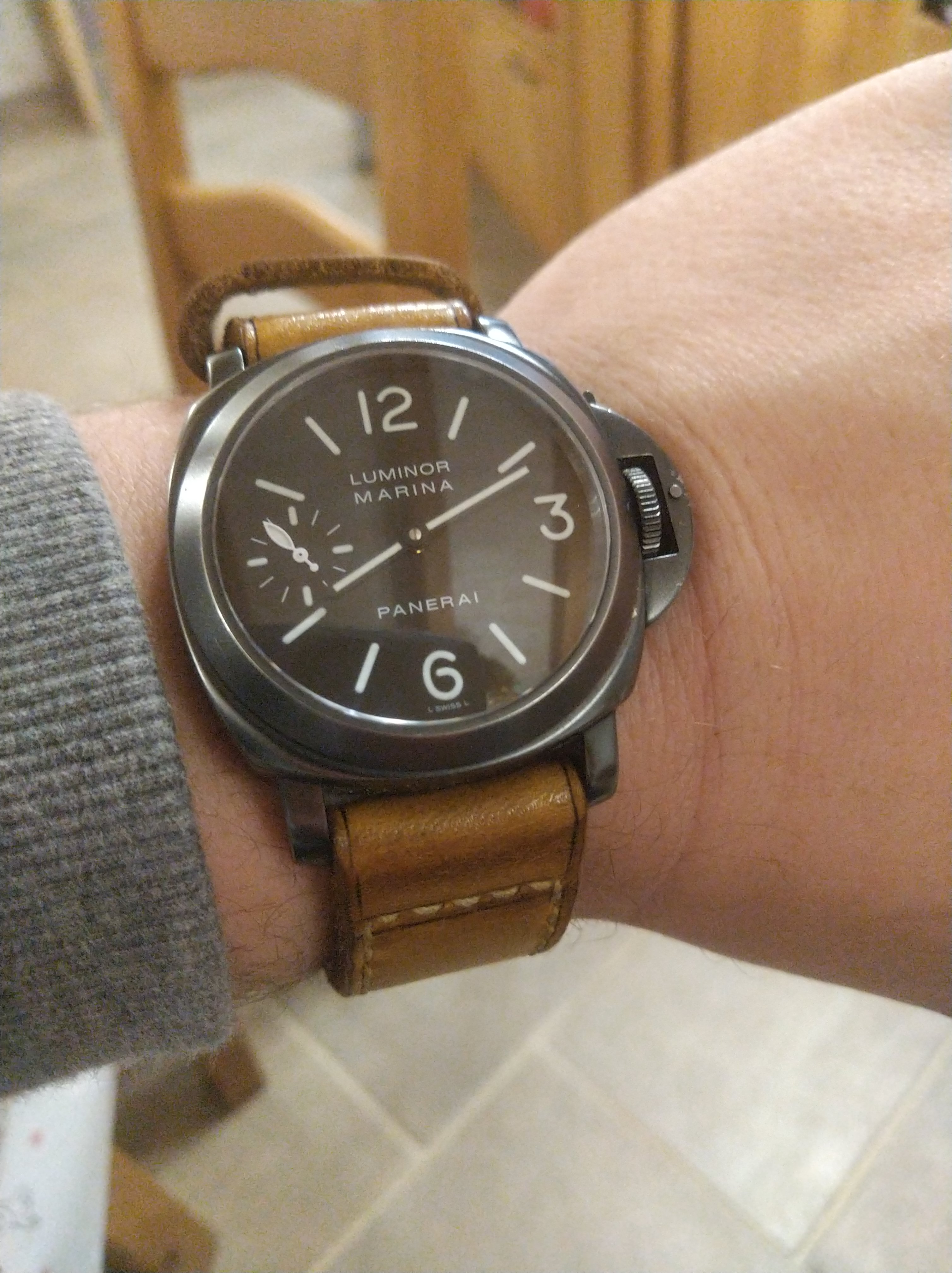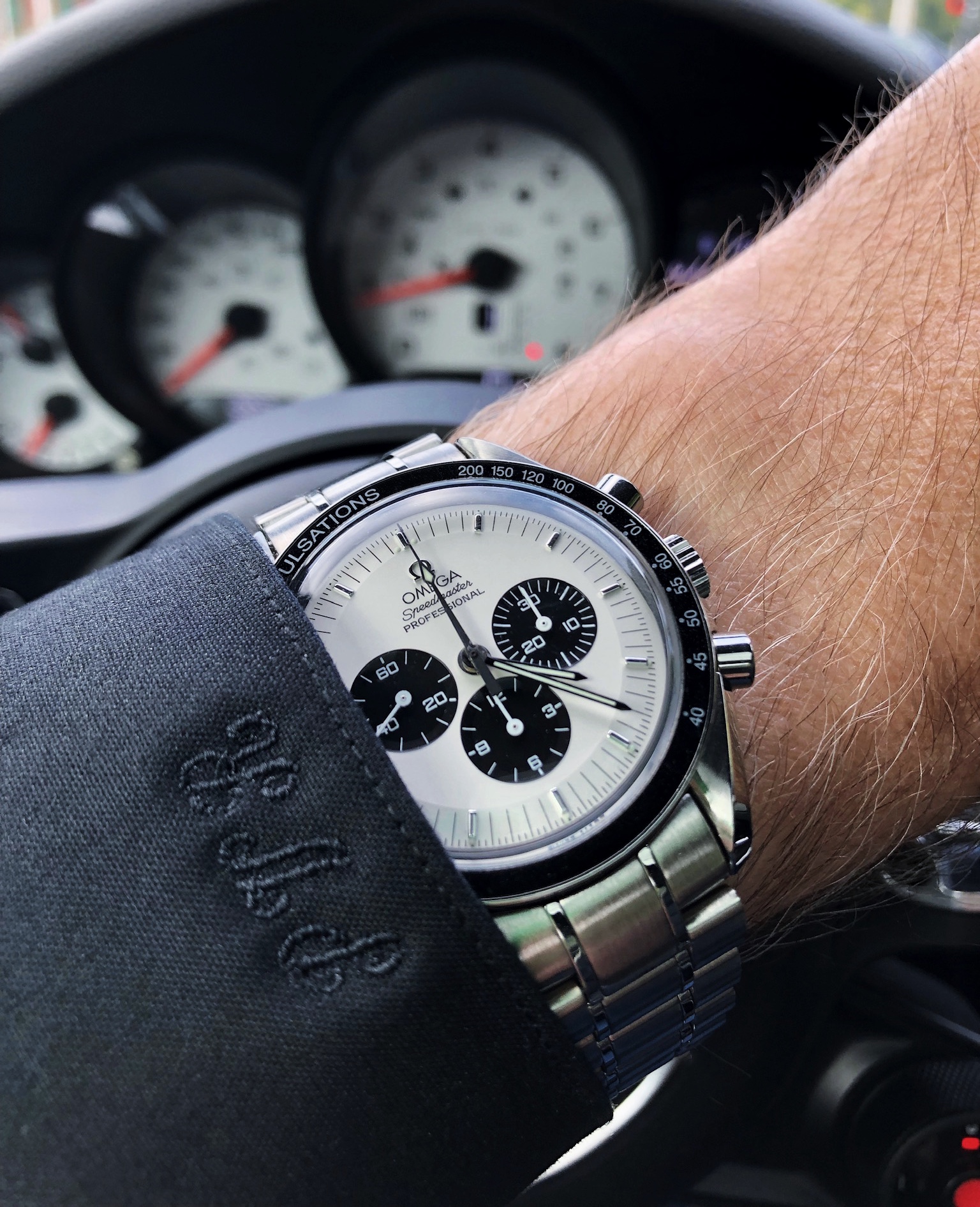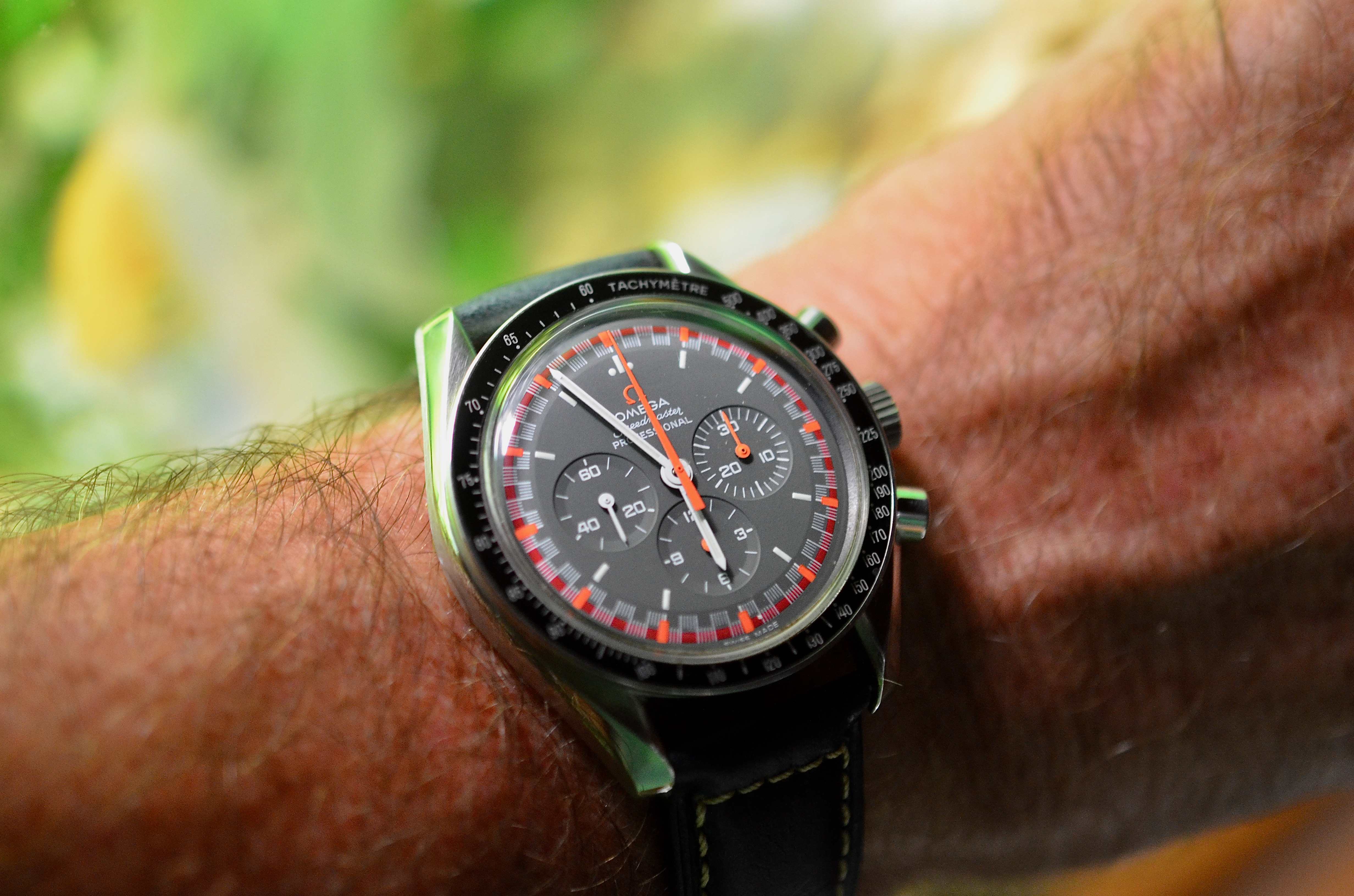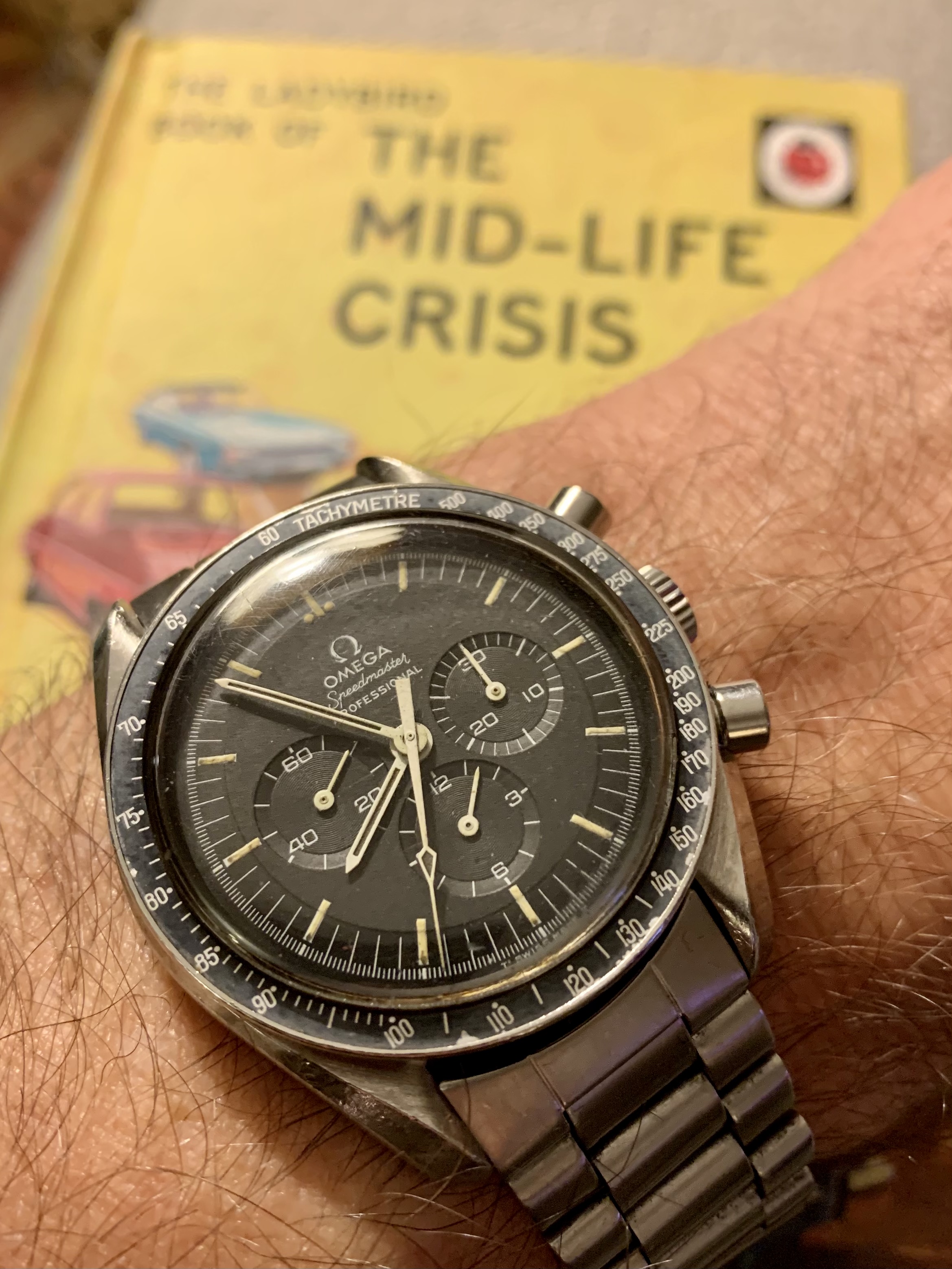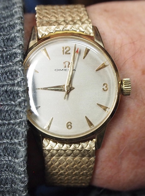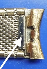 One of two, today. This one has been shown here before, on a black leather strap. Now sporting a Craftex expansion bracelet with tapered, flexible ends. This bracelet is virtually unworn. But it befell a bit of misfortune a long time ago. One of the ends broke loose, making the bracelet unusable. I was headed for a friend’s shop this morning, and I took the bracelet with me. He has a laser machine. I asked if he could re-fit the end. He did, and he re-inforced the other end while he was at it. The weld took place where the arrow is pointing. You can’t tell it was welded,