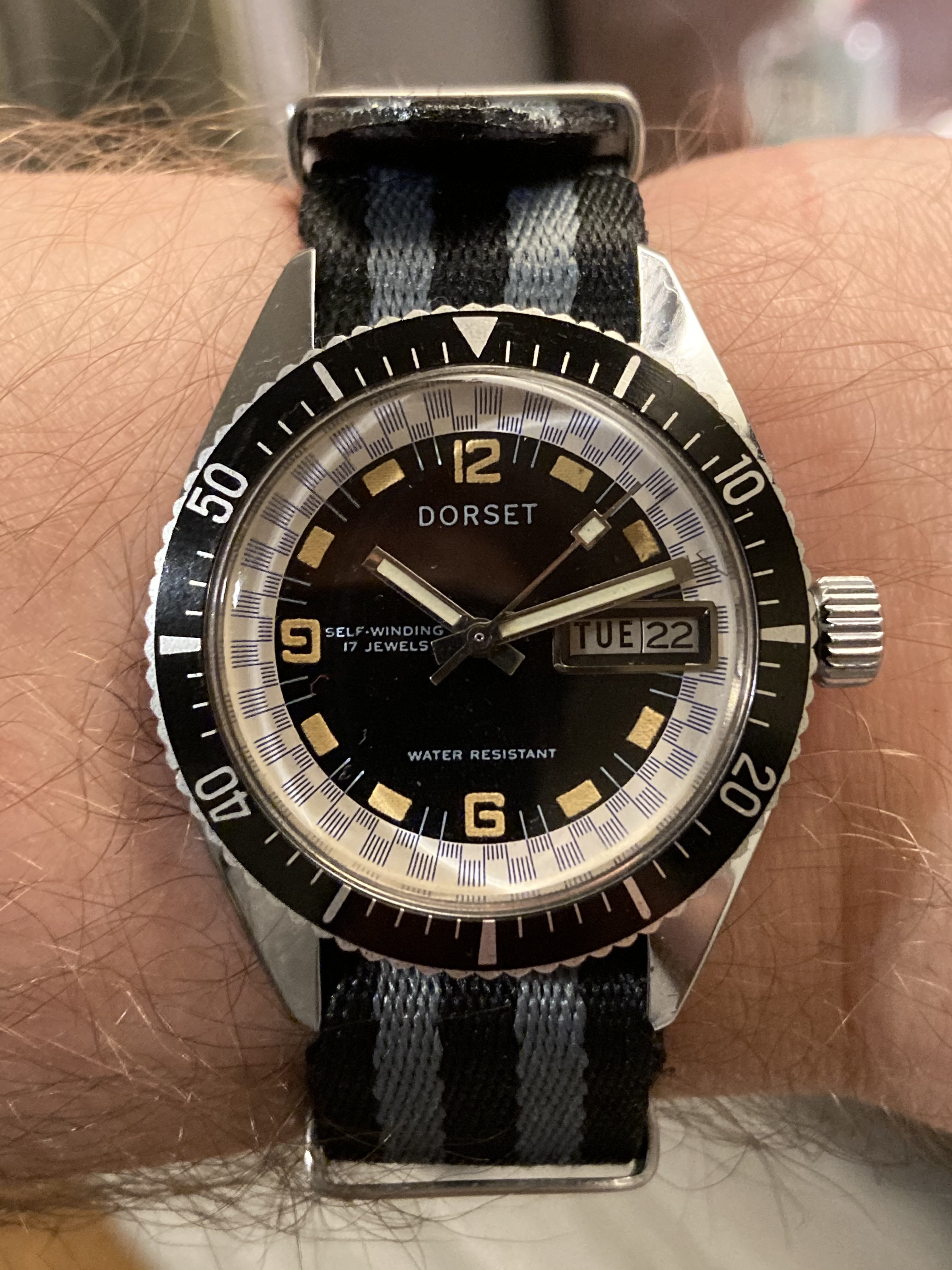 This watch has been shown here before.......as a candidate for the worst redial. ‘Taint pretty! But it has a good looking caliber 283 manual winder in it, and is a good runner. So I fitted the repaired bracelet to it, and it is one of two I am wearing, today.