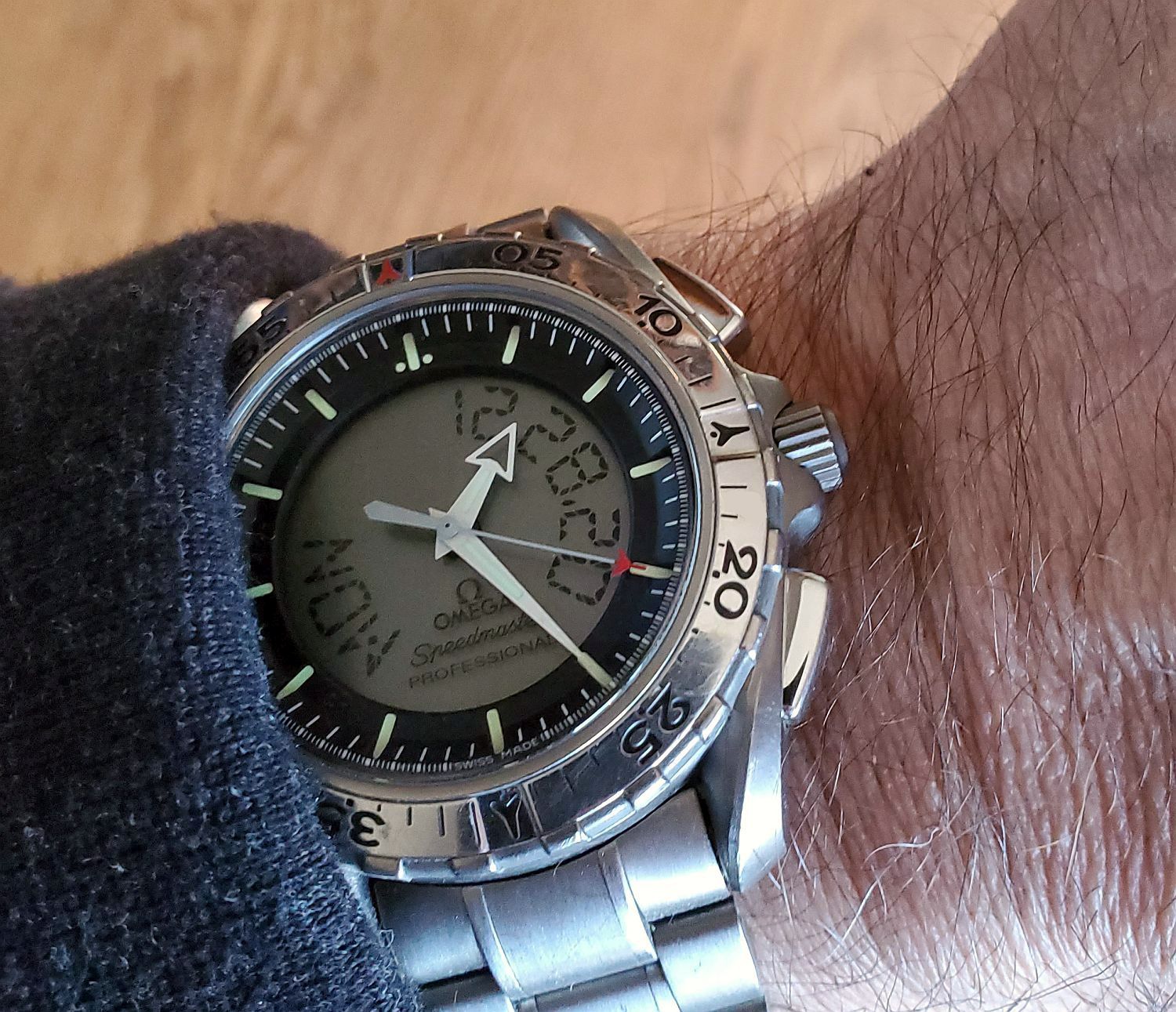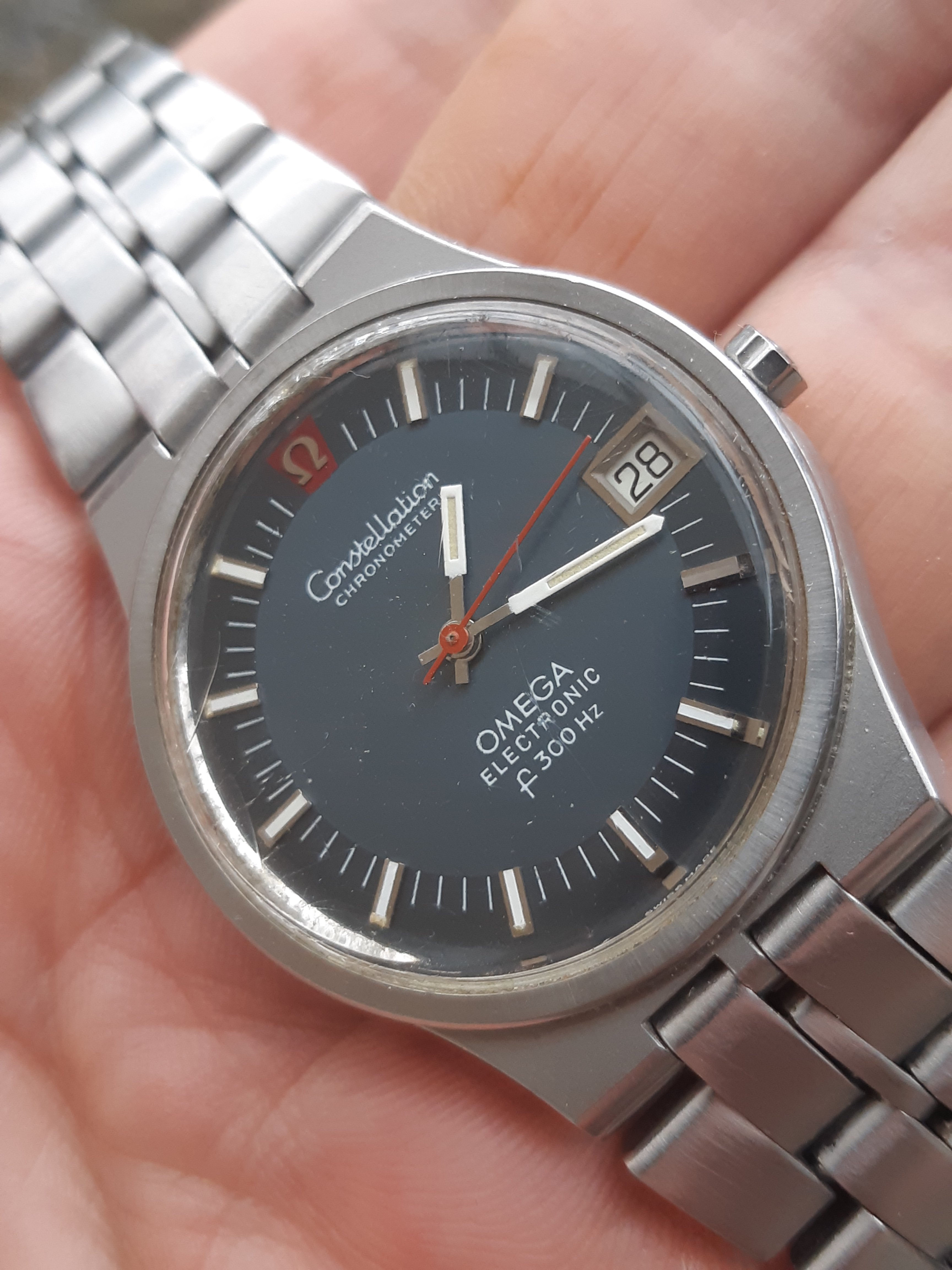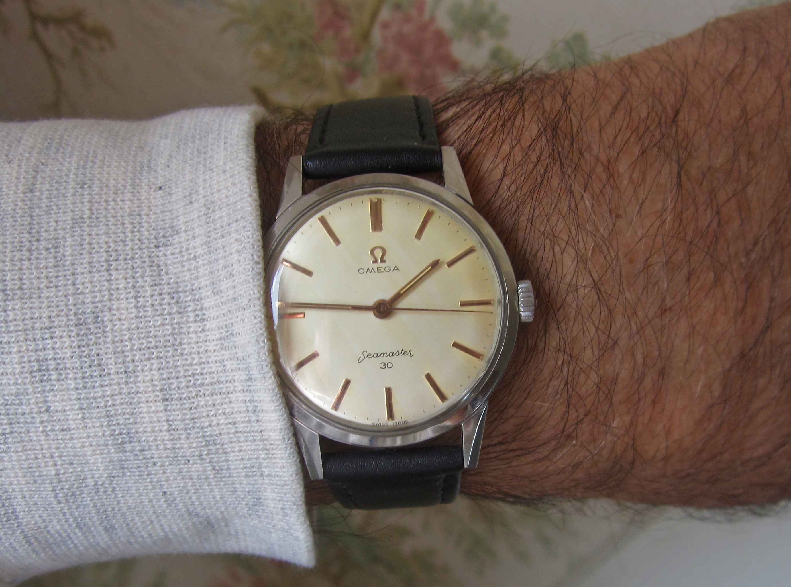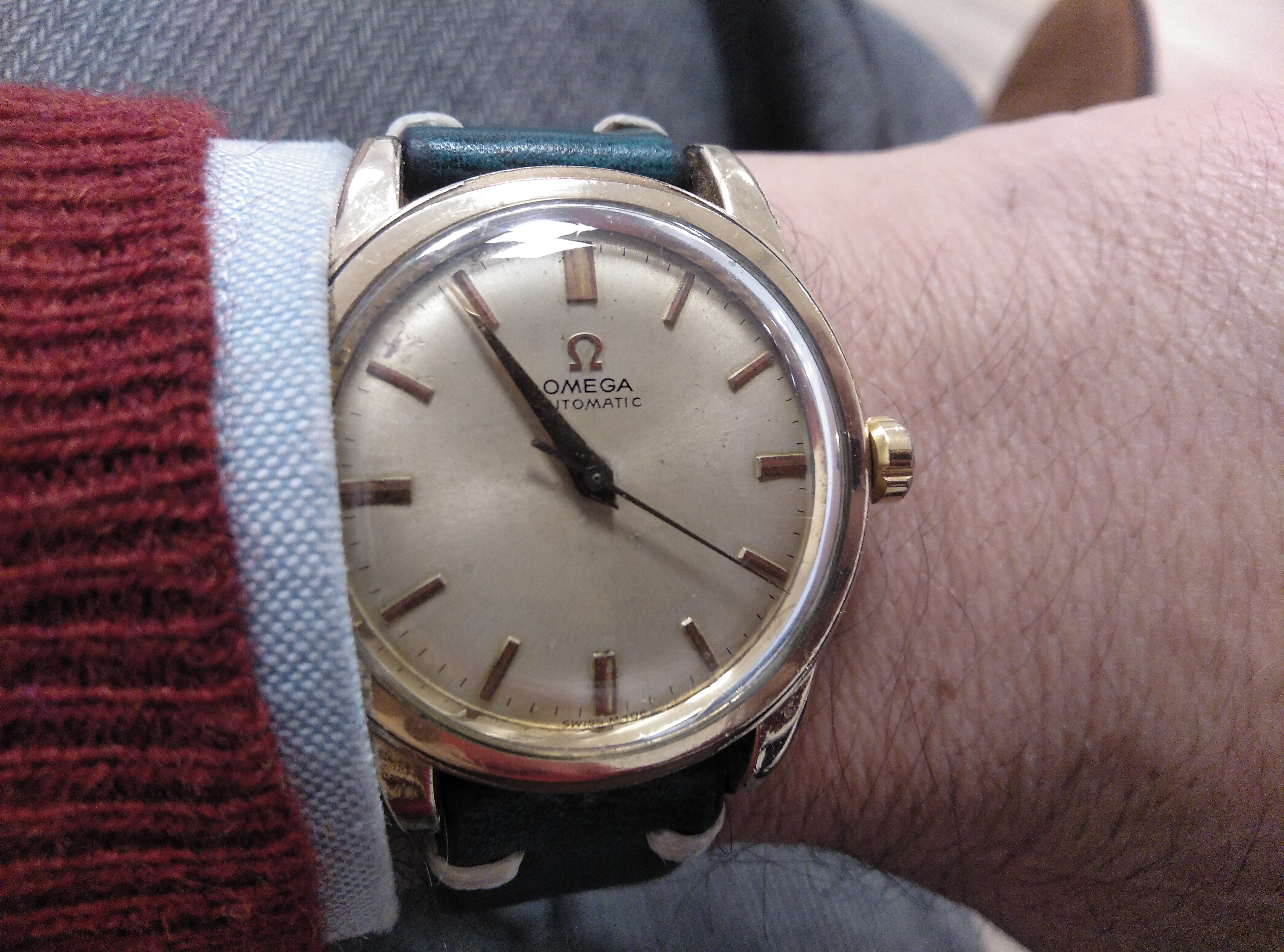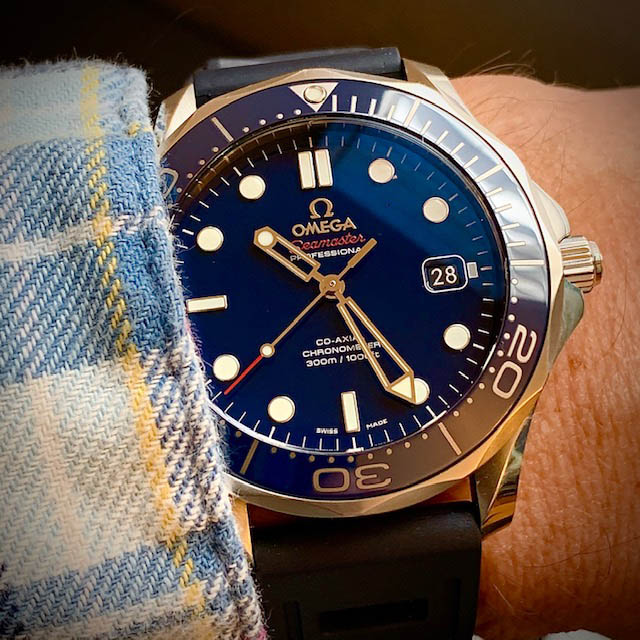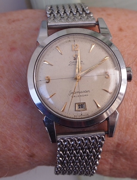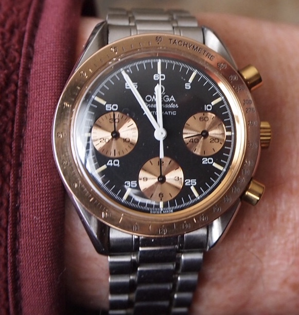 These two, still, until next year. Mid-50s calibre 355, date at 6:00, bumper automatic, hobnail dial. Late 1980s Speedmaster reduced, 18-karat rose gold and steel, on steel Omega bracelet.