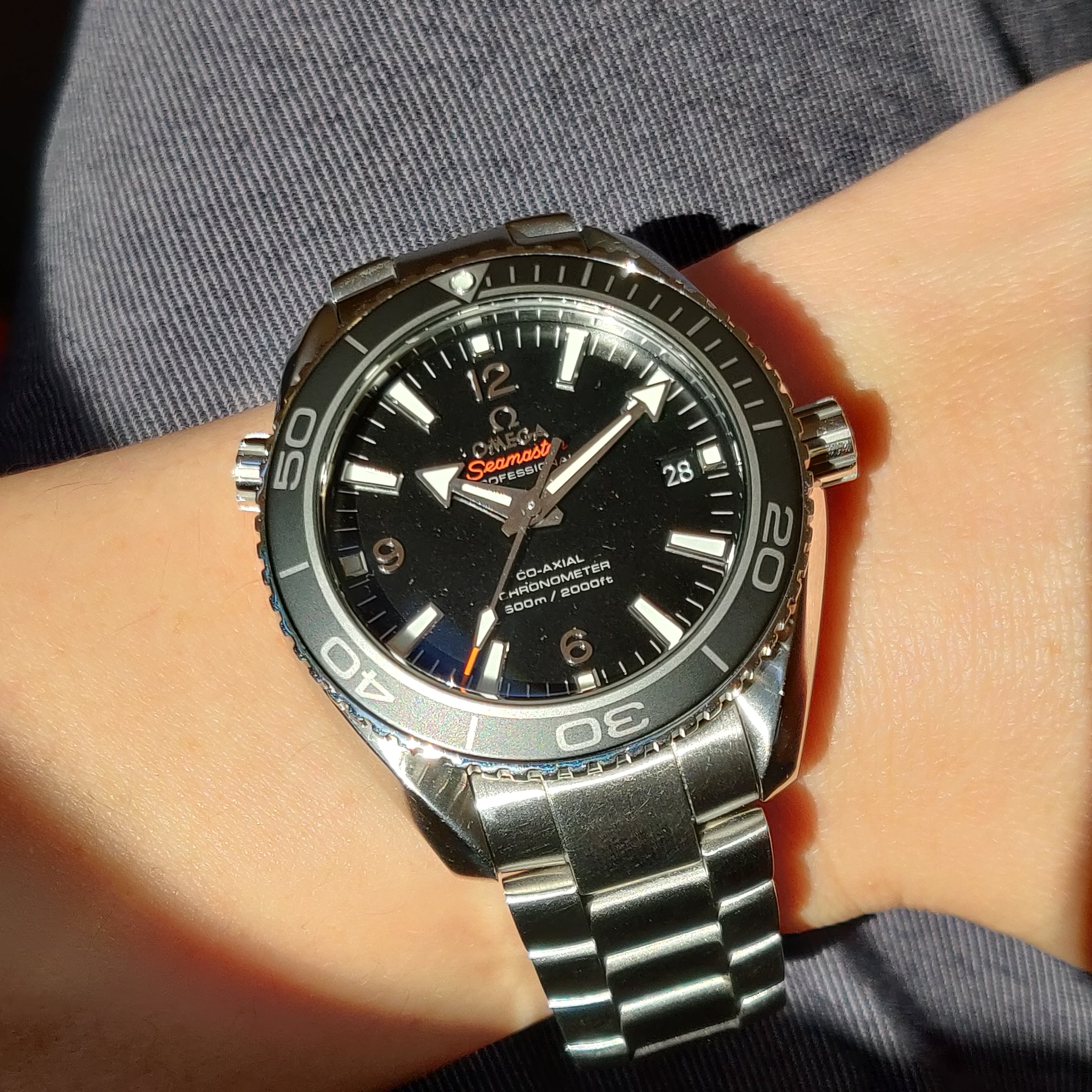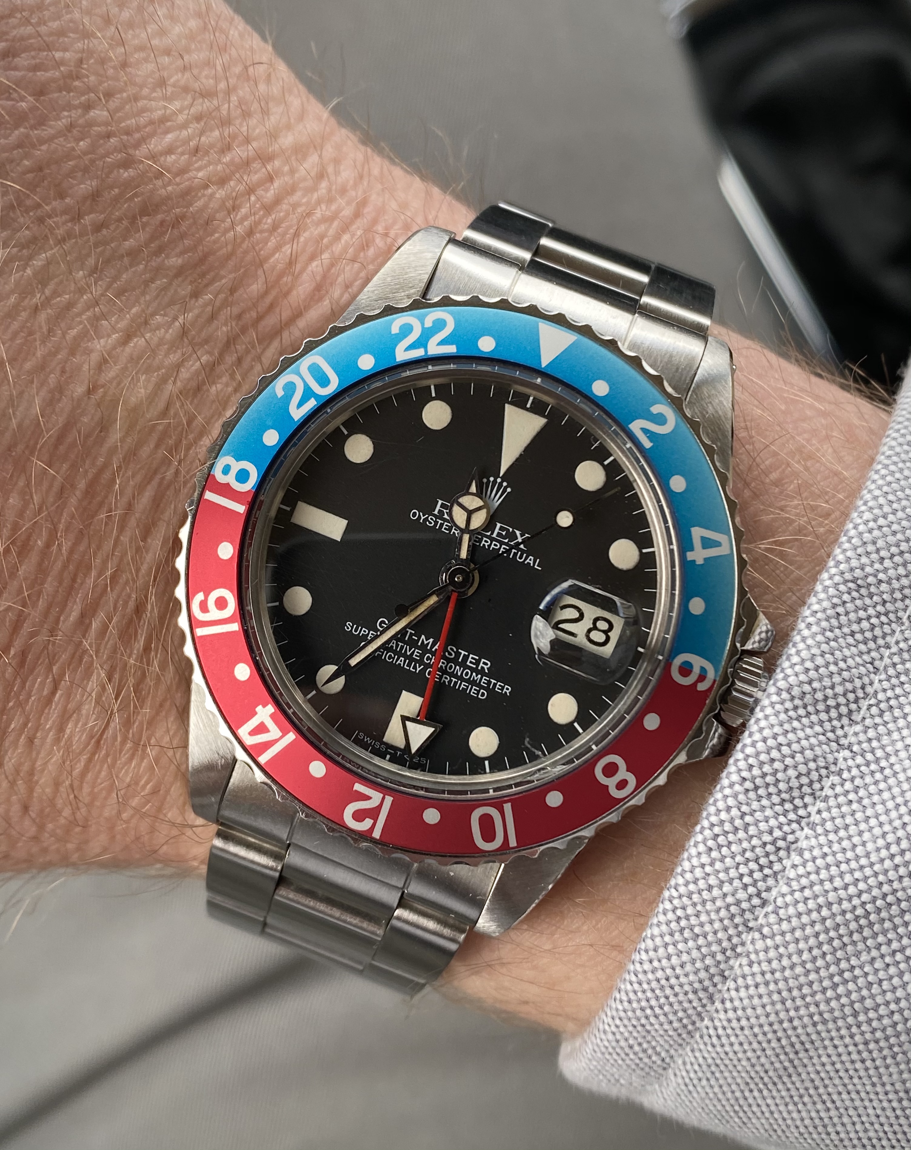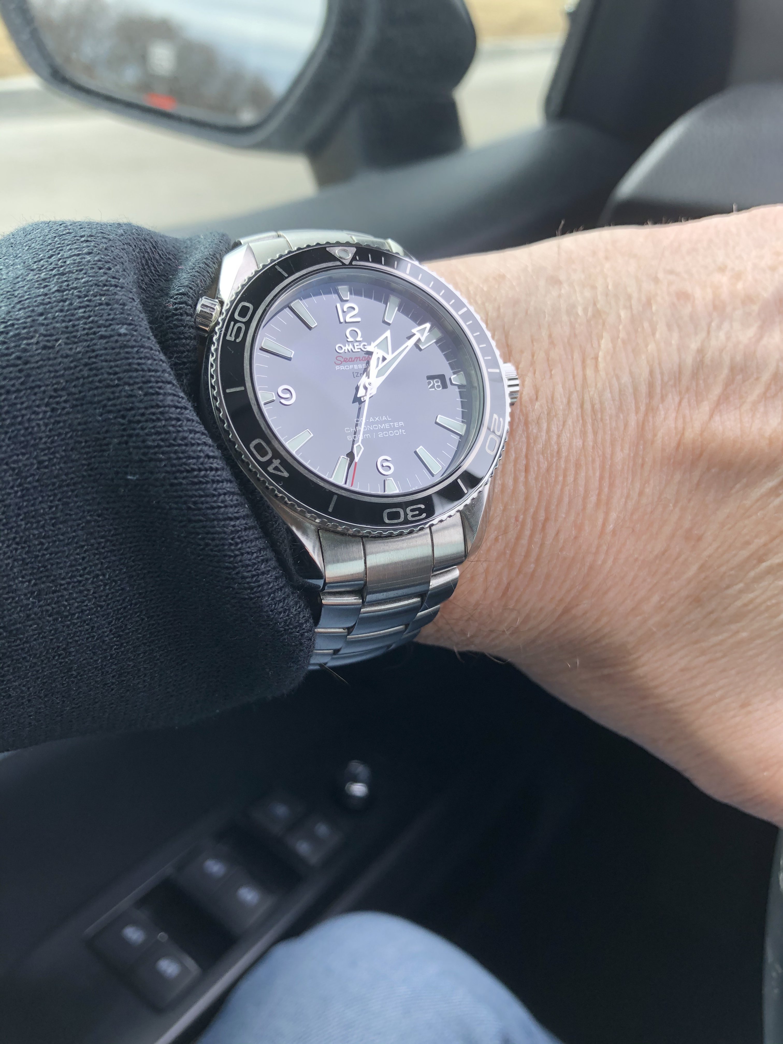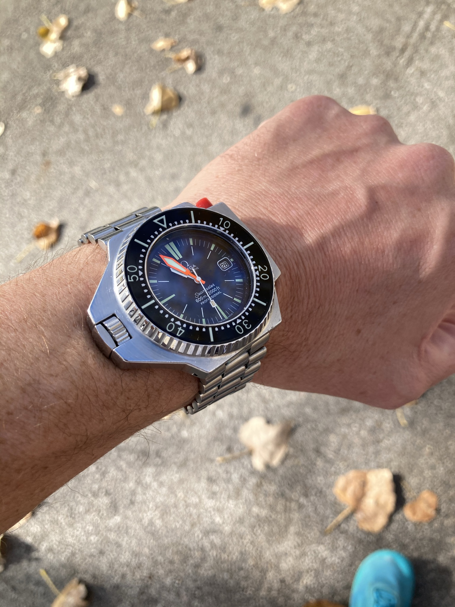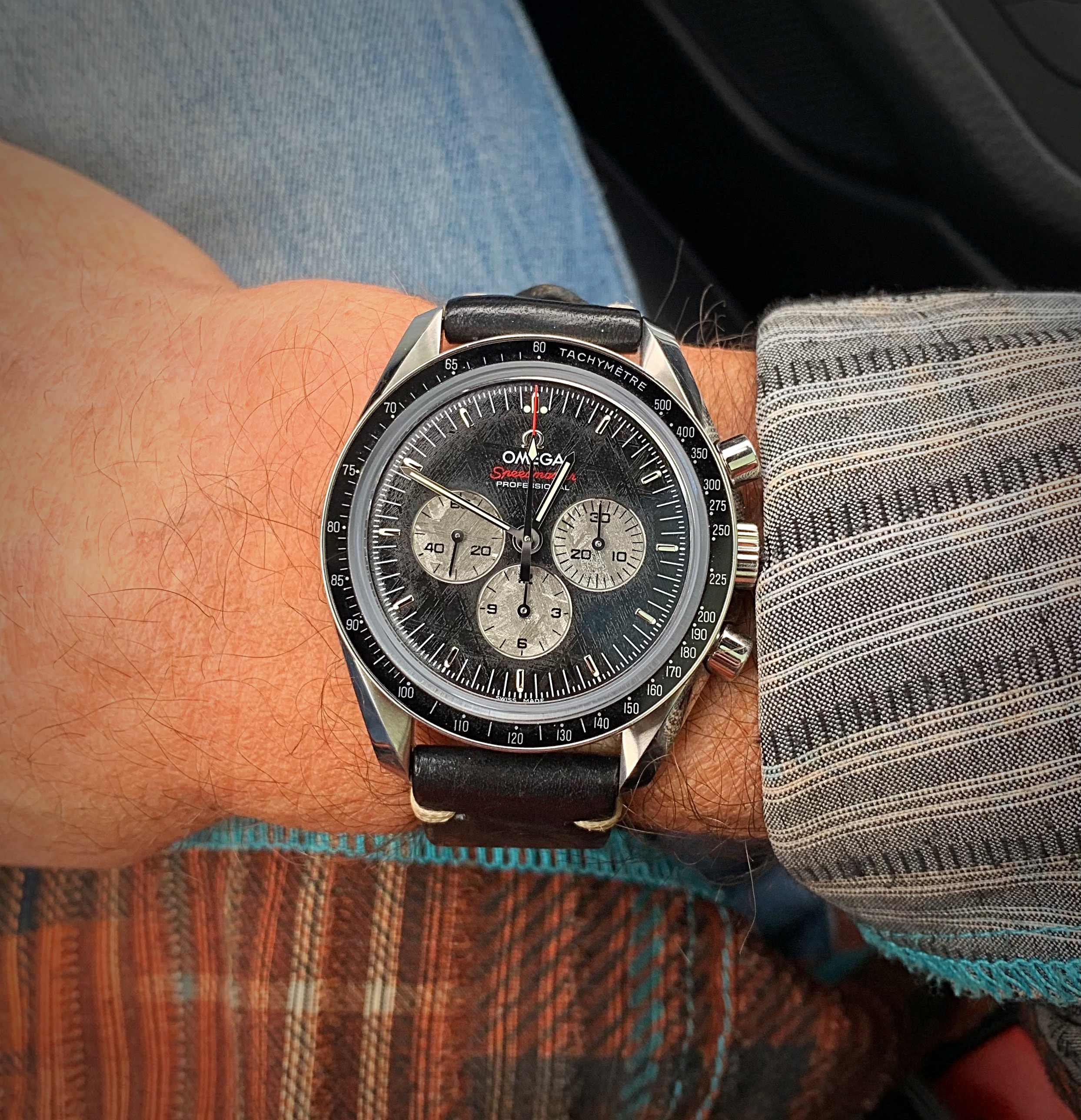 These two, still, until next year. Mid-50s calibre 355, date at 6:00, bumper automatic, hobnail dial. Late 1980s Speedmaster reduced, 18-karat rose gold and steel, on steel Omega bracelet.