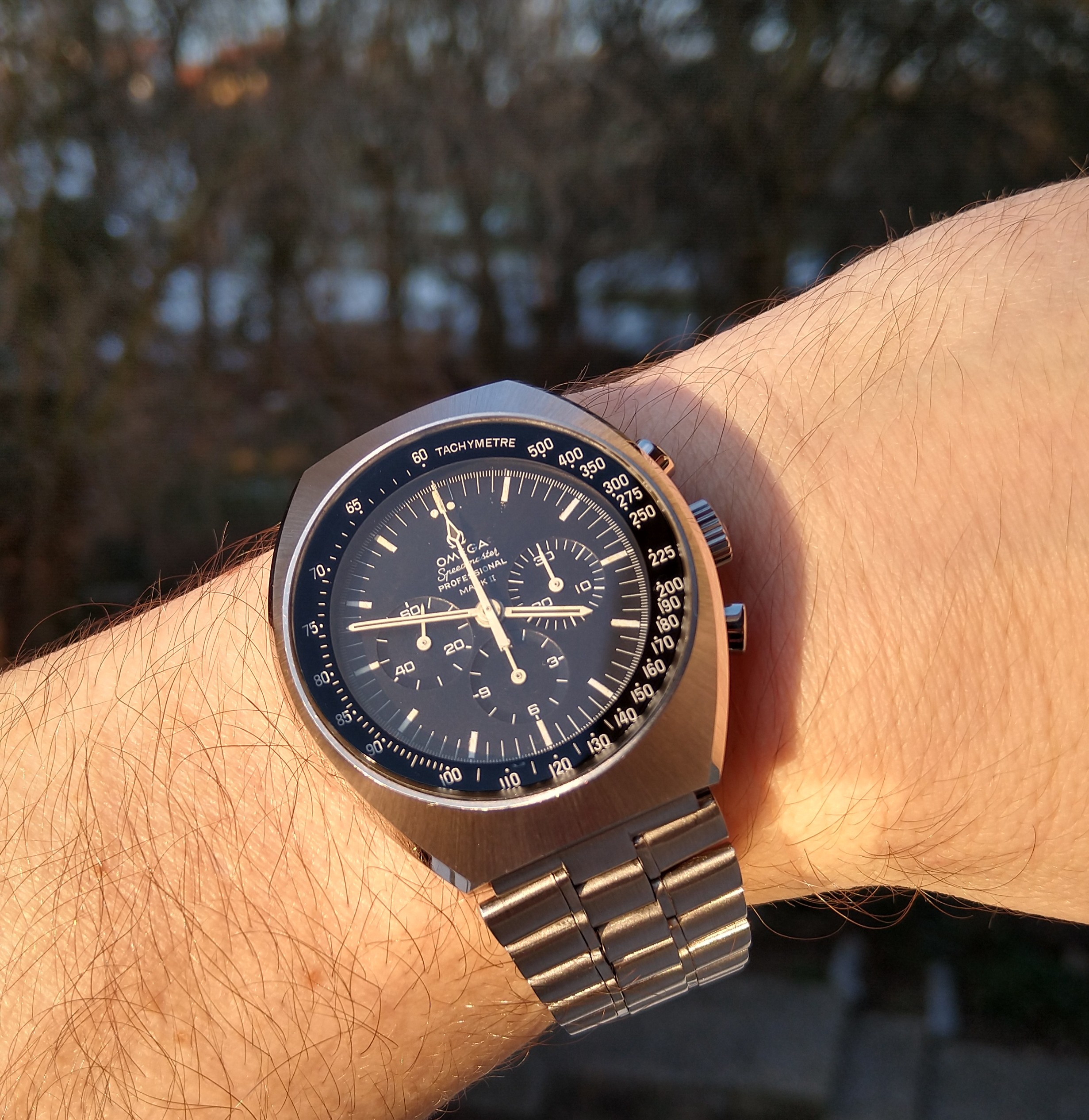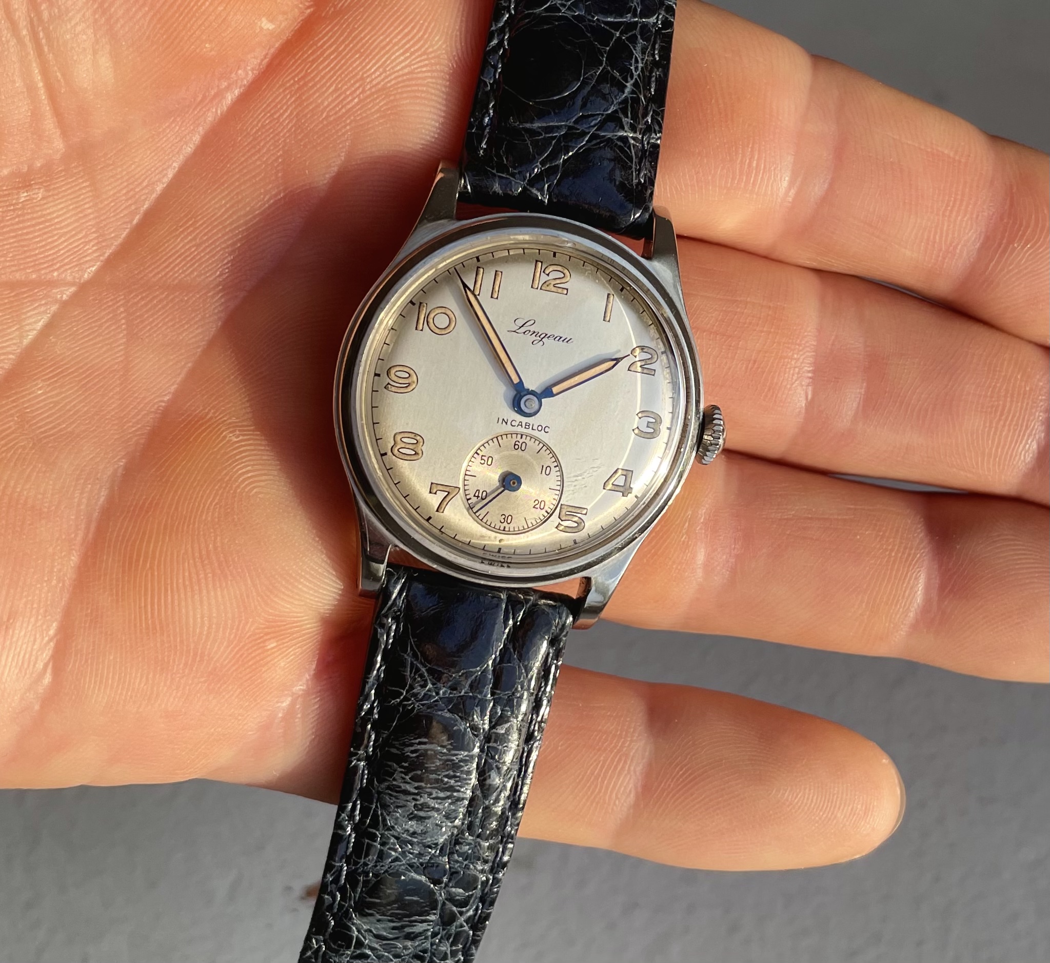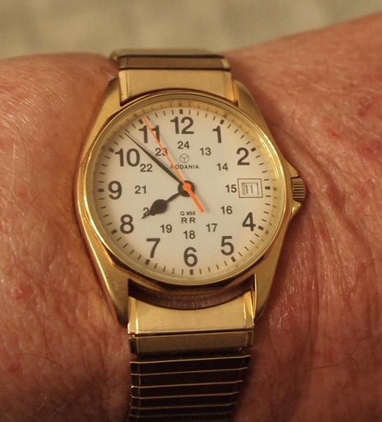 This today. I鈥檝e had it for decades, but may have worn it for a month in all that time. The Rodania version of the Bulova 955Q railroad model, with one difference. A screw-down crown. It has been on a black leather strap for all the years I鈥檝e owned it, but this bracelet came my way recently. Not my favourite bracelet, but it will do.