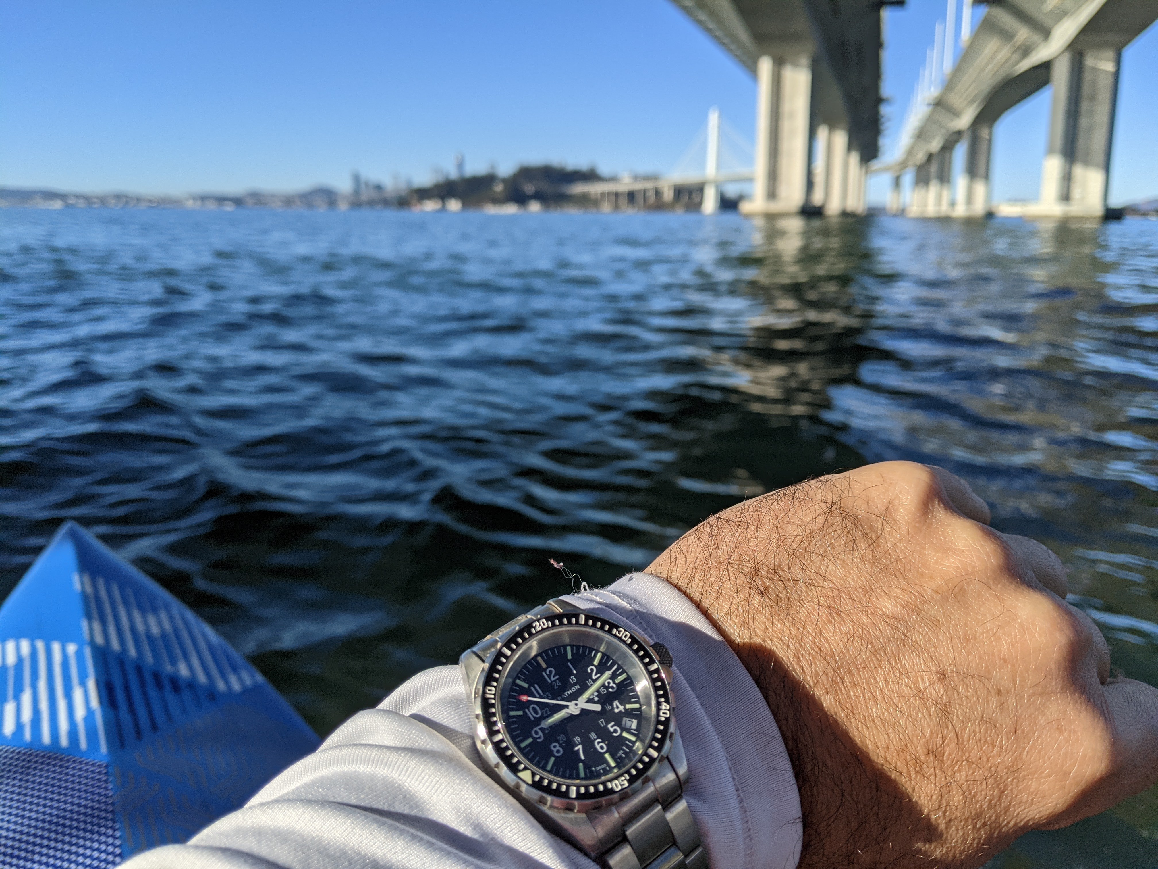 Took the Marathon MSAR for its maiden voyage under the San Francisco-Oakland Bay Bridge this morning. We're having a false spring for a couple days and the mercury is hitting 70F/21C - too good a chance to miss getting on the paddleboard. I'm really enjoying this practical little diver - the tritium tubes are wonderful in the dark.