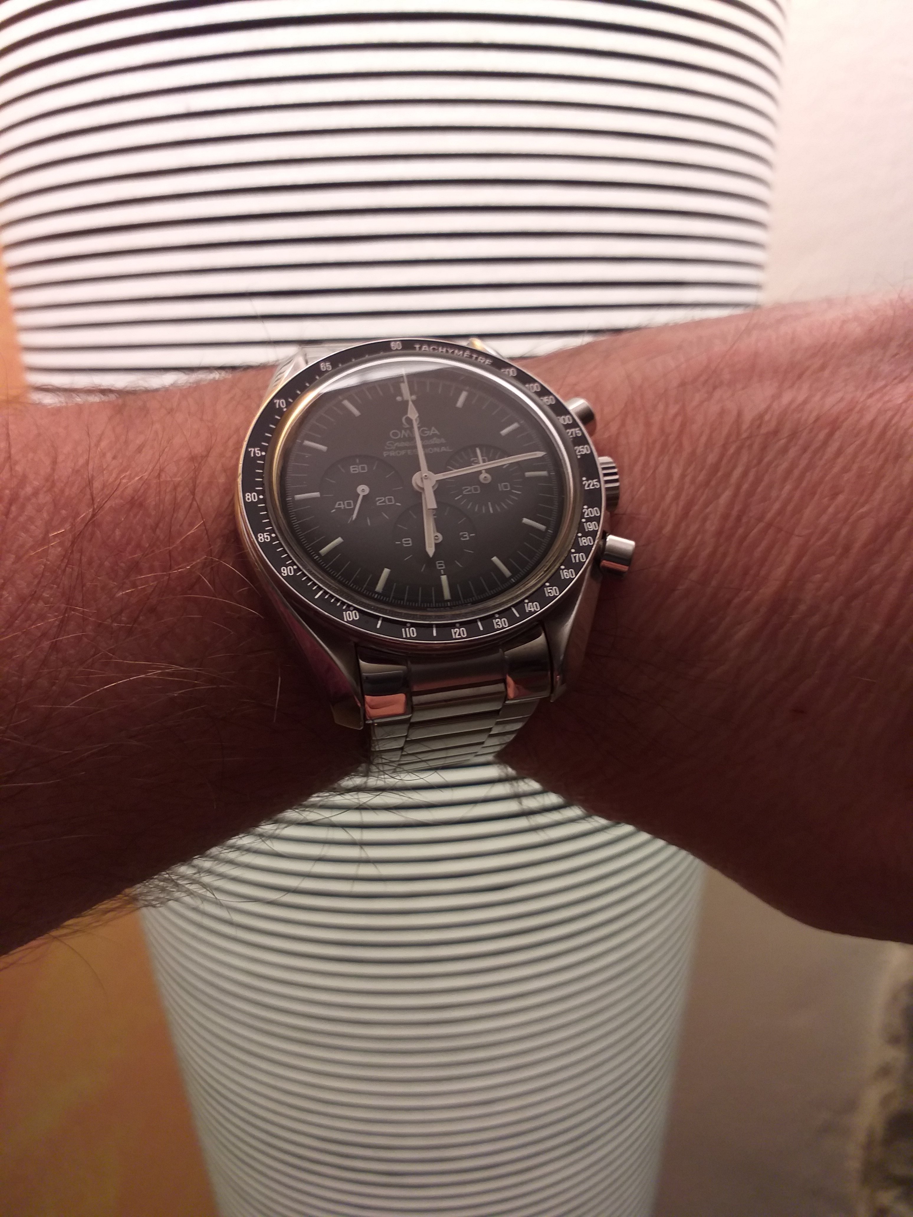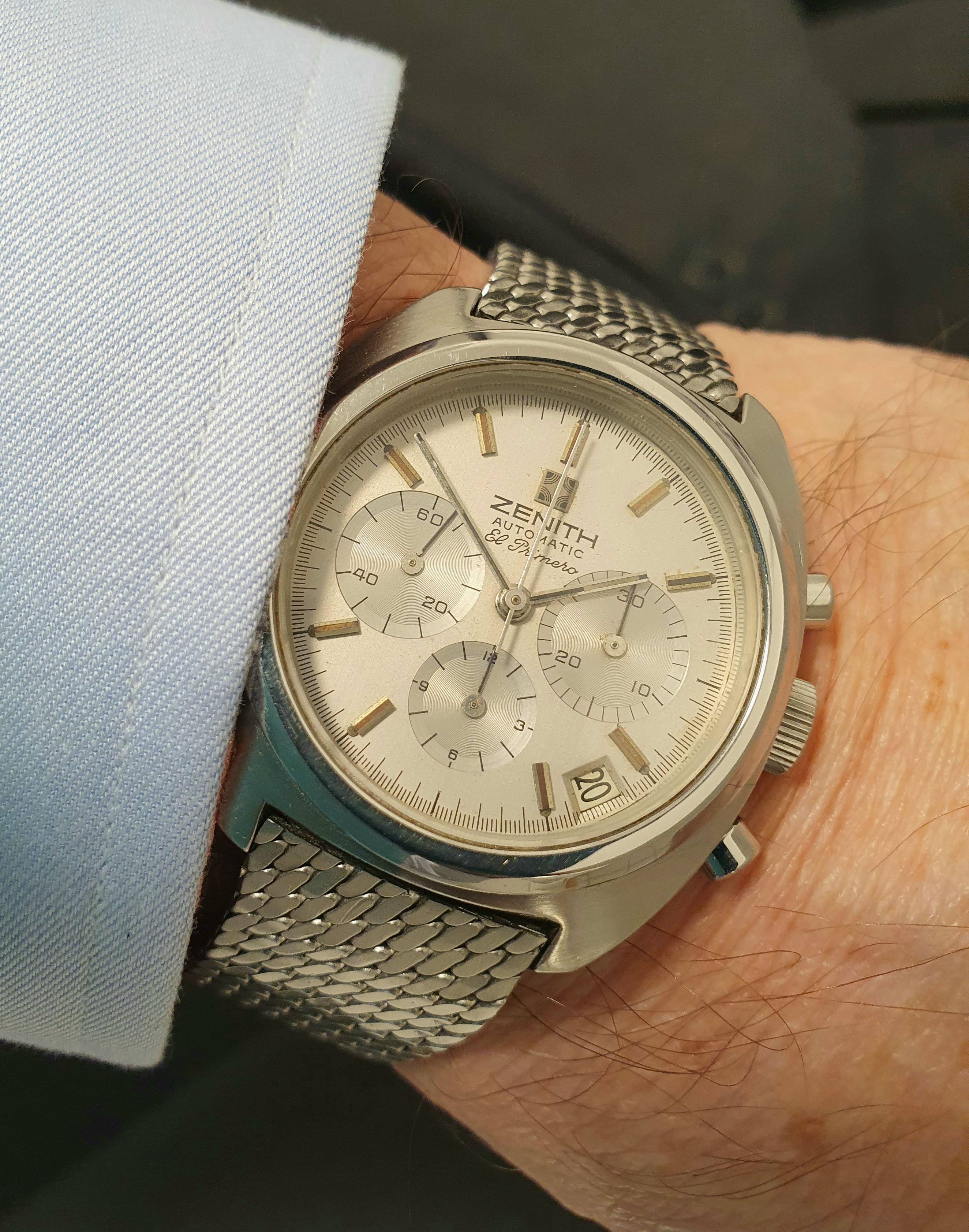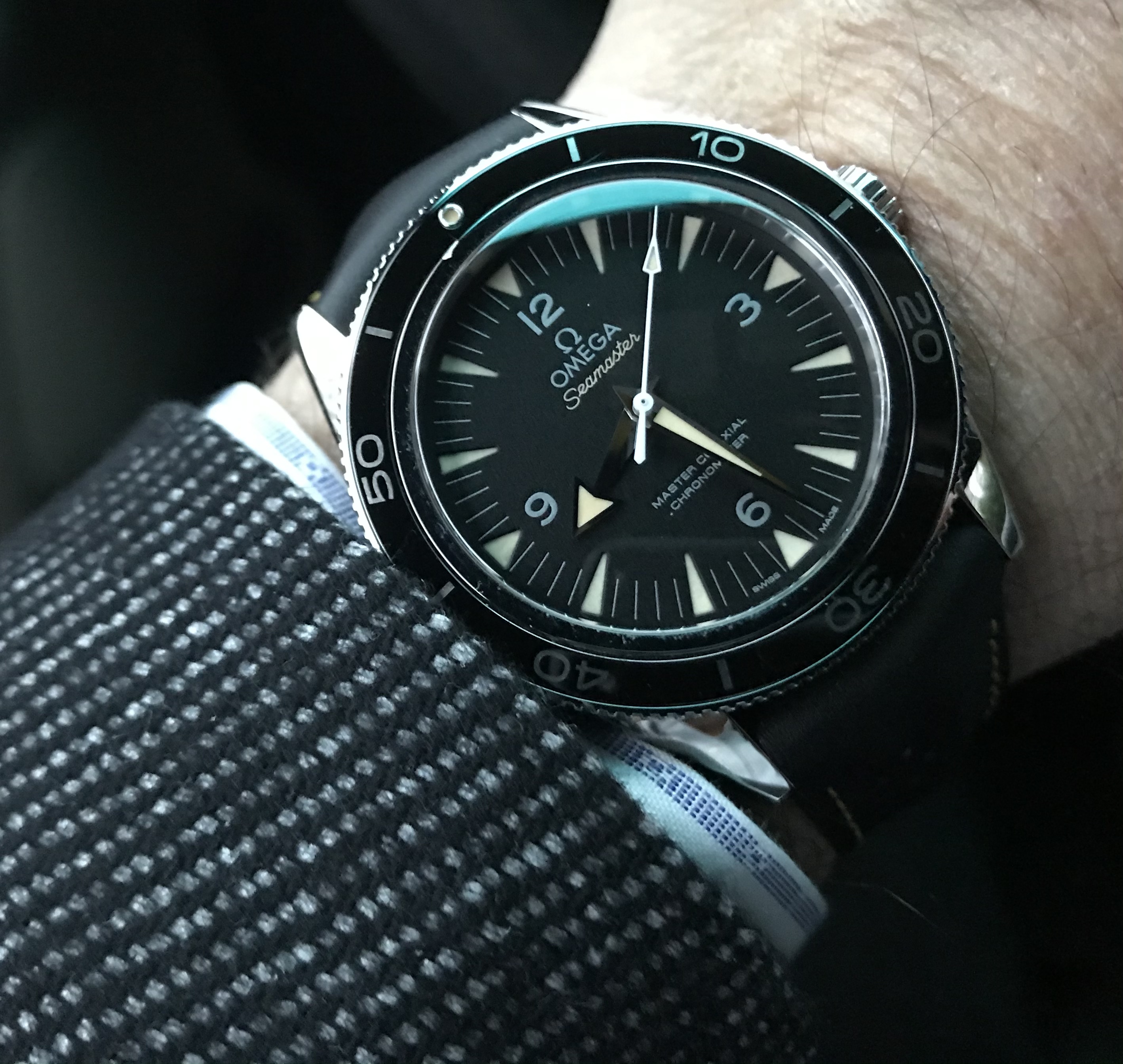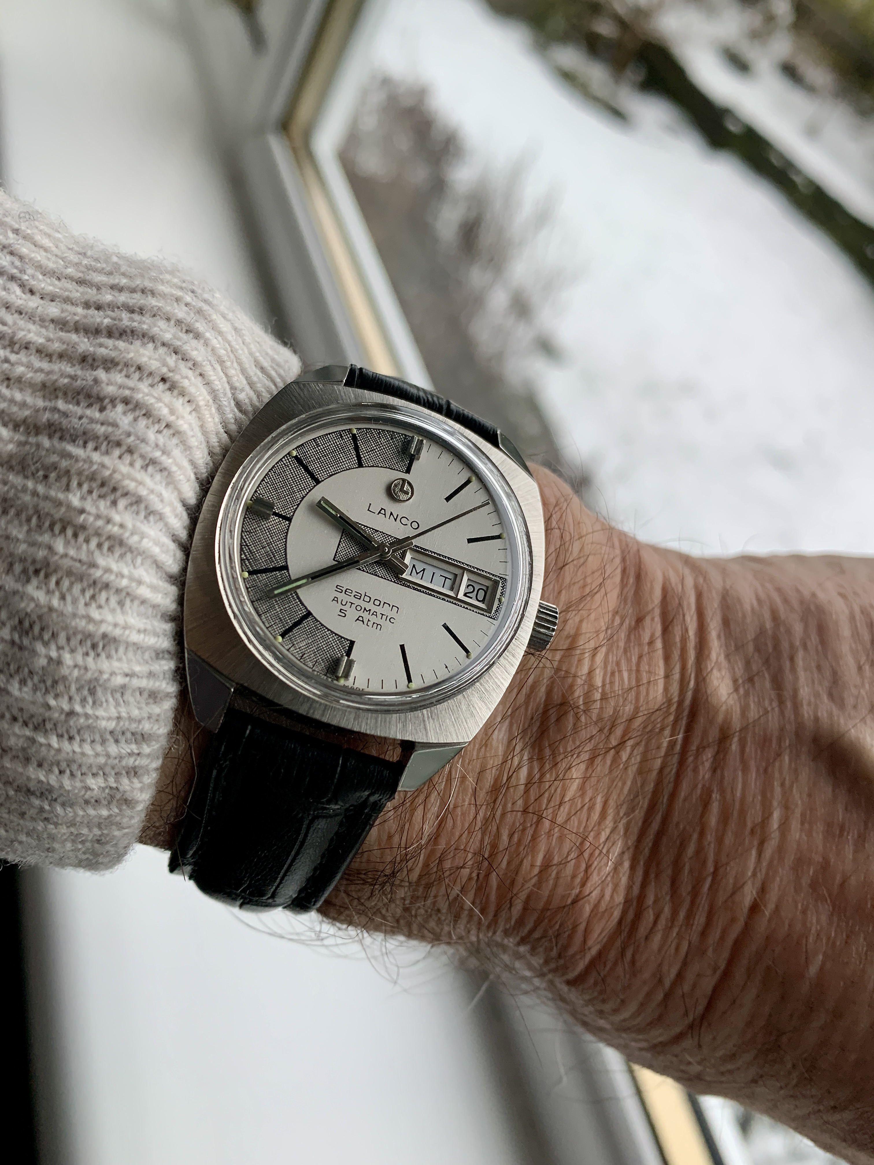 Big fan of Alain Silberstein's style, a blast of fun in the face of the staid Swiss in the 90's. This is a Kronomarine (200 m WR) from 1994 which I picked up on eBay about 10 years ago as NOS when Silberstein closed up shop. Came packed in all its original architect style packaging with metal and leather strap and COSC certificate. These are bright and colorful and are very well made, this one with a Valjoux 7751 movement, 500 pcs made. Silberstein was one of the pioneers in using PVD coating on cases, bracelets and movements.
