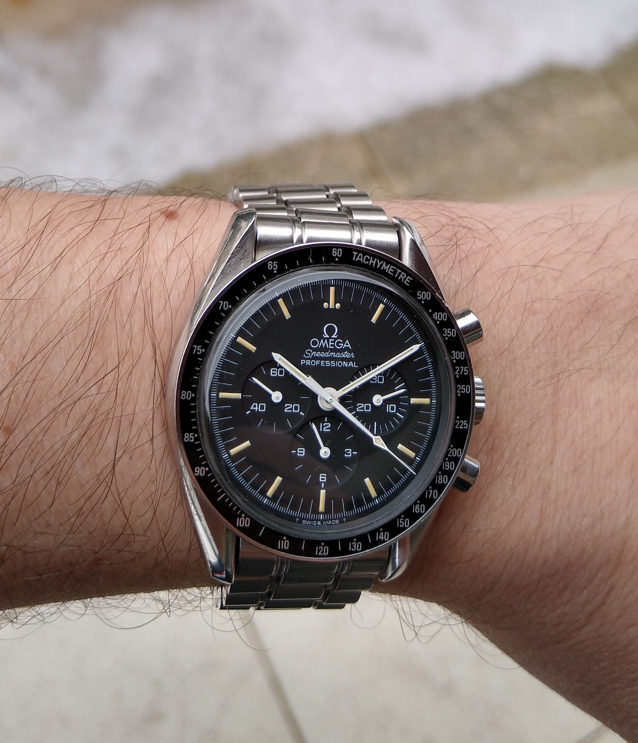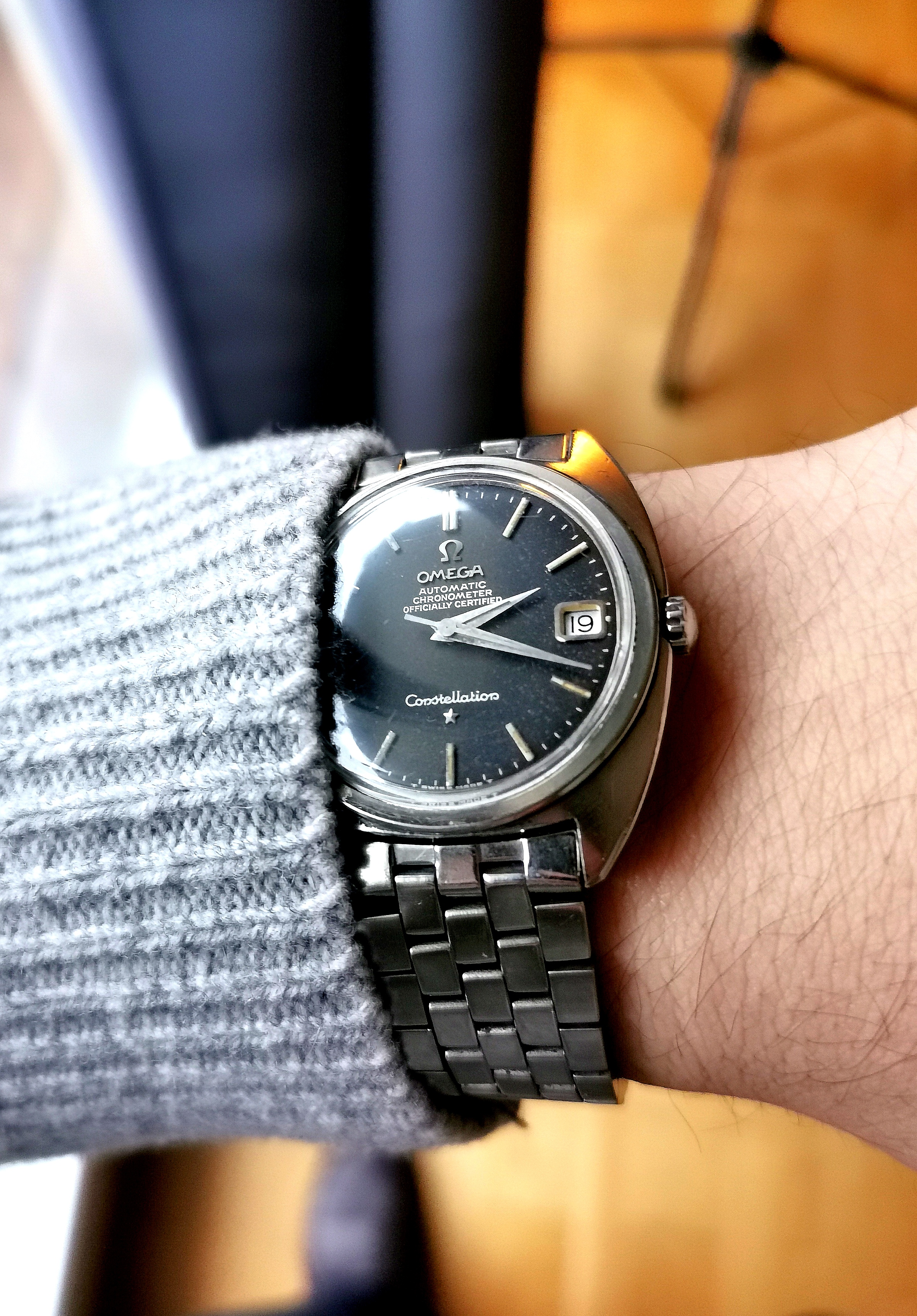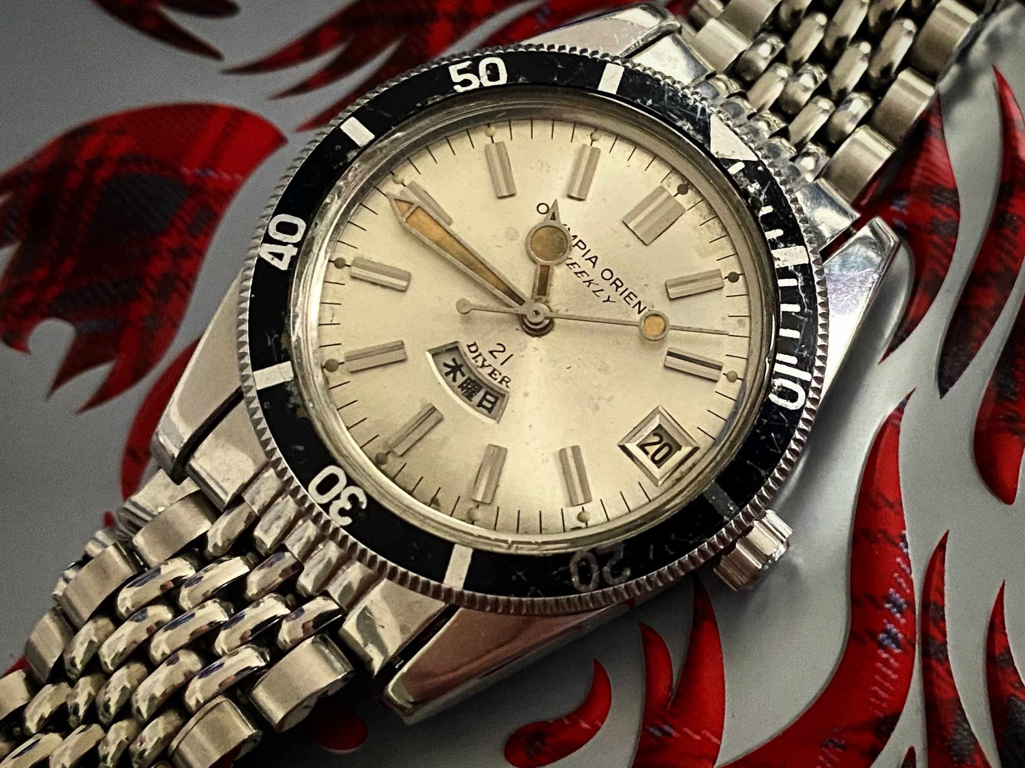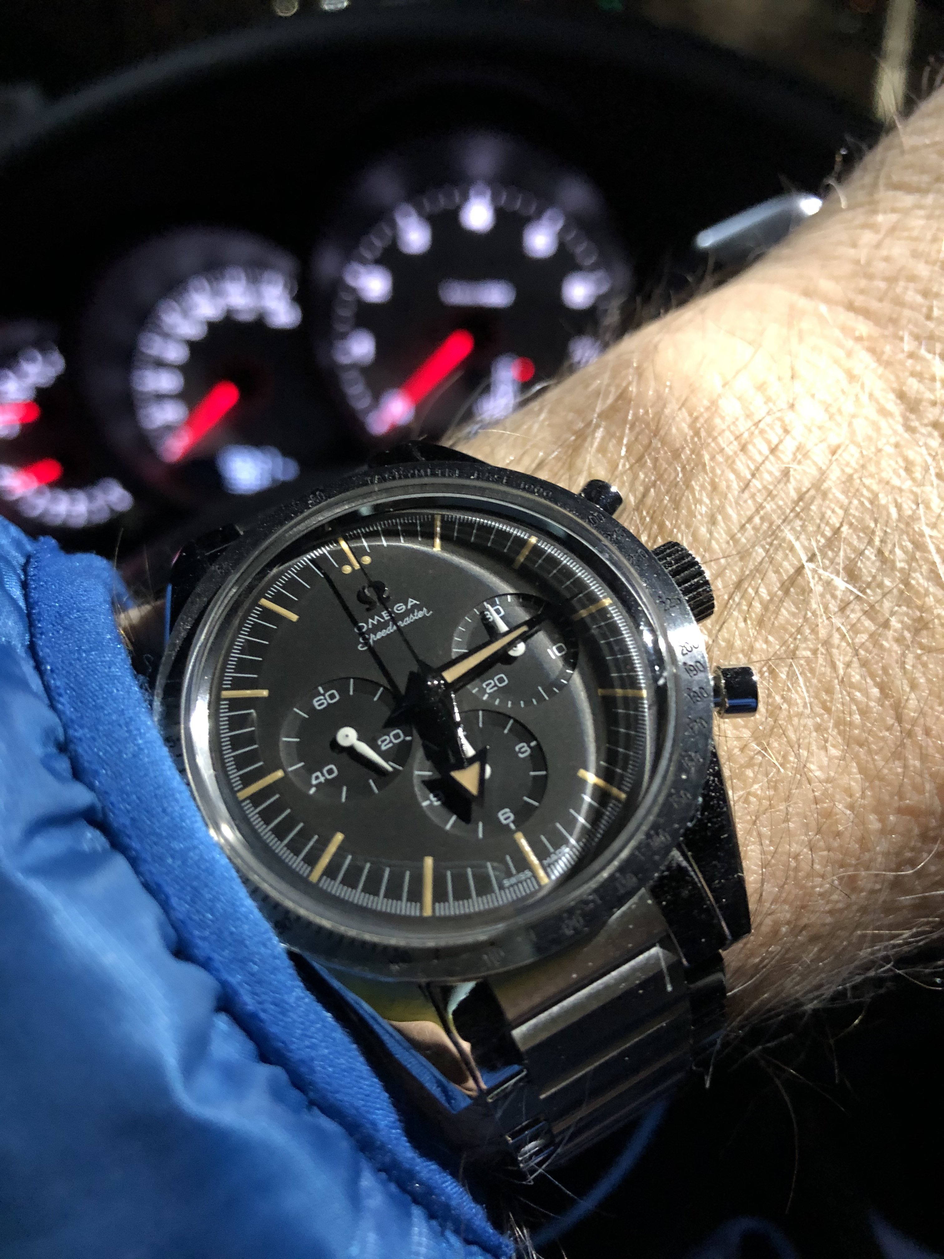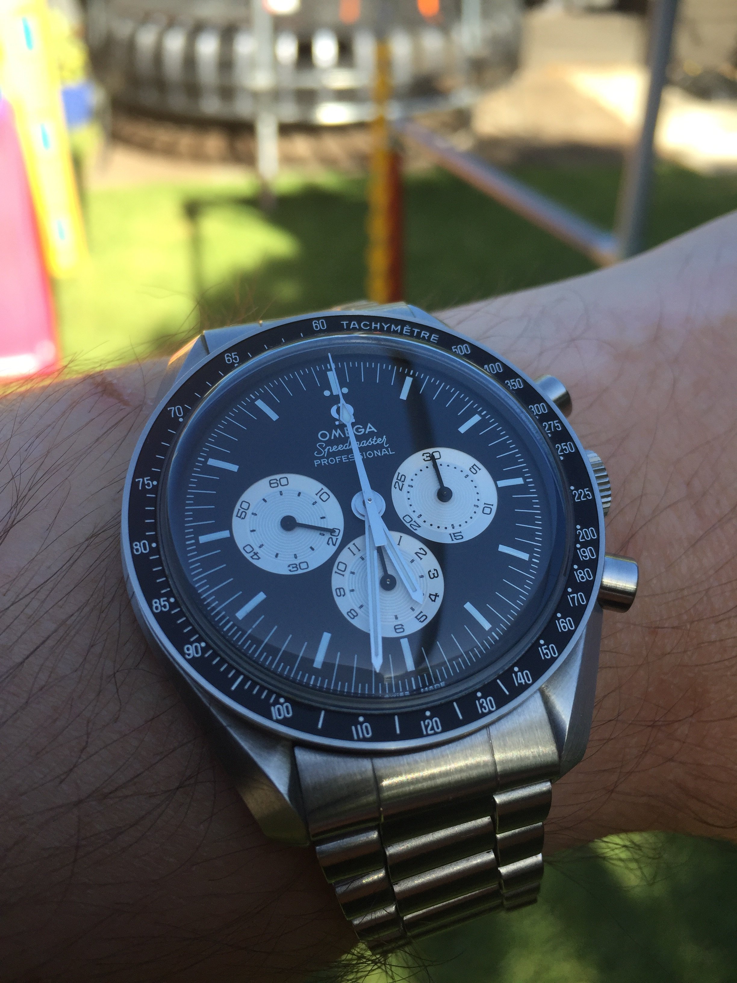 Big fan of Alain Silberstein's style, a blast of fun in the face of the staid Swiss in the 90's. This is a Kronomarine (200 m WR) from 1994 which I picked up on eBay about 10 years ago as NOS when Silberstein closed up shop. Came packed in all its original architect style packaging with metal and leather strap and COSC certificate. These are bright and colorful and are very well made, this one with a Valjoux 7751 movement, 500 pcs made. Silberstein was one of the pioneers in using PVD coating on cases, bracelets and movements.