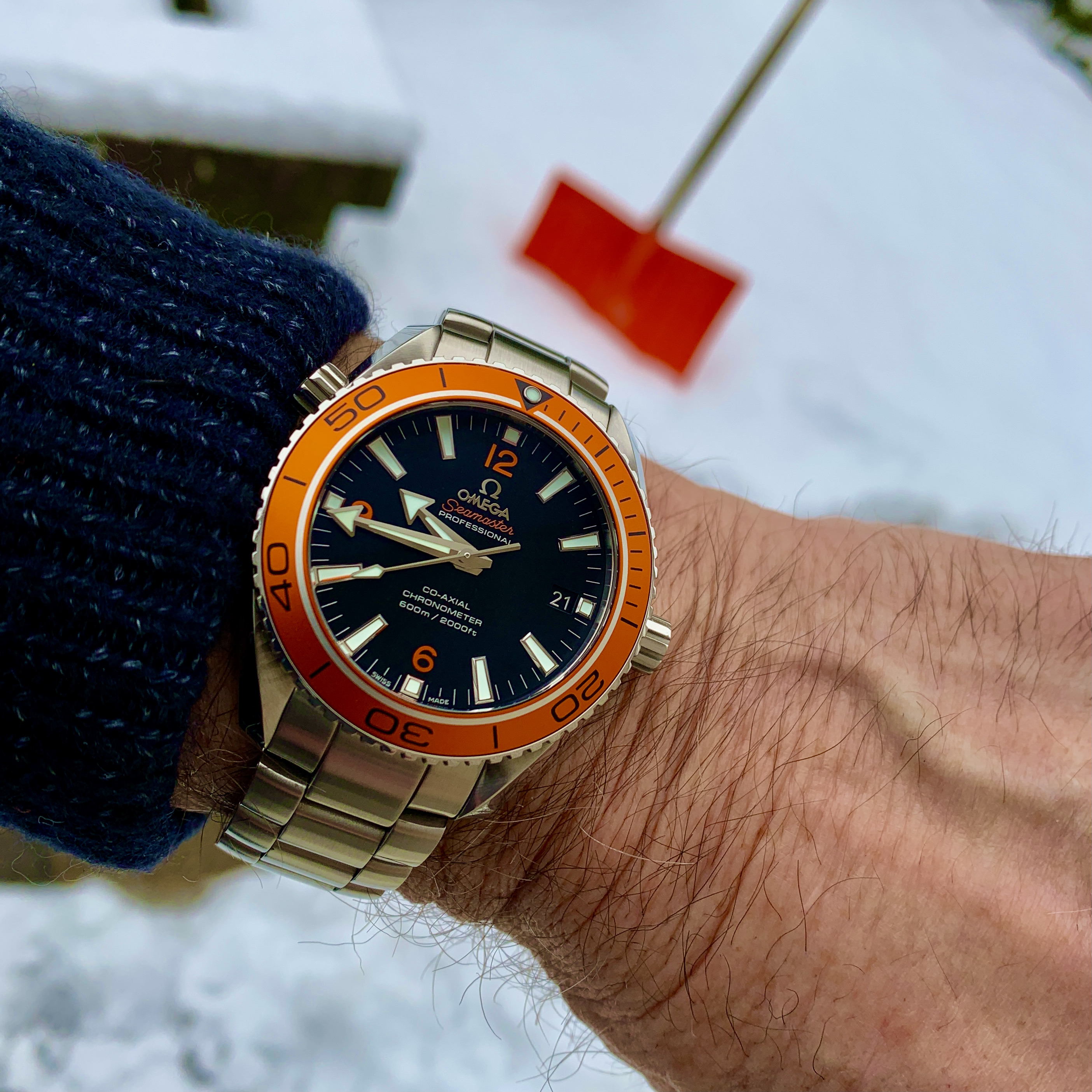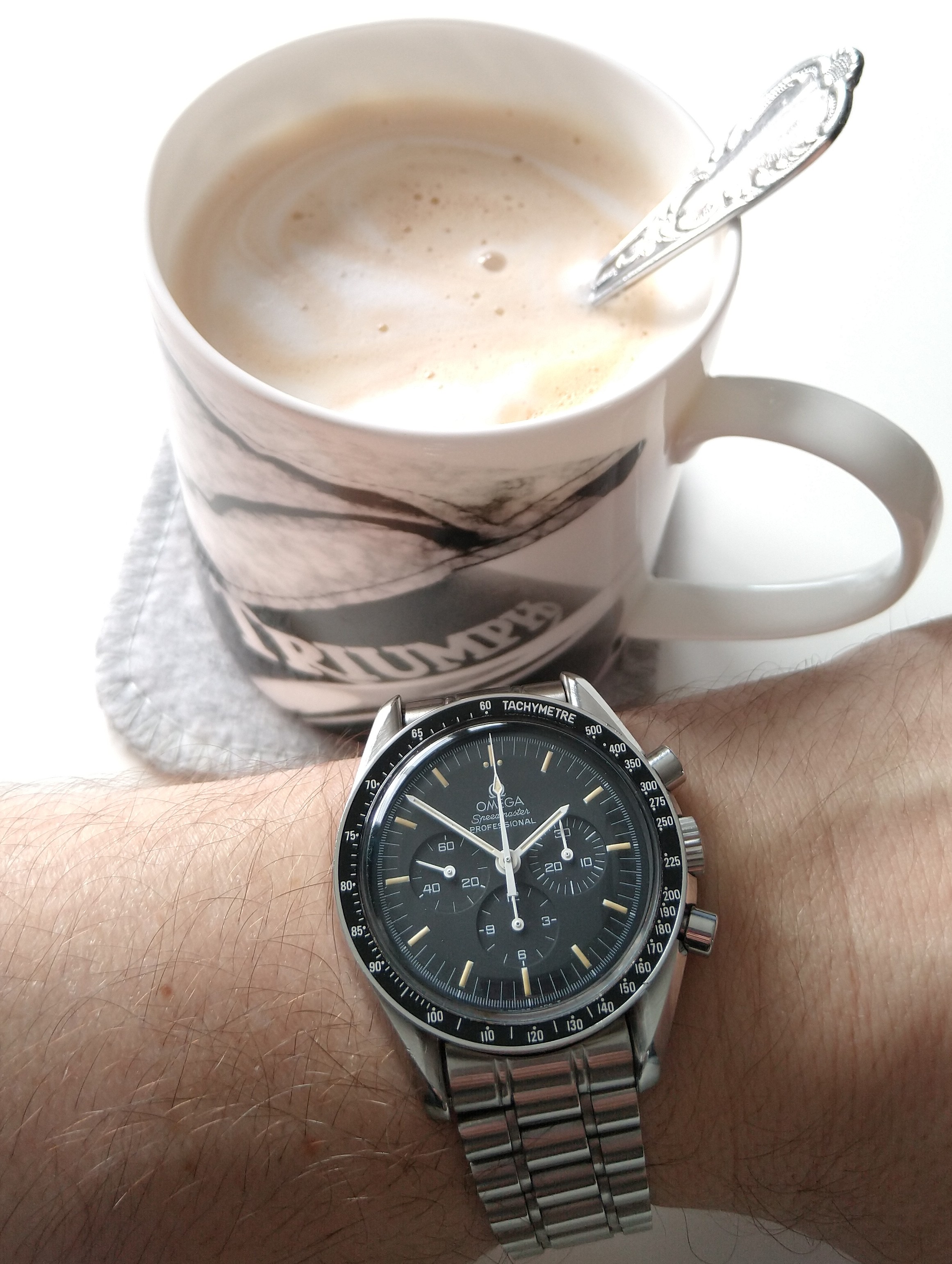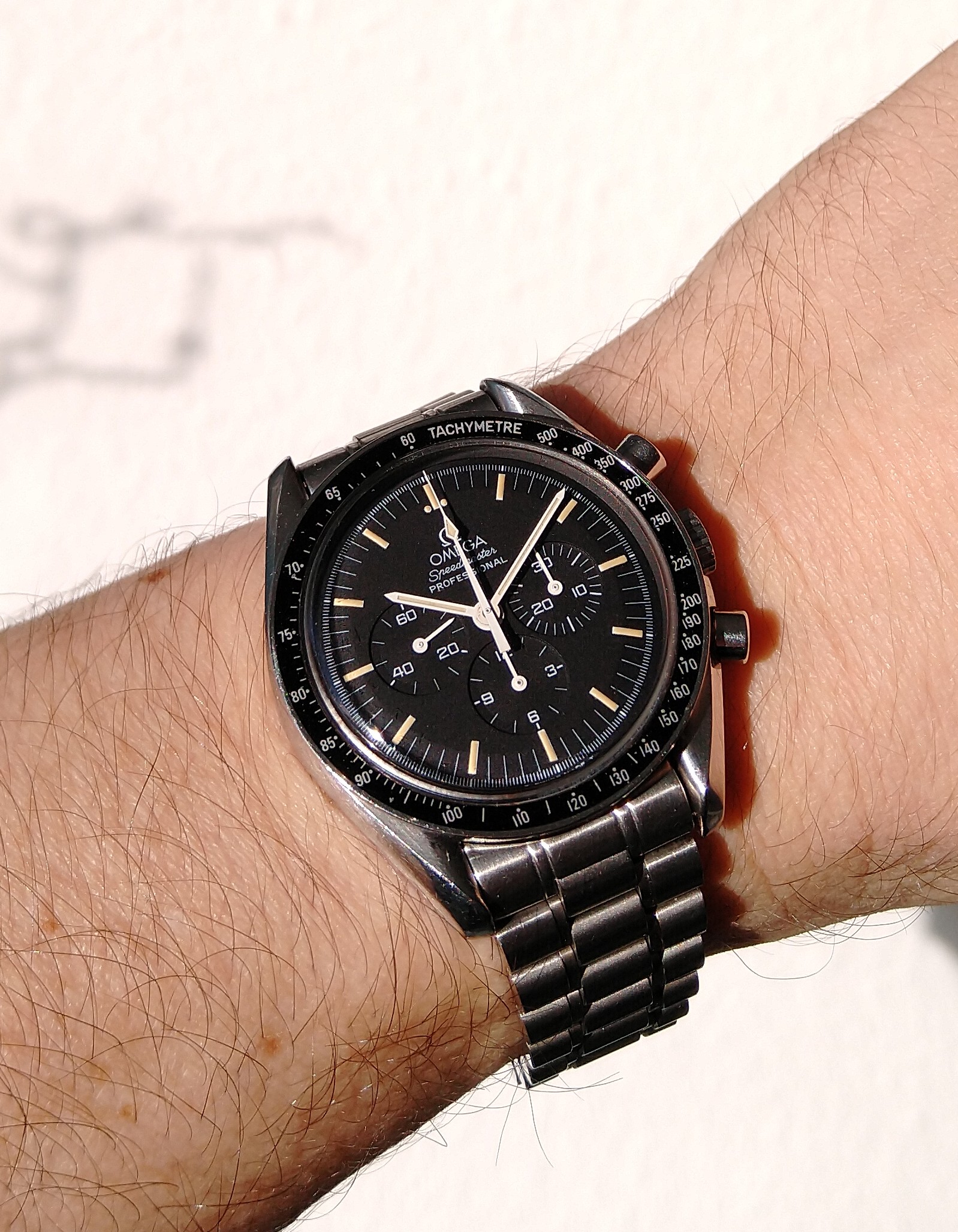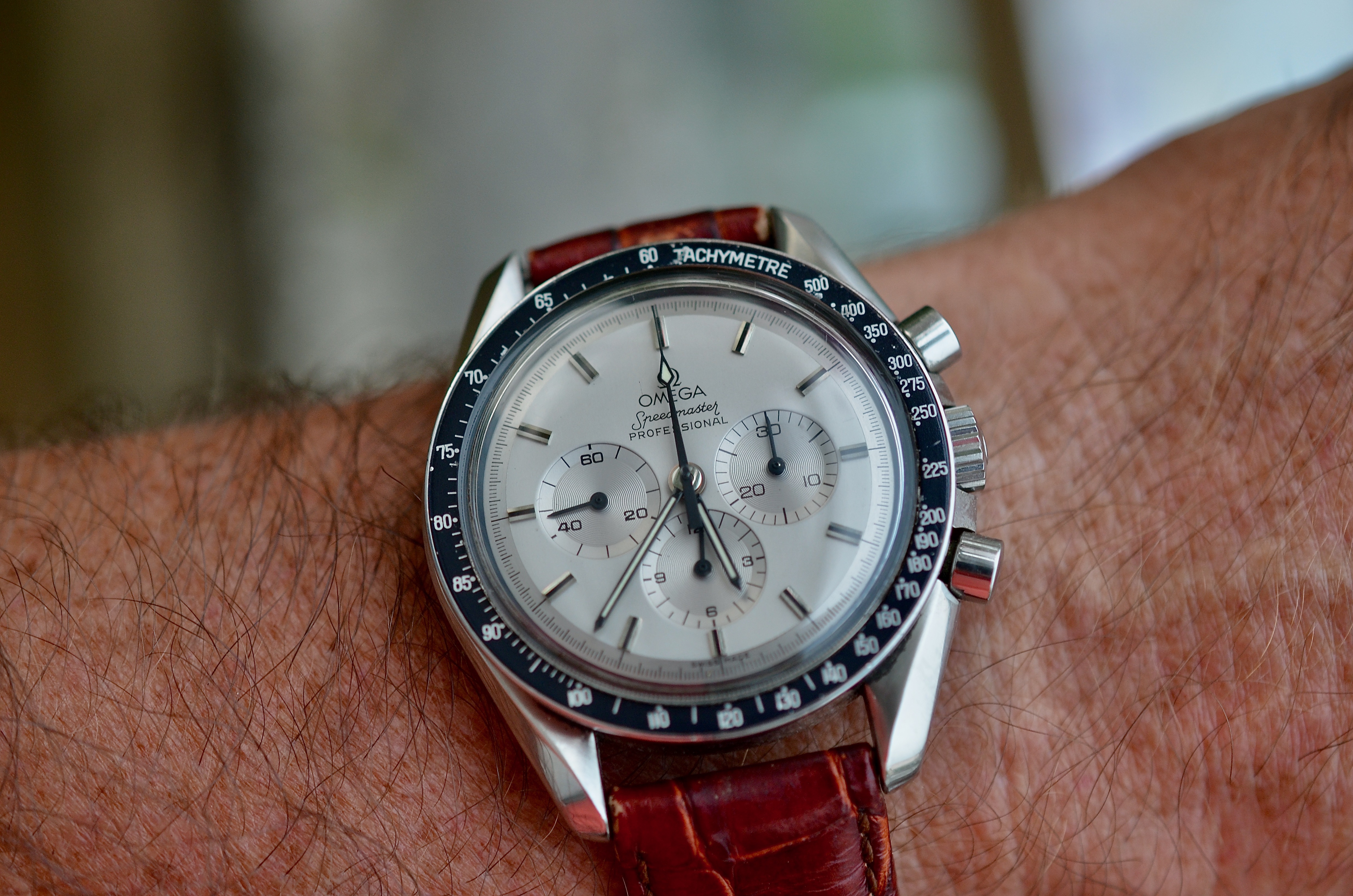 Hi, the cal 910 FMs are 43 x 52 x ~15mm with the cal 911 being at least 1mm thicker. Here it is next to my 42mm Moonwatch. The pilot case with hooded lugs has a lot of steel making it a 139g head vs the Speedy's 97g. 46% heavier! The odd thing is the FM's dial is a bit smaller. And if you disregard the contrasting white racing chapter ring, the remaining part of the dial is REALLY smaller. The hands are correspondingly shorter too. So it feels big and chucky on the wrist but the time telling part of the watch is visually smaller. Despite the busy dial, the all-white hands preserve excellent at-a-glance legibility, imo. I personally luv the watch’s character and it's become one of the anchors of my collection…YaY!