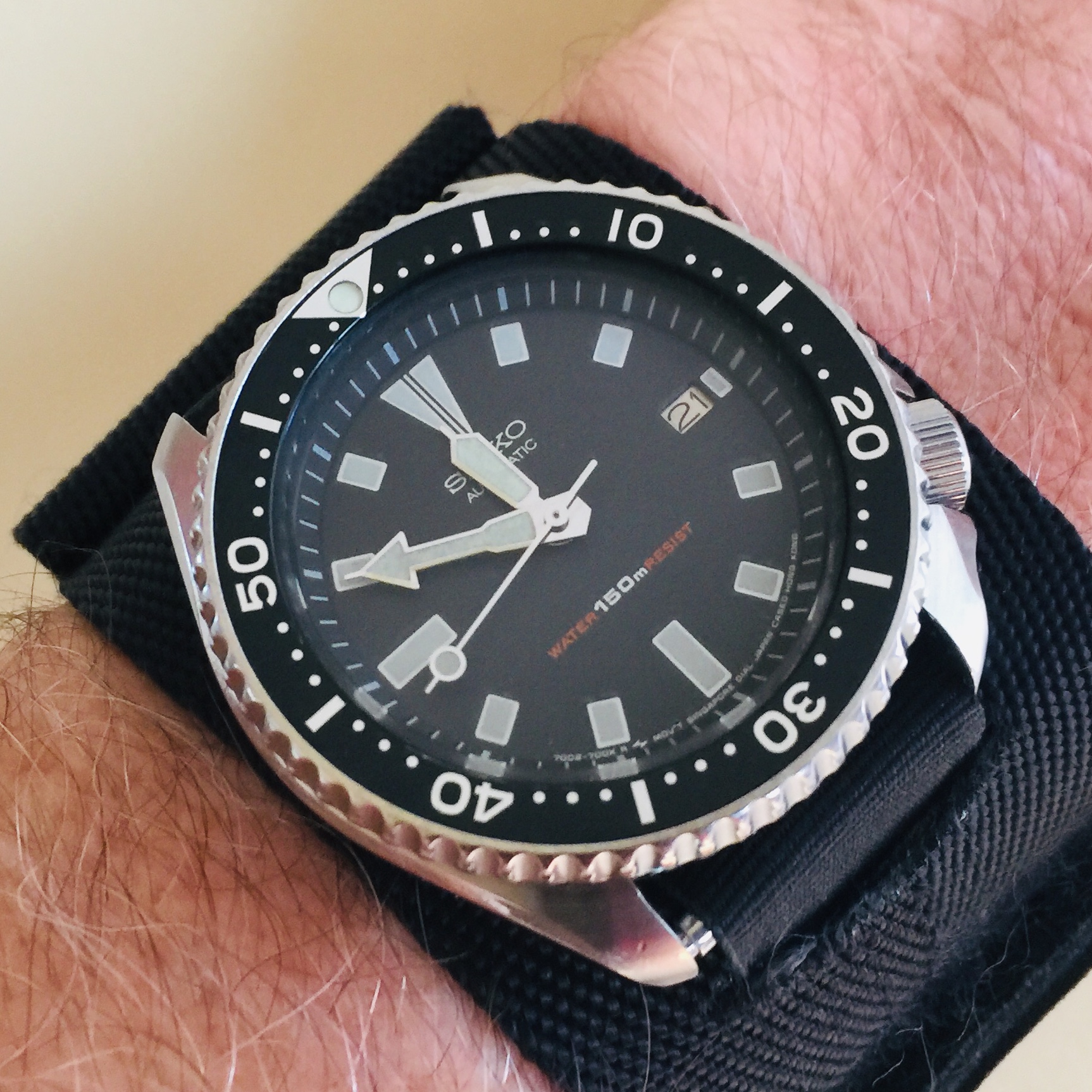 Day two wearing the recently gifted Seiko 7002-7009 automatic from 1991...but I’m sort of worried about messing up the almost flawless bezel insert...no worries...Rothco protective band to the rescue...