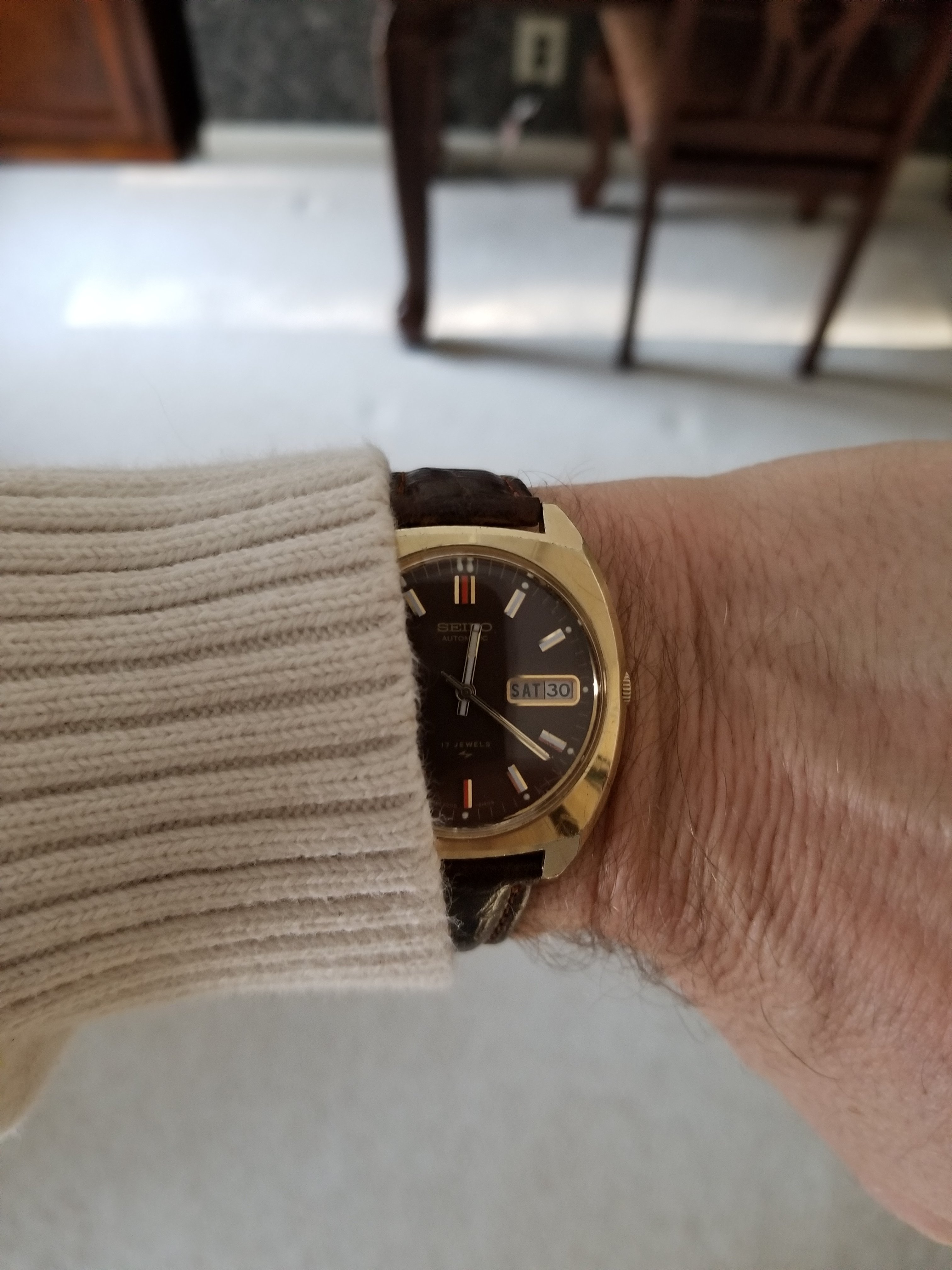 I bought this Seiko in an antique shop for $5.00 over a year ago. Luckily for me, it keeps perfect time and the owner didn't realize how much you guys would pay for a chocolate dial.