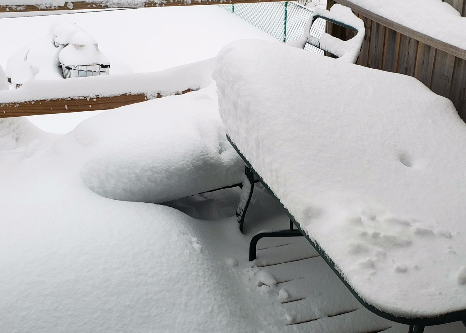 By the way, guess what today's weather is like? Behind the table is a full length lawn chair!
