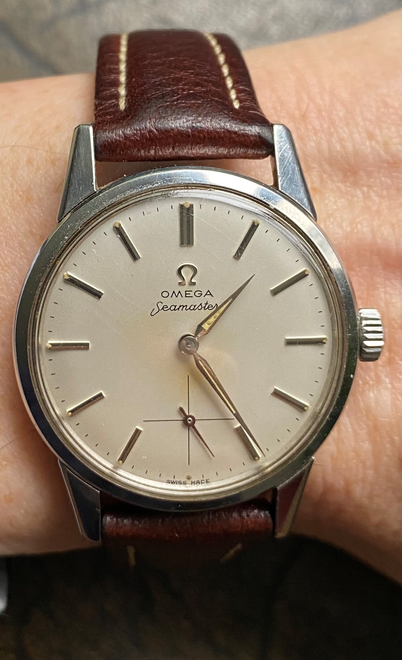 New arrival from last Friday - 1962 Seamaster manual wind Cal 268. Appears to be all original and intact and came with the bill of sales and Omega warranty card from '62.
