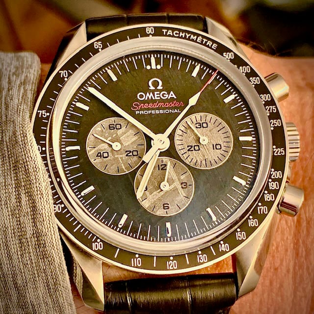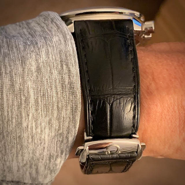 The watch was originally sold with a standard stainless steel Speedmaster bracelet. I thought the stainless steel looked a bit pedestrian for such a unique watch and decided to jazz it up with an OEM black crocodile strap and stainless steel deployant buckle. Now it's difficult for me to imagine the watch with anything other than this strap.