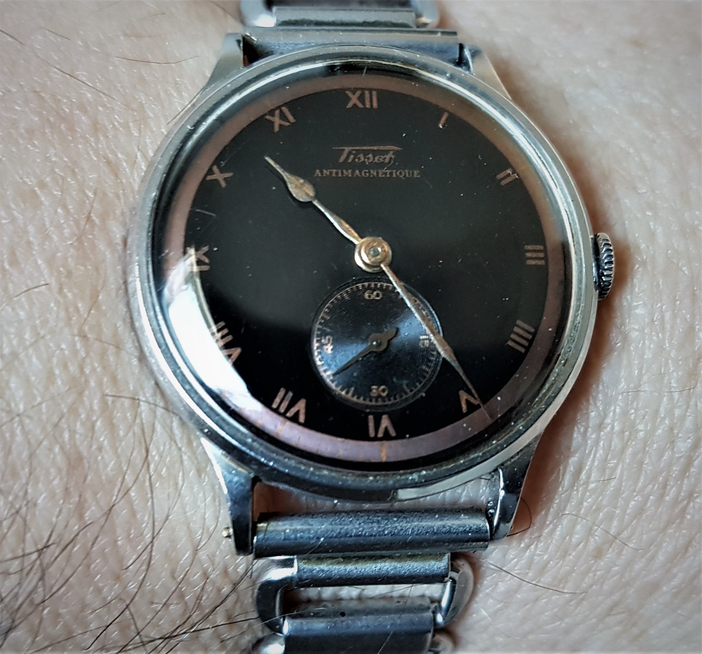charcoal sunburst dial, sometimes color of the dial changes to a dark grey-brownish tone.