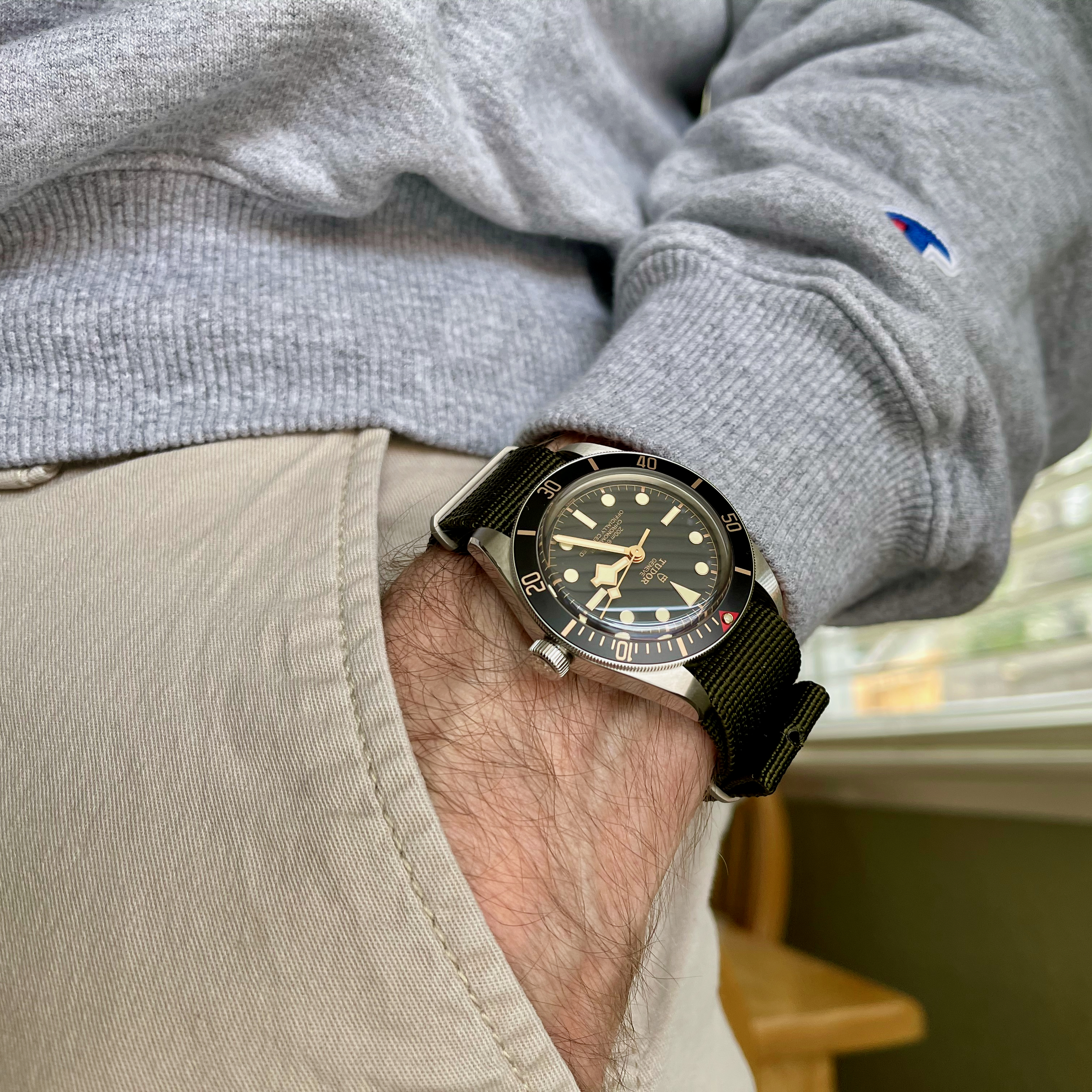 Black Bay 58 recent acquisition. My first Tudor. As others have already said before, it's a much nicer watch in the metal than pictures or videos can show. Tried the blue and the black on side by side, and the black was an easy no-brainer. Wearing it on a TimeFactors dark green nato. Have never had a lot of love for snowflake hands, so that's a work in progress! But the rest is kind of blowing me away.