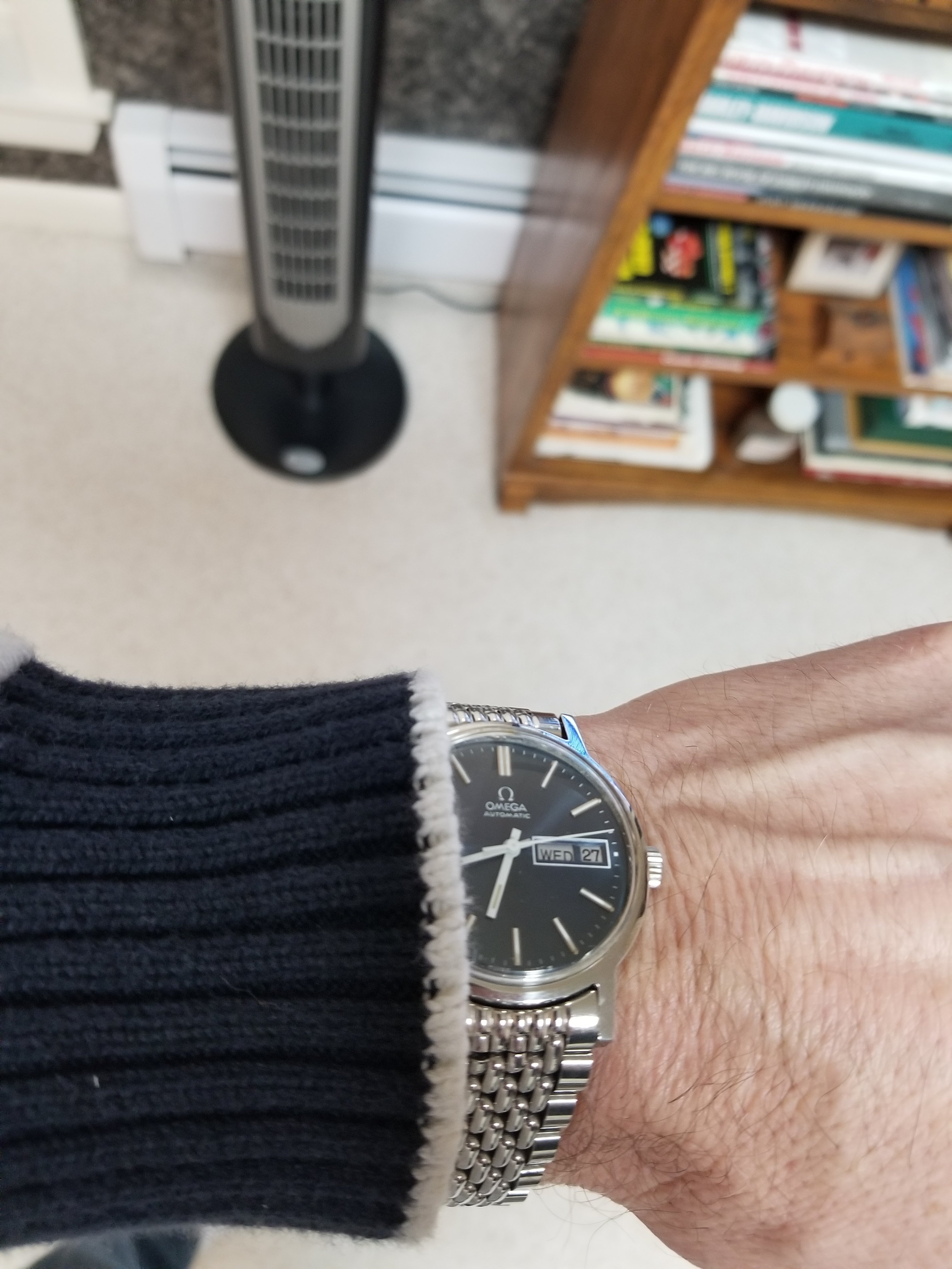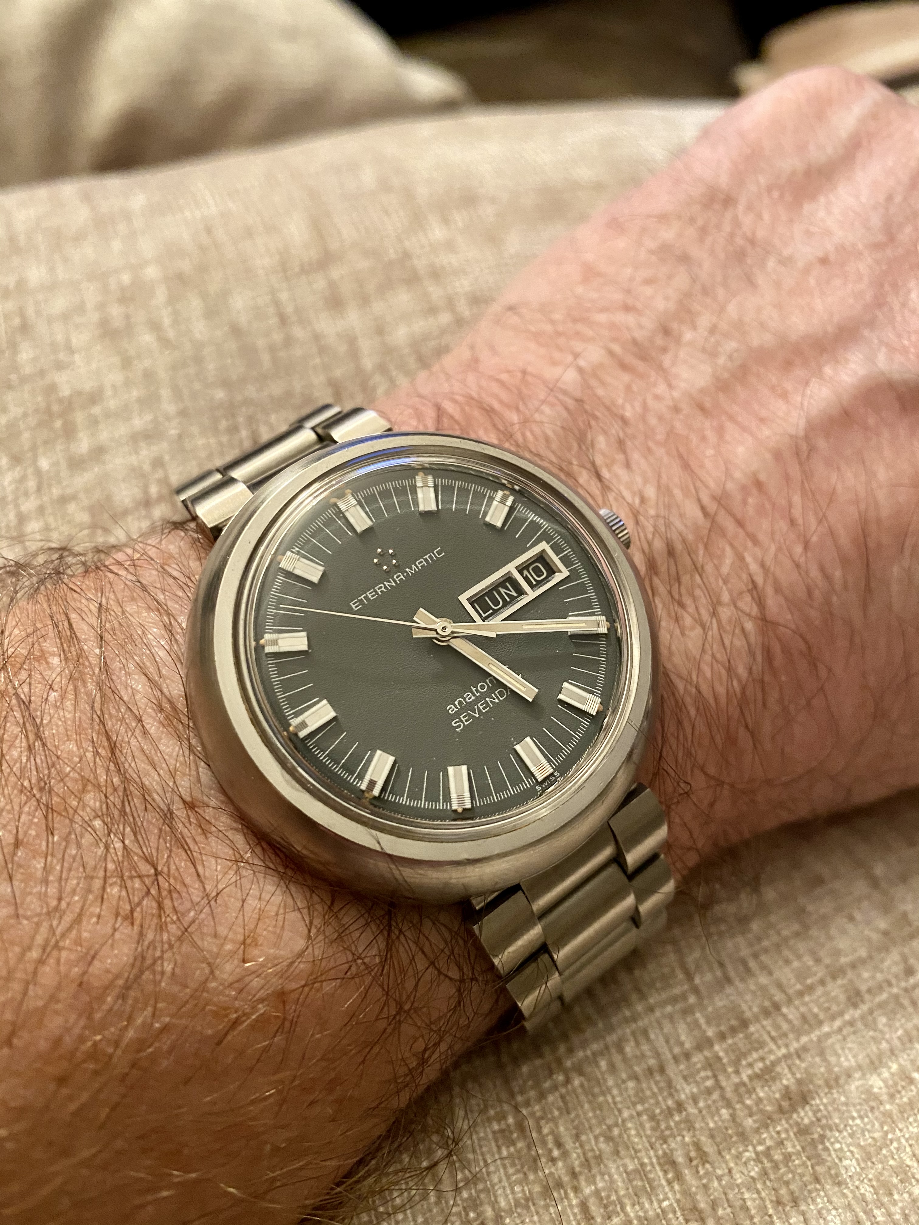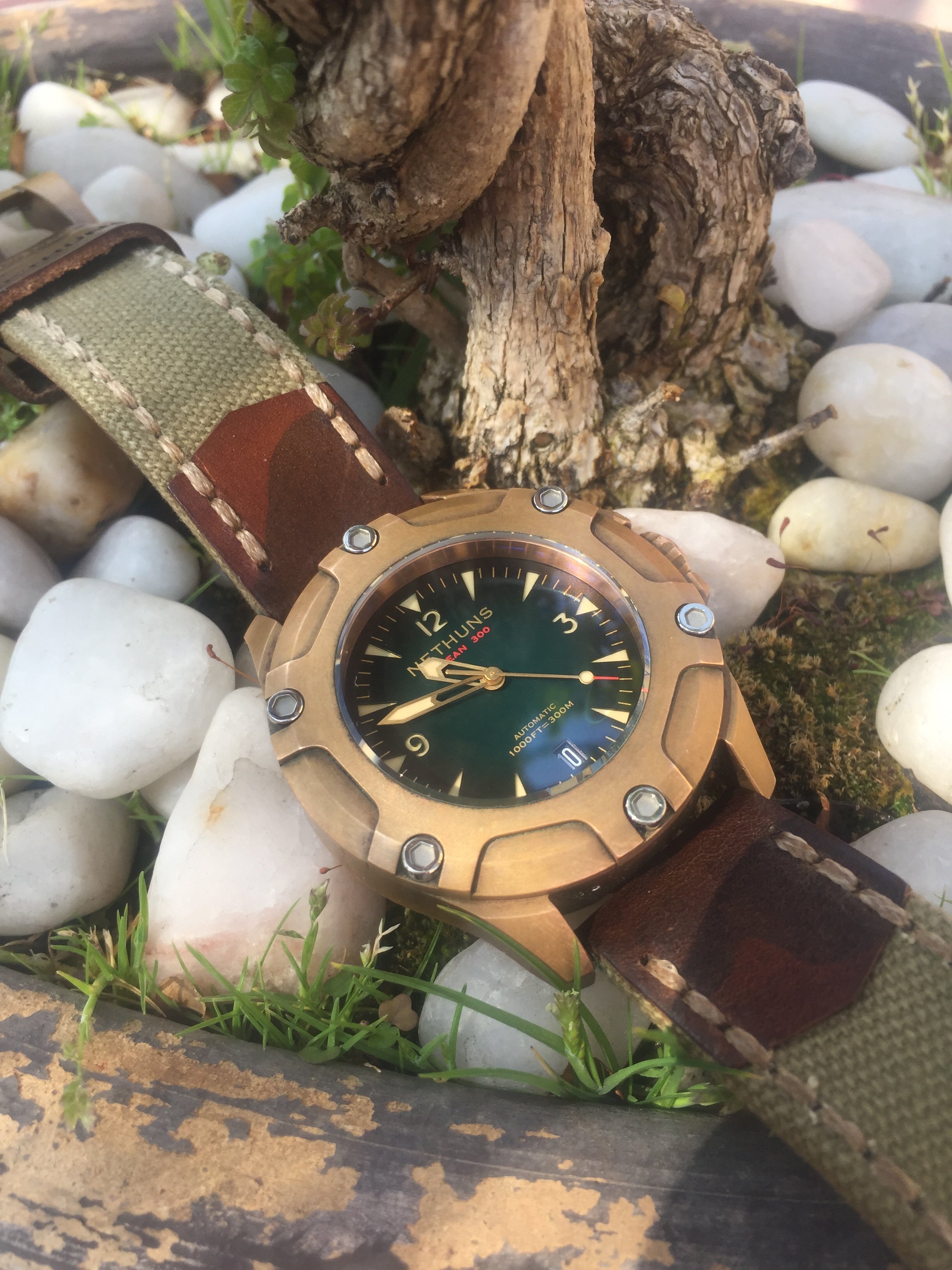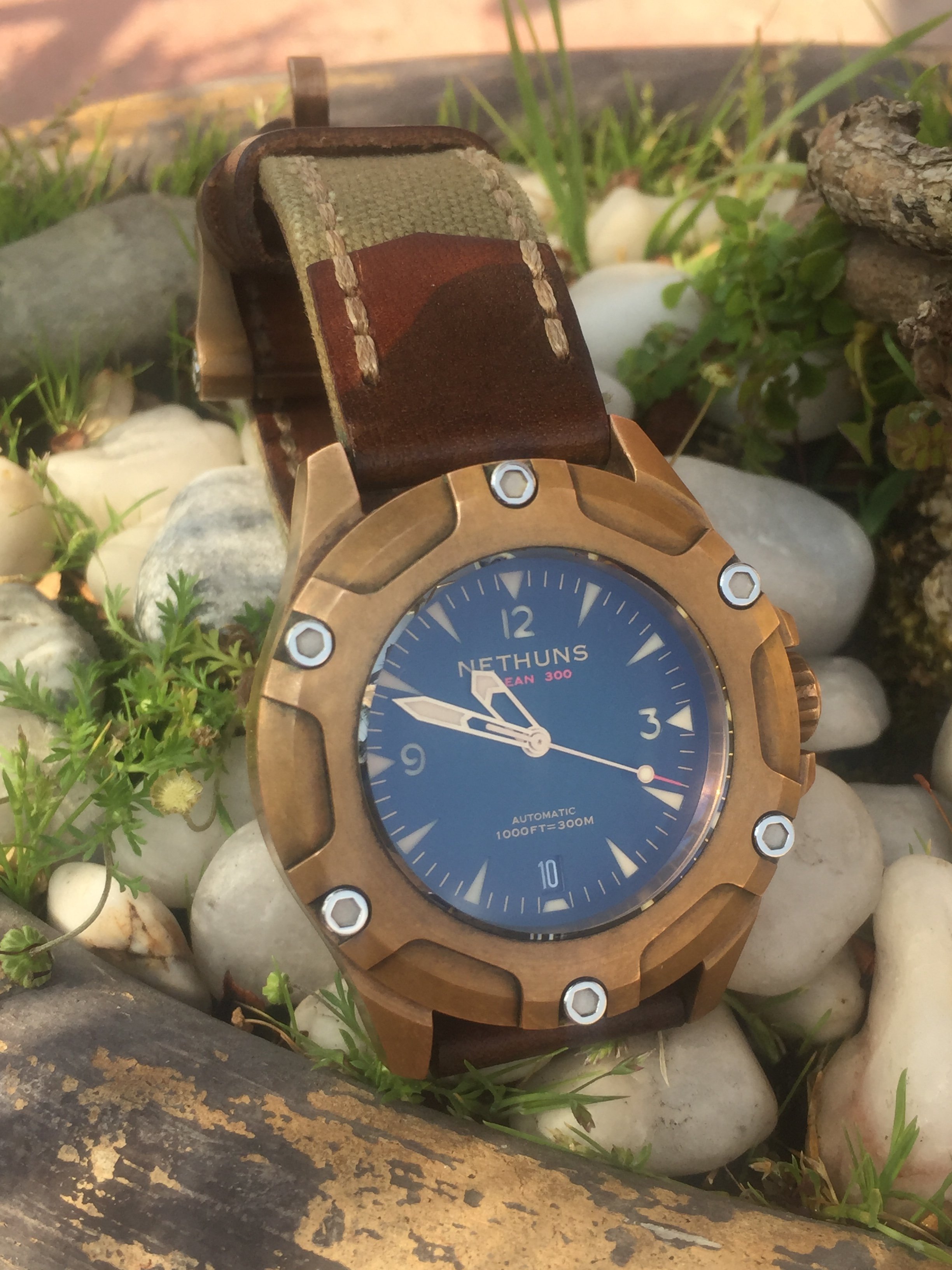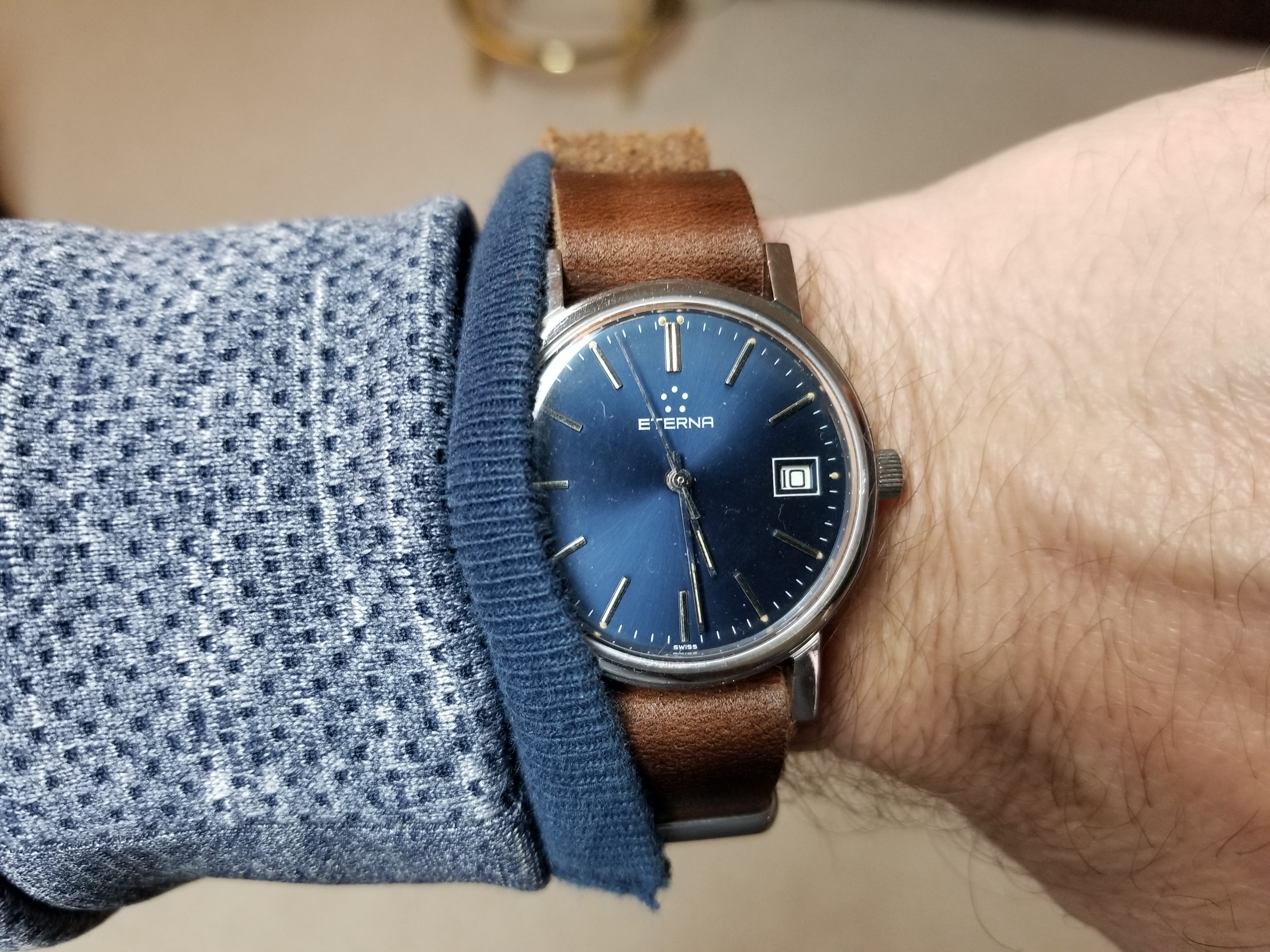 Recently my wife told me that she liked blue dialed watches on brown leather straps. I had been wanting a "cigar" colored Nato strap anyway, so this seemed like the perfect time. Well,it came today, so I put my Eterna on it. I don't intend to leave this watch on this strap long term, as I believe the metal hands make the watch too dressy. I intend to put the blue dialed Omega, with white plastic hands, which I believe make it more casual on this strap. But right now, it is at my watchmaker's getting a service and a new crystal. So, for now, this will have to do and I will find out later this evening if a blue dial watch on a brown leather strap makes me more attractive and irresistible. 馃う馃え馃槤.