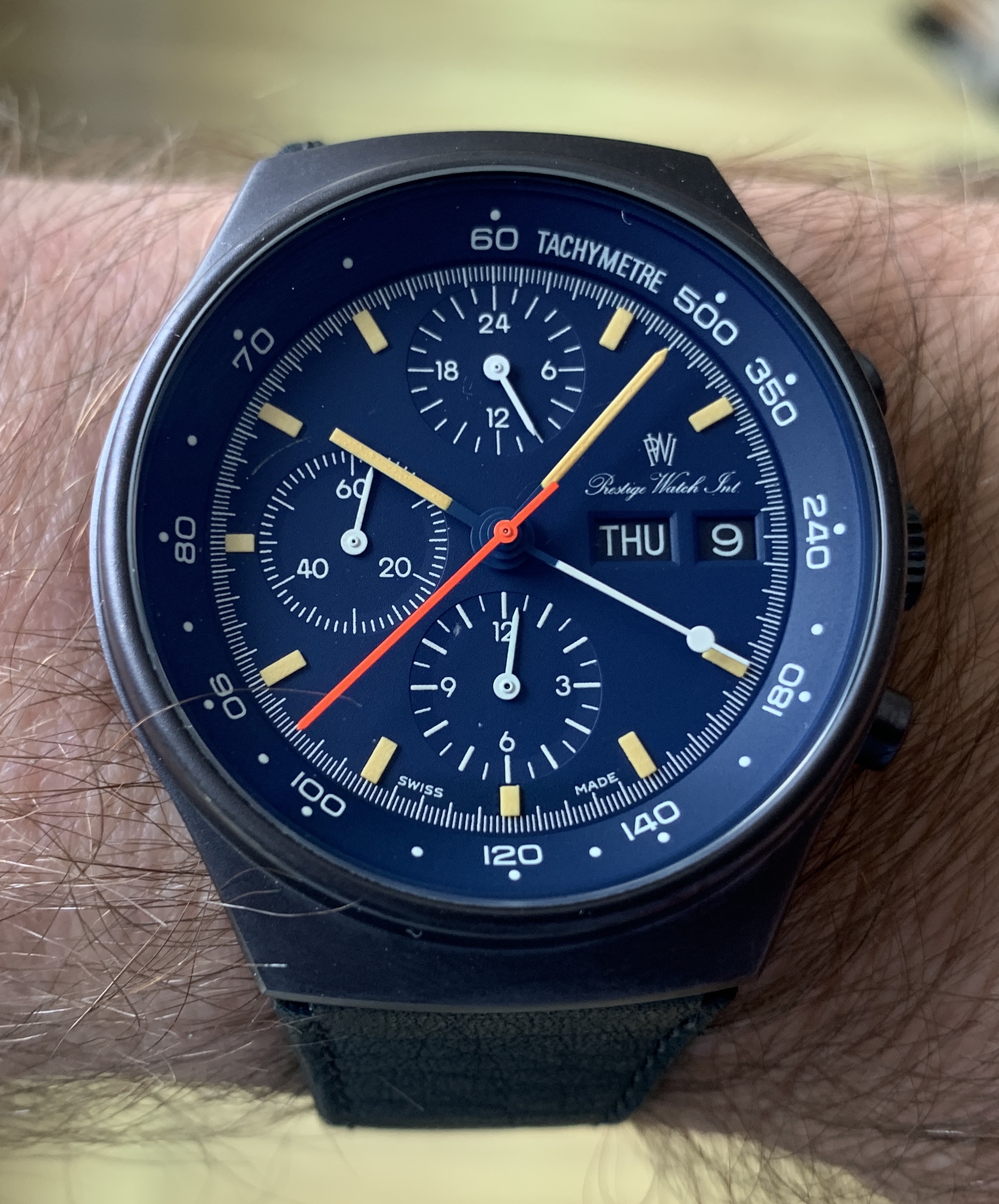 Posts 1,161 Likes 6,810 timjohn ·Feb 10, 2021 New acquisition: Prestige Watch International -- one of the offspring of the Orfina/Porsche Design collaboration with a Lemania 5100 and central minutes counter. And I think it is on the original dark blue strap with a PWI clasp
