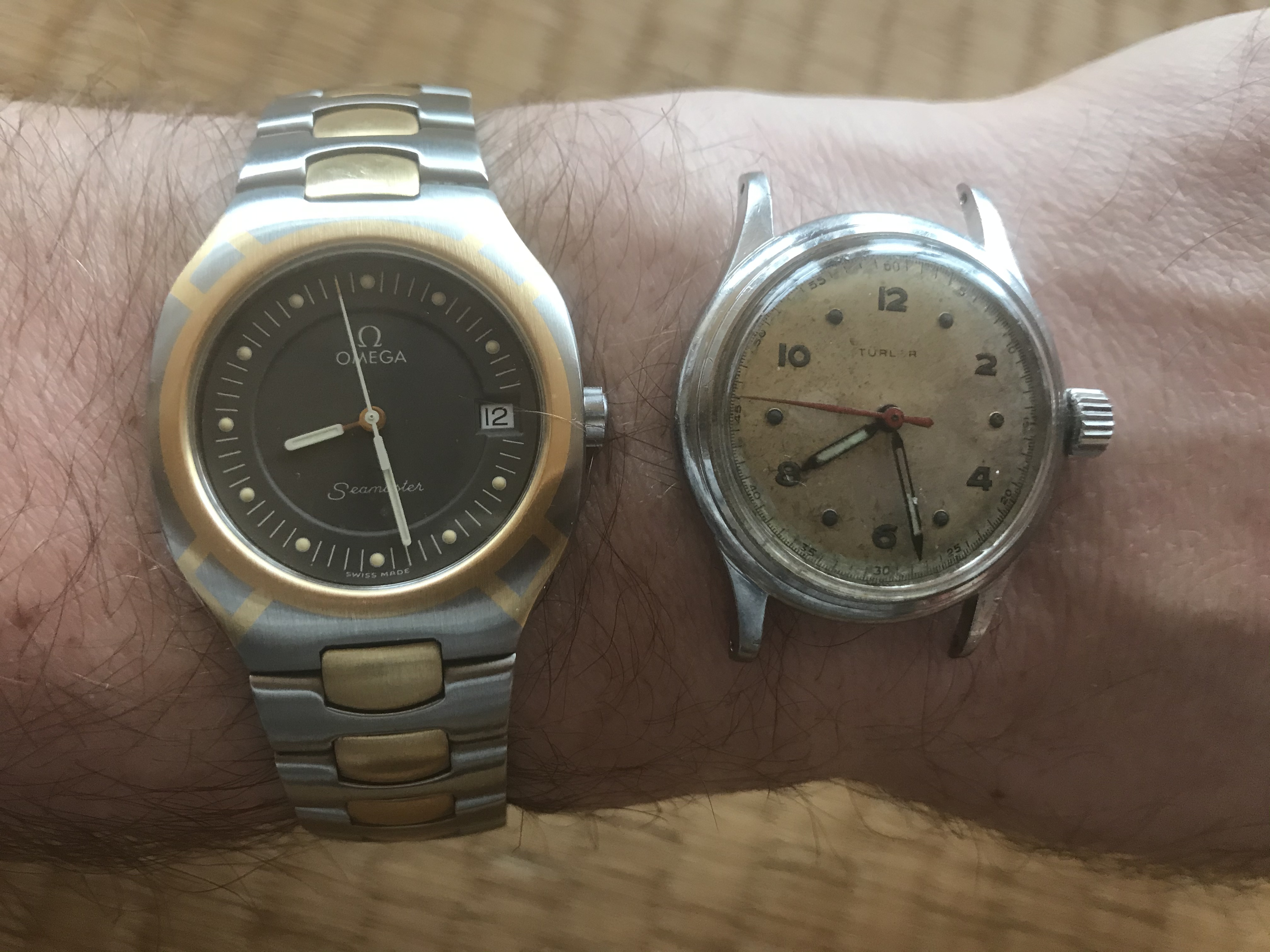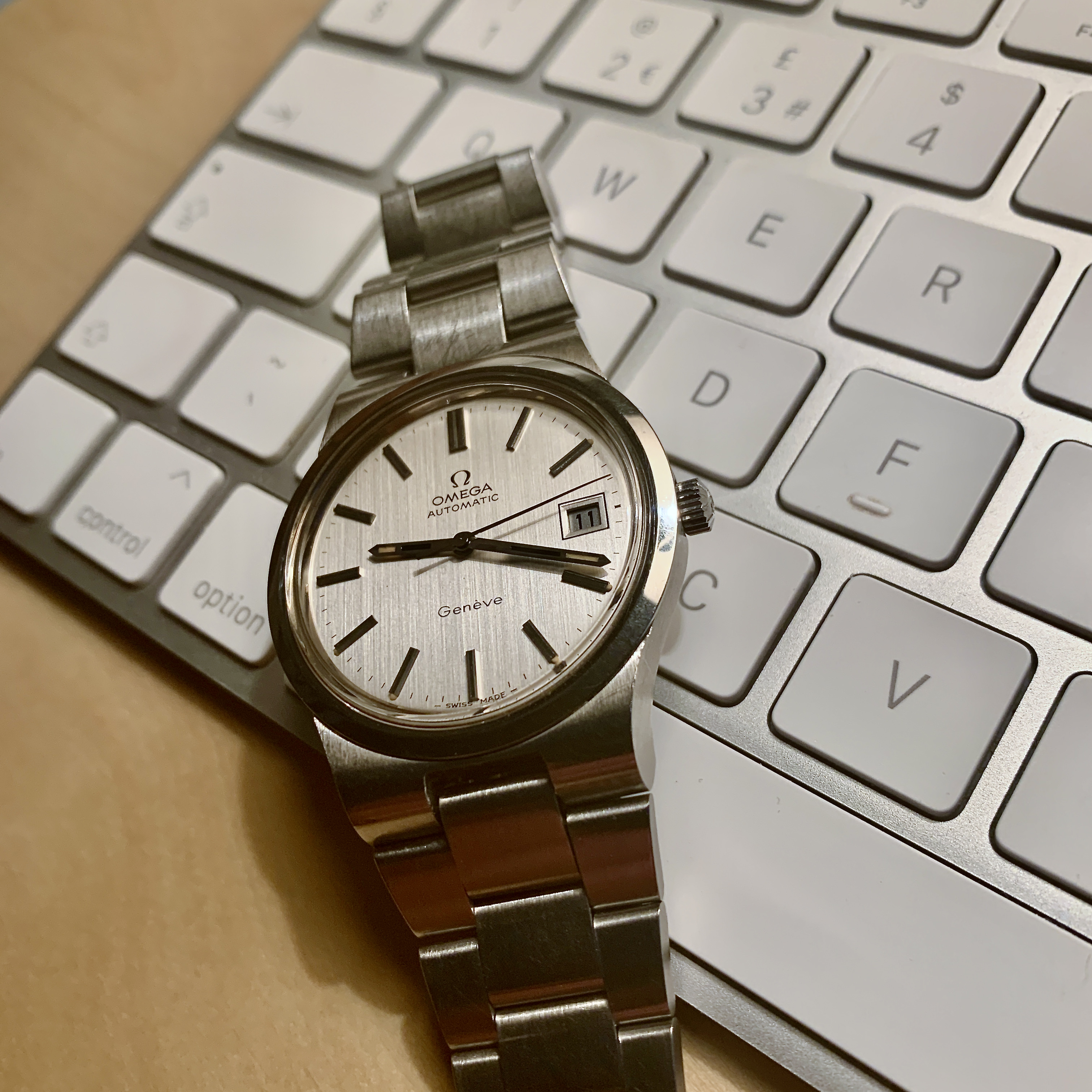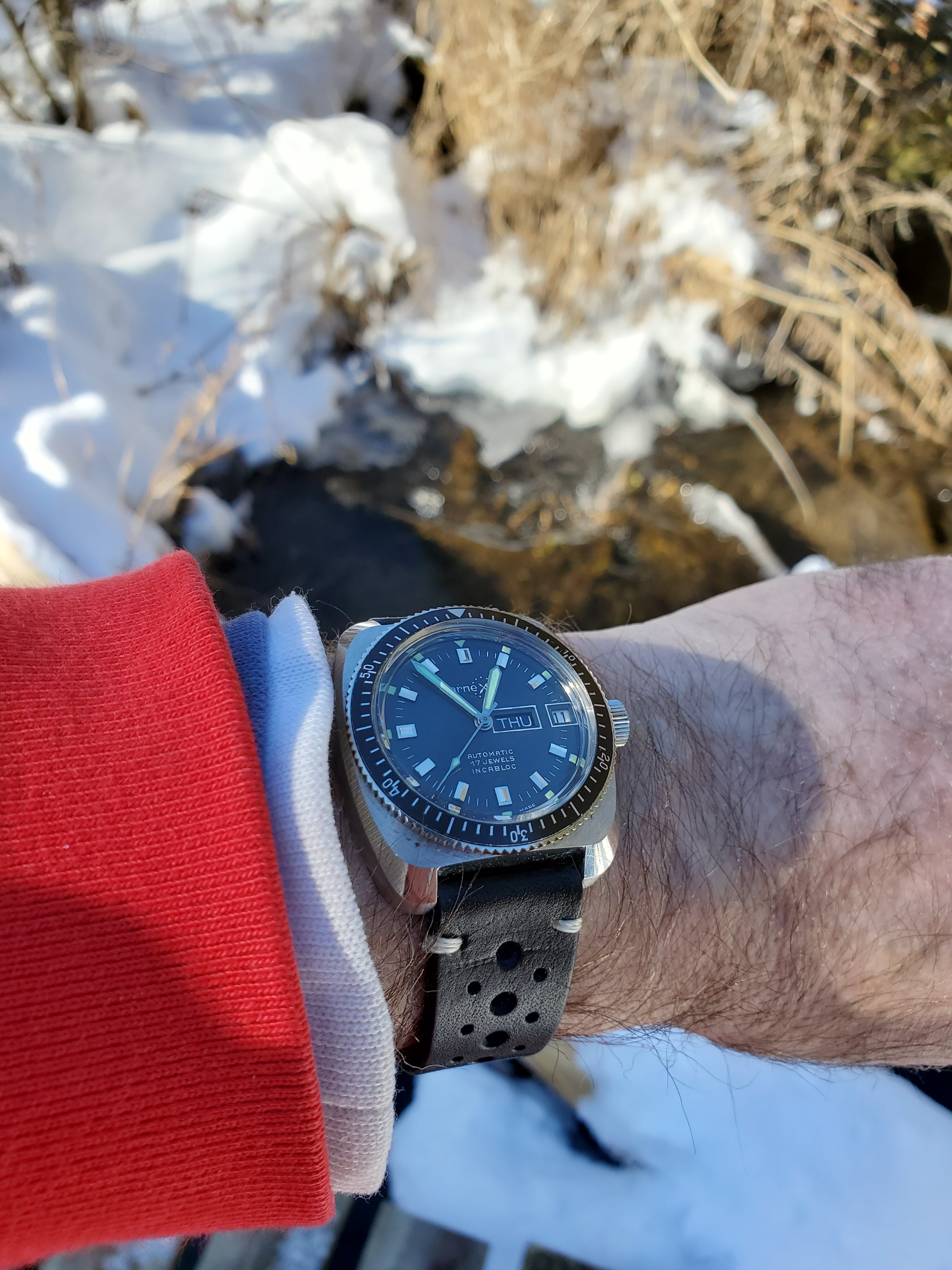 ··Not in LA anymore.First day wearing this watch, the culmination of a multi-year search for a birth-year watch. This was an eBay find and I ended up paying a price that was closer to my bid limit than I would have liked. The watch has a 14k gold-filled case with an engraving on the back -- characteristics that I figured would be a turn-off for most prospective buyers. The seller's photos were appalling in quality, which made the purchase feel riskier than it needed to feel. But, the deed is done and the watch ended up being much more attractive in appearance than the eBay photos suggested. This watch runs on a Calibre 500, typical of that era for an Omega automatic.