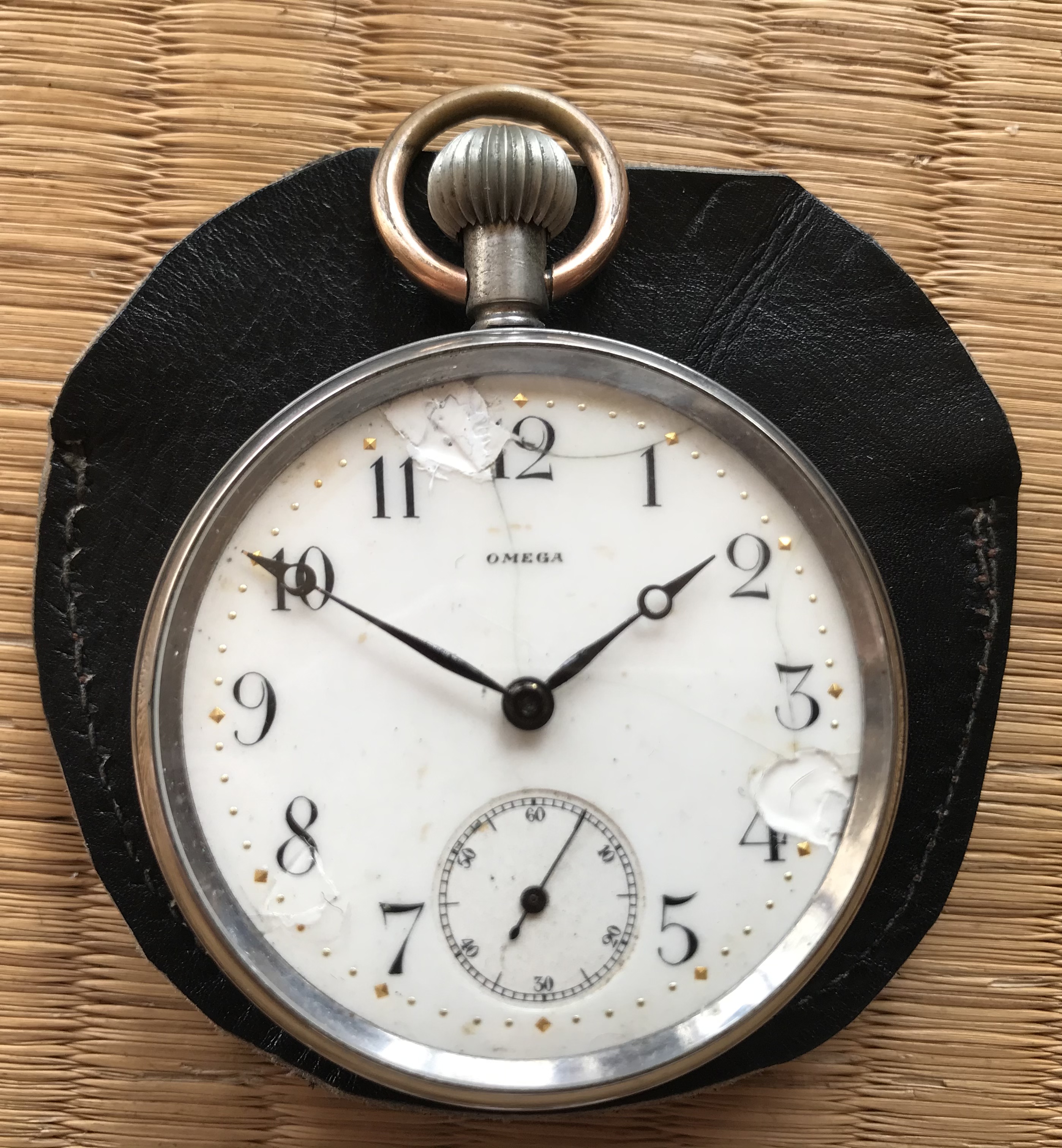 E Howard, “N” sized (a bit bigger than 18-size), series VII, 15-jewel, “Stag” grade (Howard’s best, produced in Boston in 1884), in its original gold filled hunter case by H Muhr & Son, complete with original matching case paper. Original single-sunk vitreous enamel dial and original blued steel “beetle & poker” hands. The arrow points at the engraved image of a stag. Howard had three grades. “Hound”, “horse”, and “stag” for their railroad grade watches.