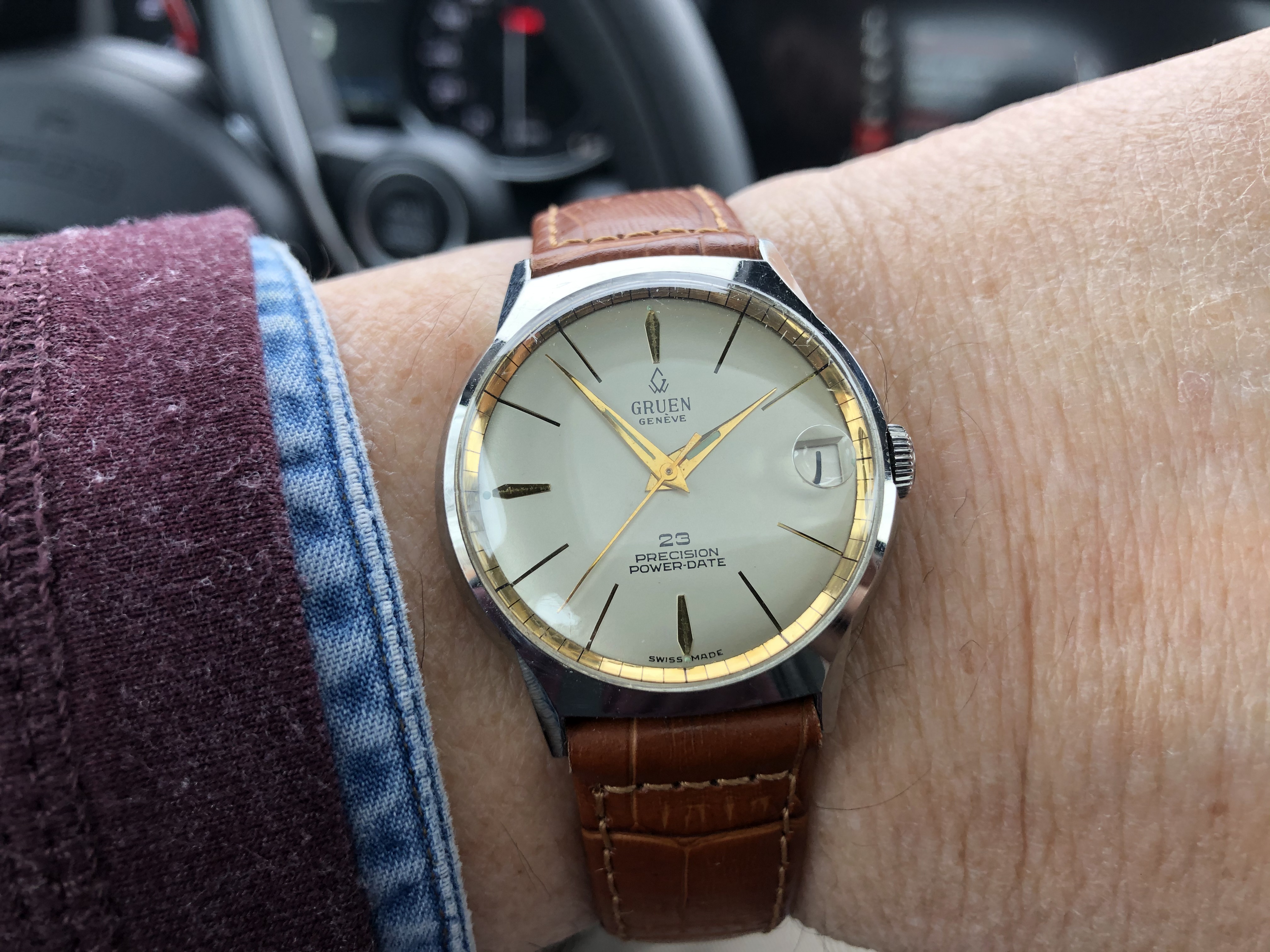 I’ve been wearing two manual wind Durowe-based wrist watches for several weeks. But it is a nuisance remembering to wind them. I was inspired by @allwoundup ’s recent post showing his Gruen self-winder. Why not, thought I? So I dug out my late 1950s Gruen self-winder (also a German-made Durowe movement), with 23 jewels. Years ago, I had offered this one for sale, but everybody who saw it, did me a favour! They didn’t buy it. The case is a 14-karat gold shell over stainless steel, with a 14-karat bezel. I stumbled onto it several months ago, in a box I use for dead storage. So it resurrected it, did what was necessary, added a new bracelet, and here we are.